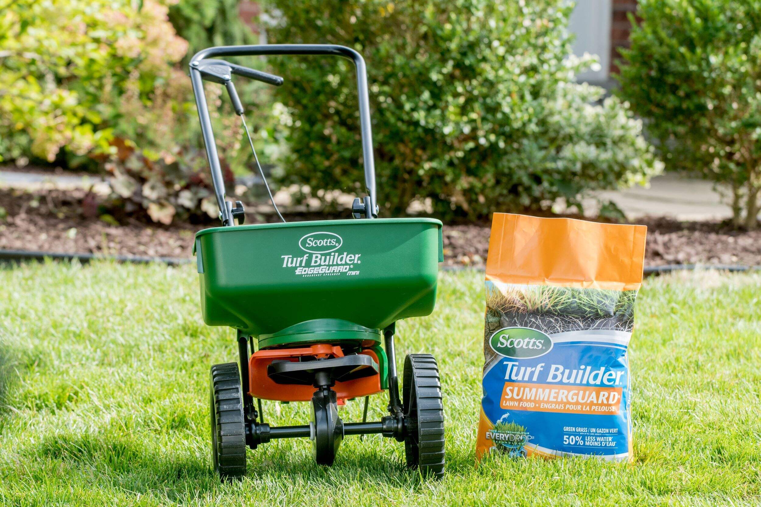 Scotts Turf Builder Summer Guard Fertilizer 34-0-0 grows thick, green grass all Summer with 50% less water.