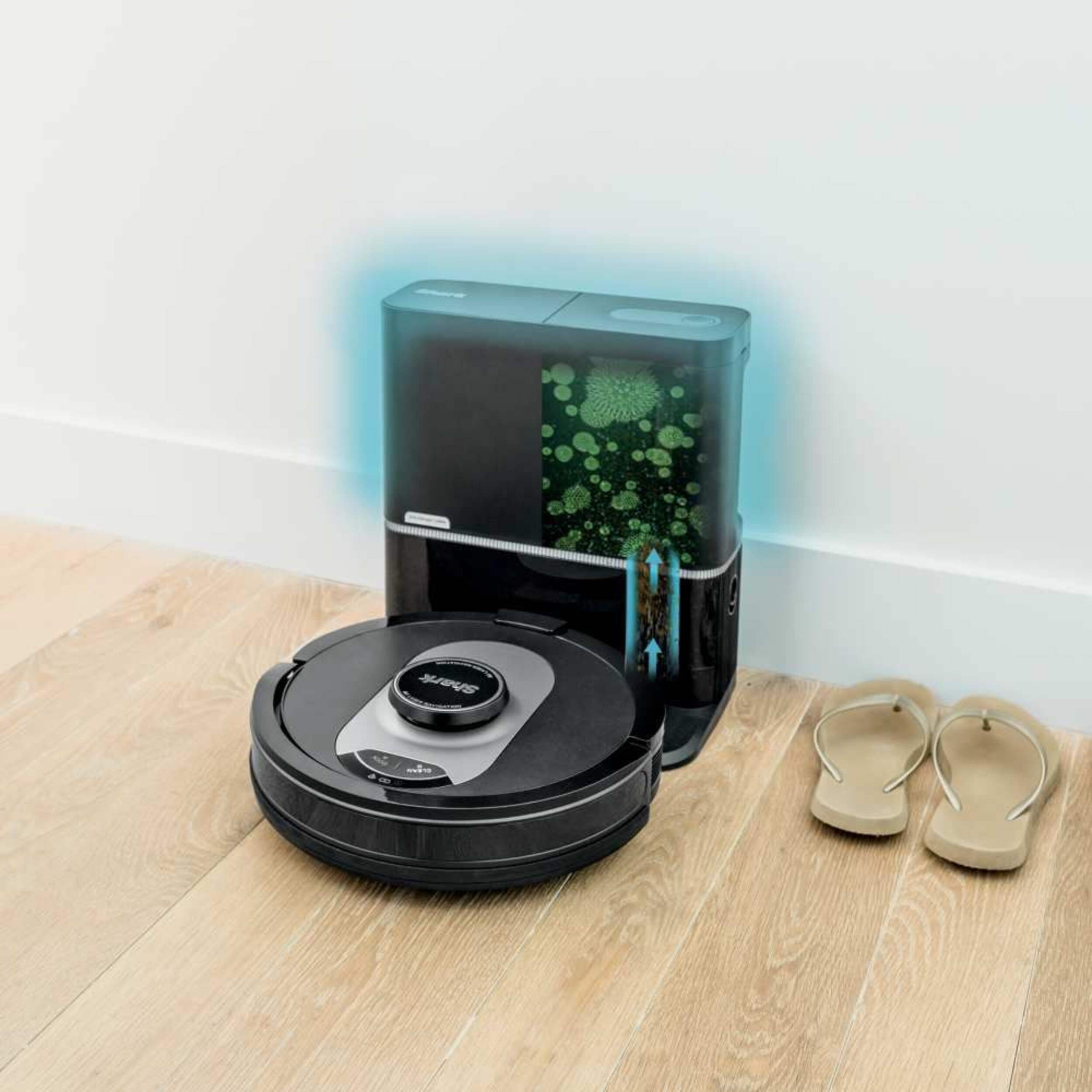Bagless, self-emptying base holds up to 60 days of dirt and debris