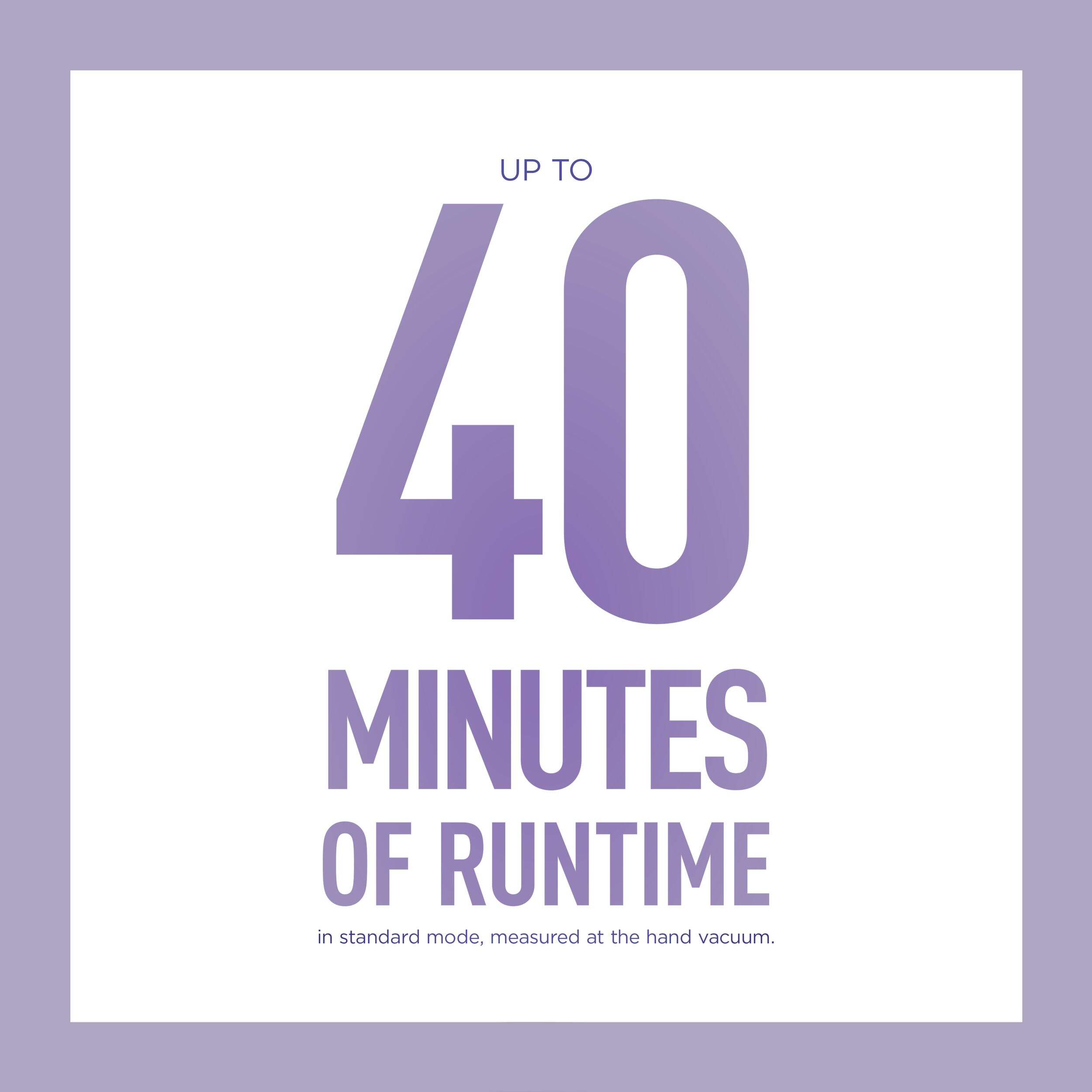 Up to 40 minutes of runtime measured at the hand vacuum in standard mode, without accessories