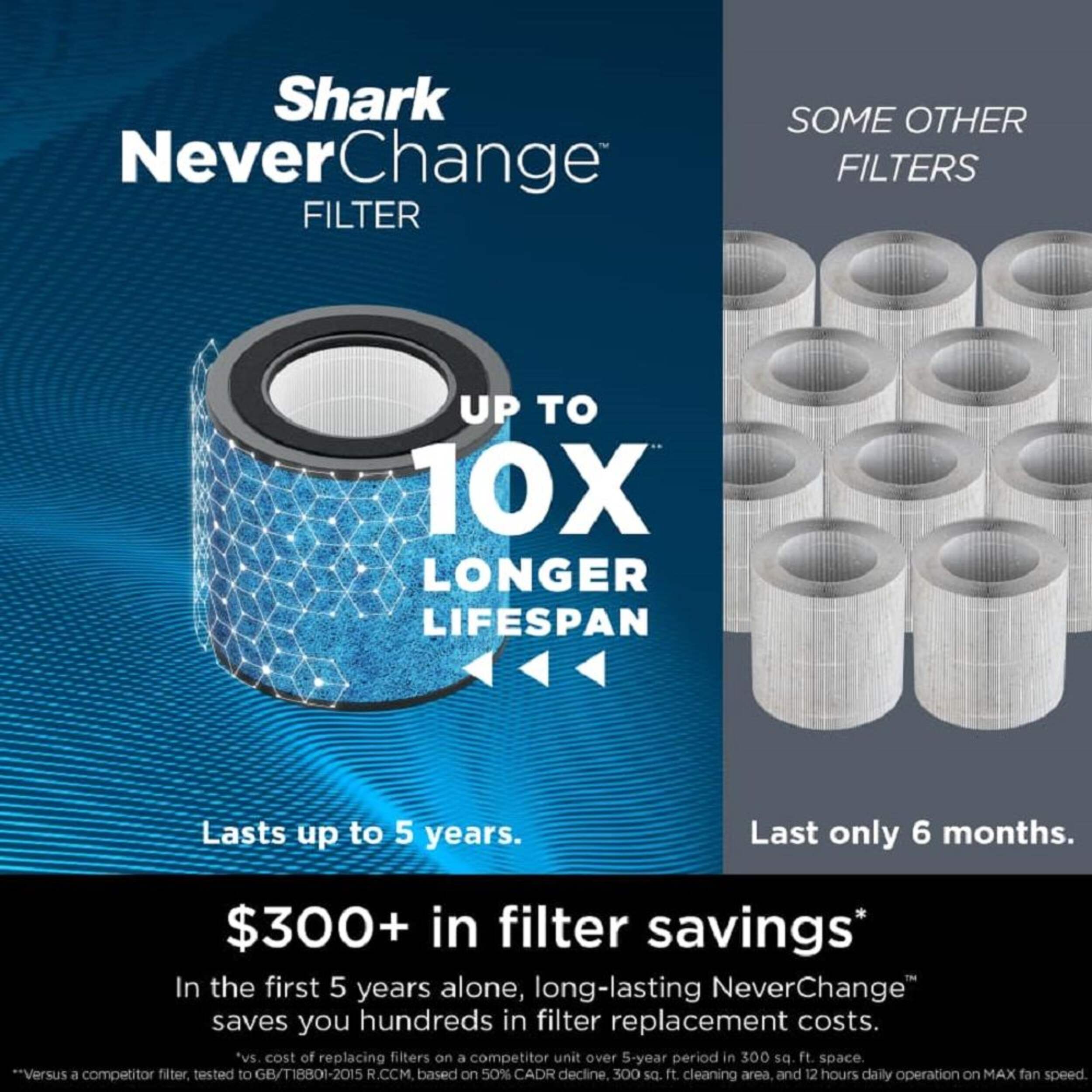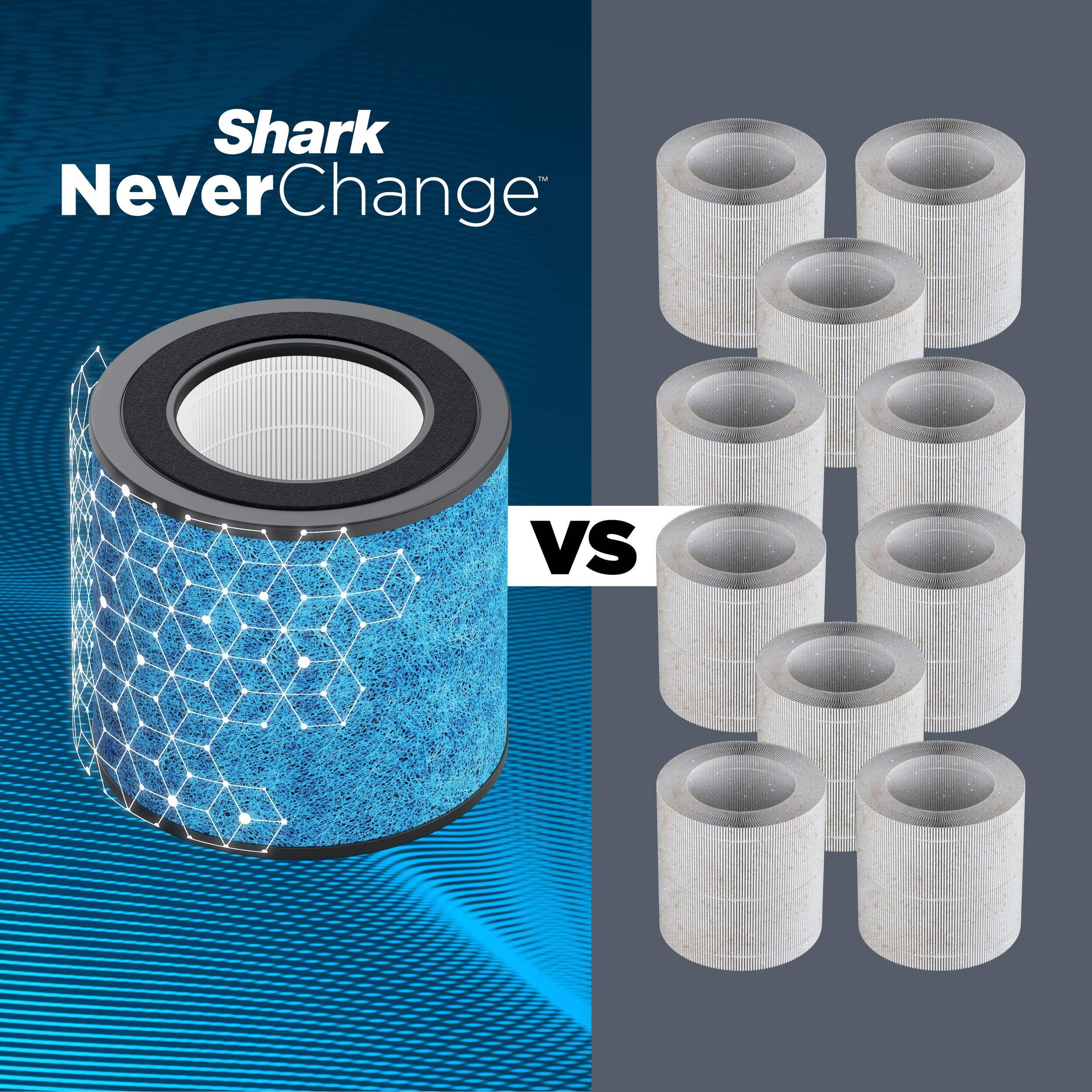 The Shark NeverChange™ Air Purifier, designed for 10x longer filter life than standard air purifiers, can save $300 or more in filter replacement costs over 5 years. This compact, tabletop unit covers up to 650 sq. ft/60m2 for powerful purification of small living spaces. HEPA filtration and Odour Neutralizer Technology combine to remove harmful allergens and airborne irritants, and guard against odours in your home.