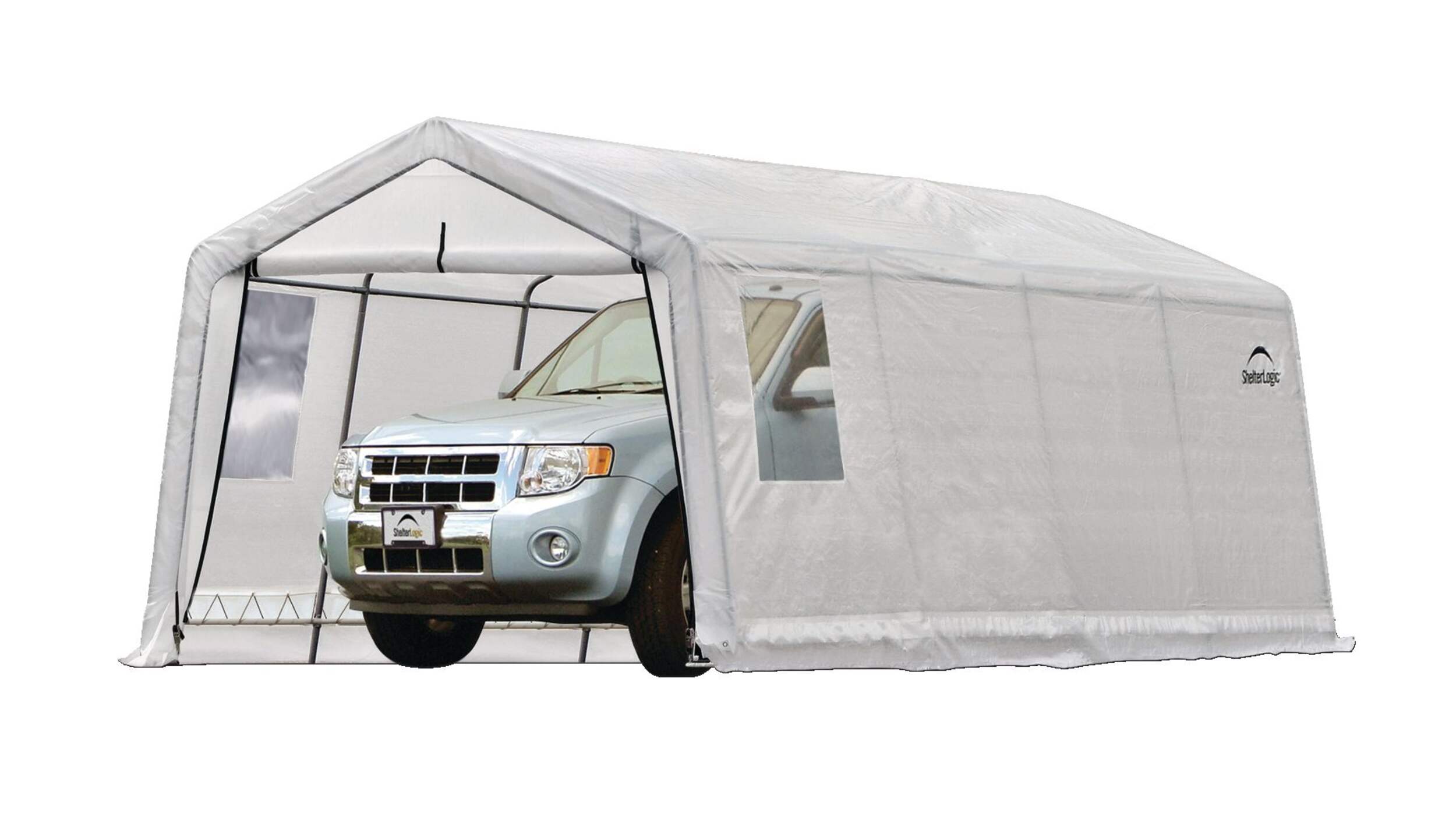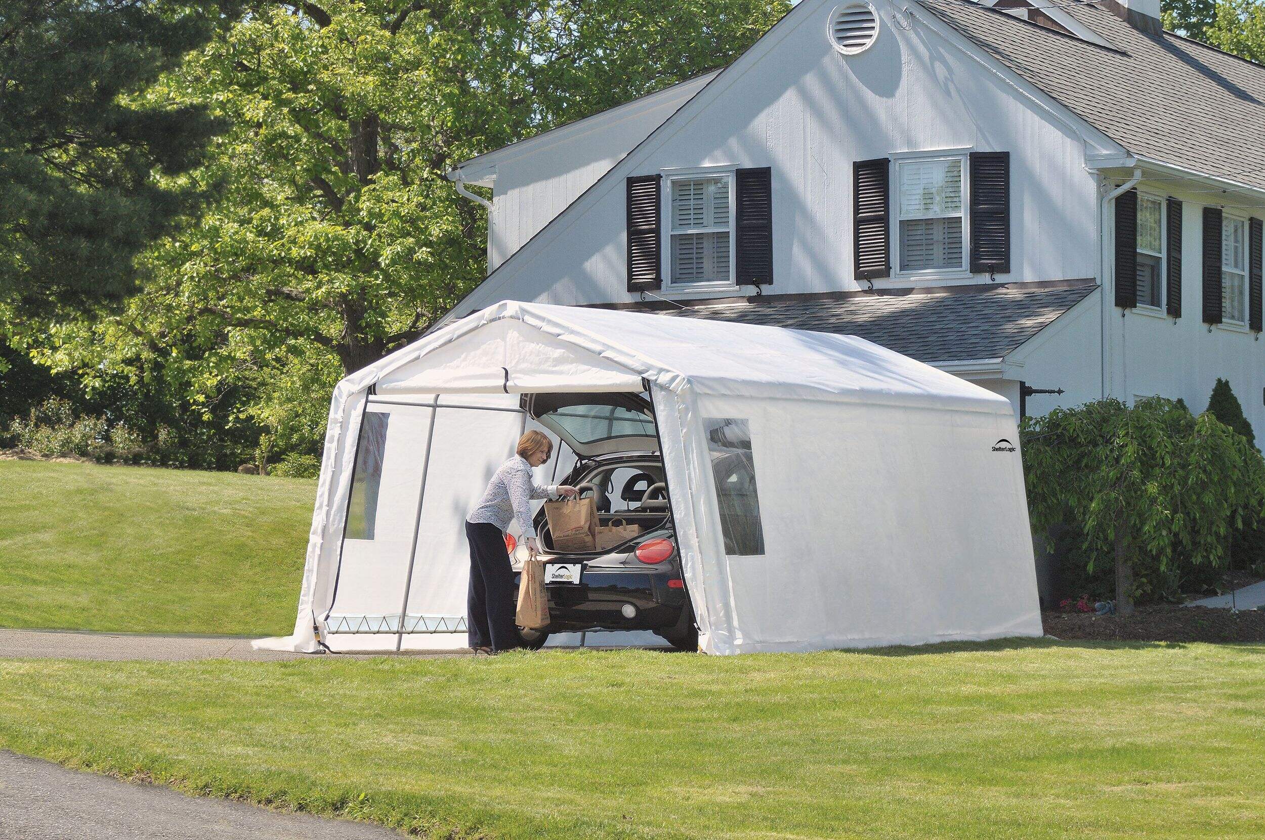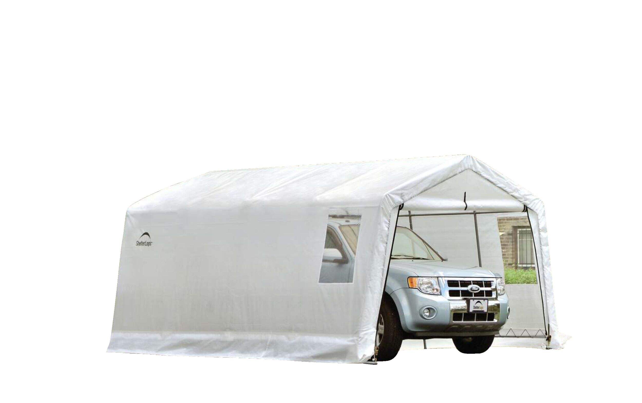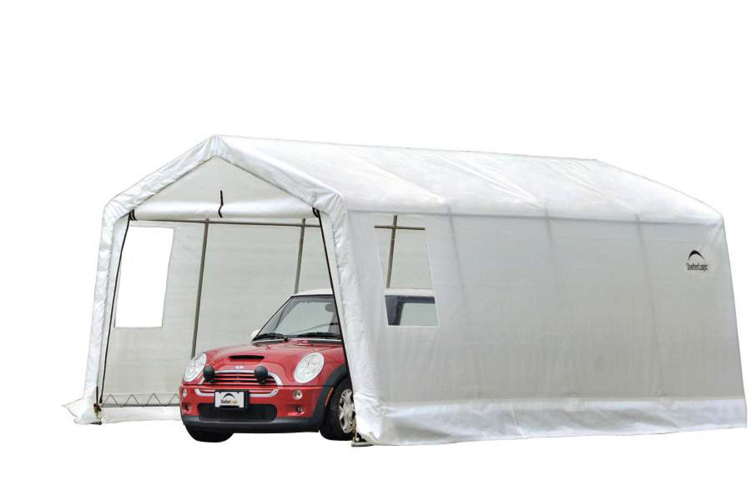 The ShelterLogic Clearview Peak Car Garage is an ideal outdoor storage solution, suitable for any driveway or yard. Its durable construction resists chipping, peeling, and corrosion even with extended use. The steel shelter locks provide improved stability and strength. The garage is covered with a 5-oz woven polyethylene fabric featuring UV protection. Two vinyl windows and two double zipper doors are included in the design. A replacement cover is available under CT# 274-0944.