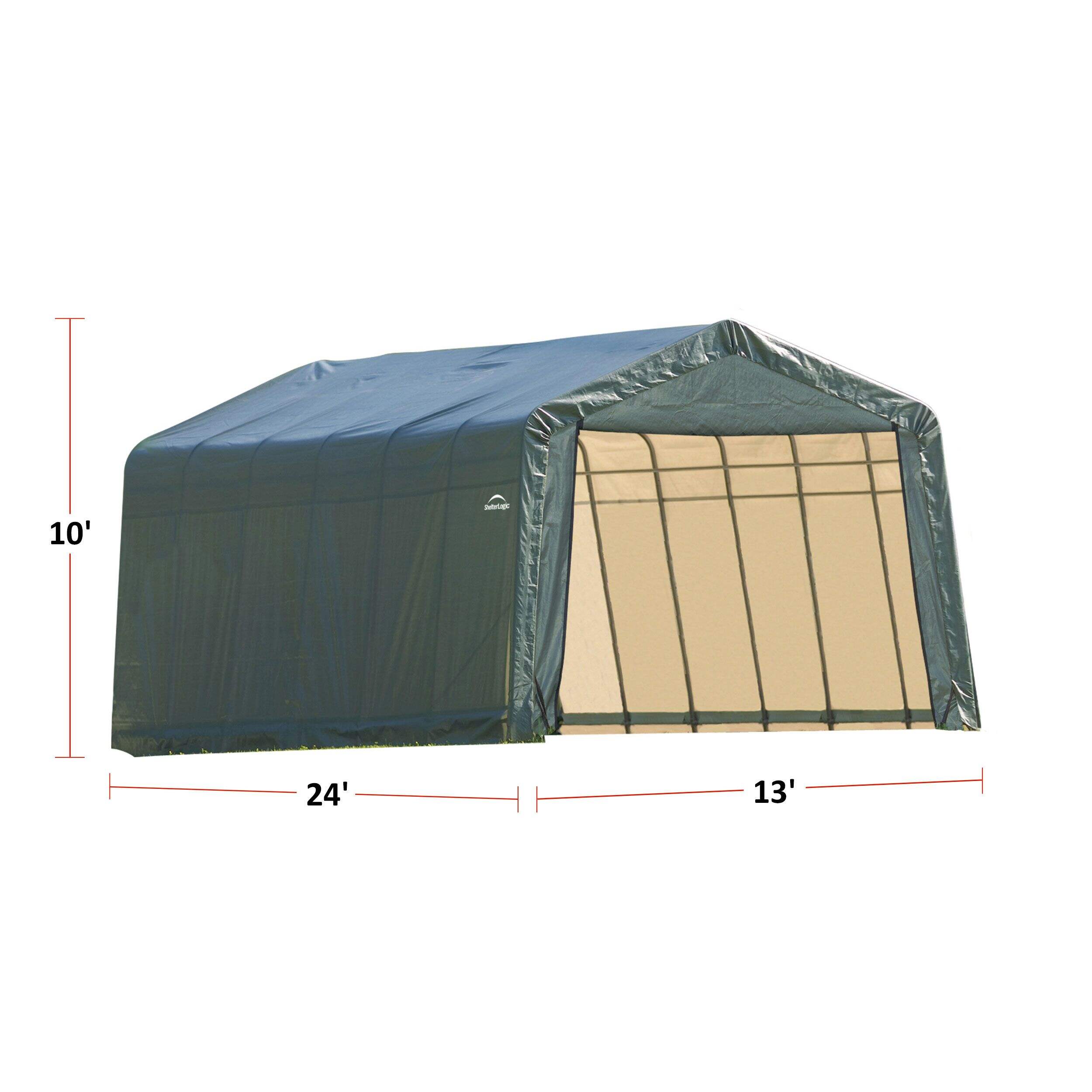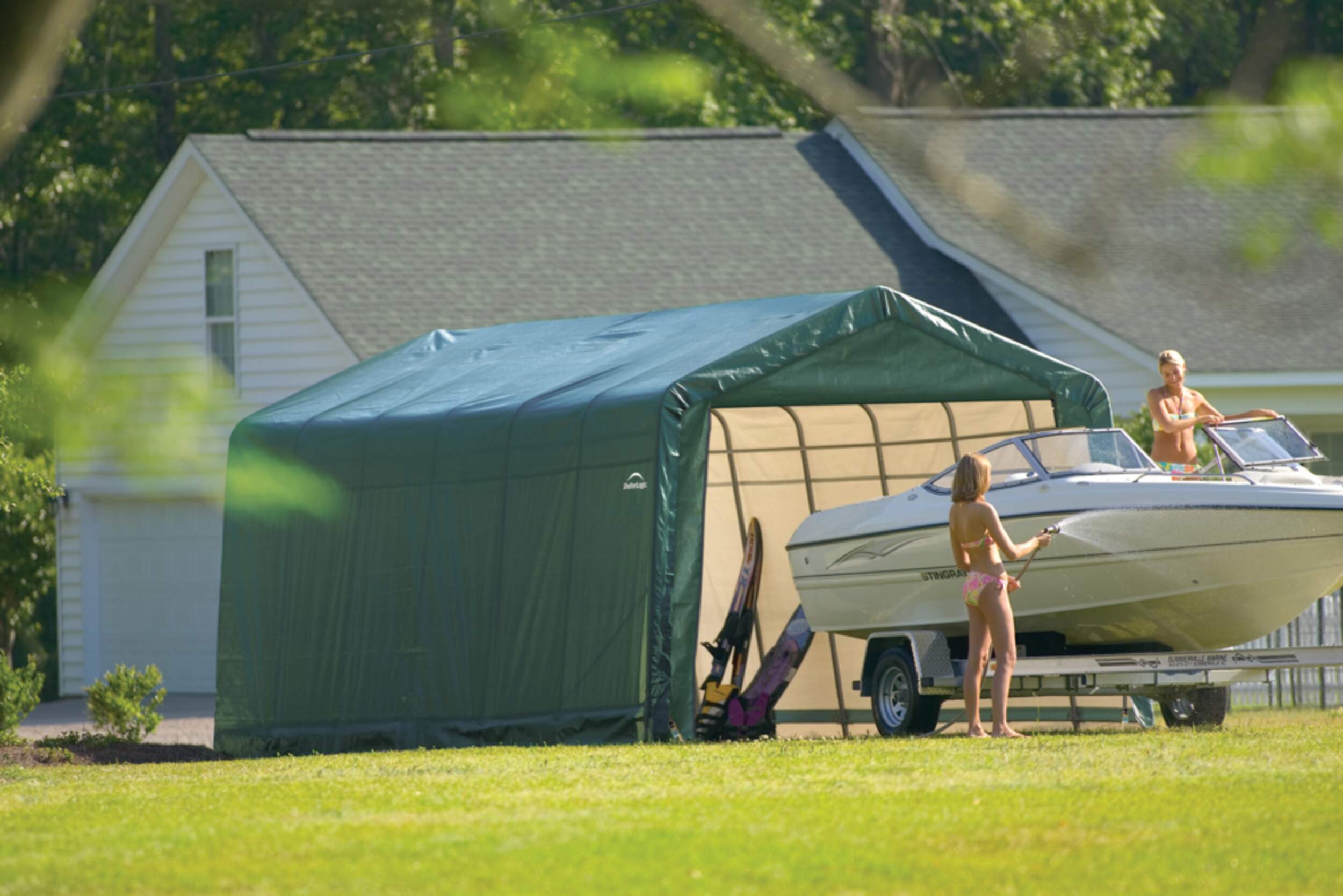 ShelterLogic ShelterCoat™ Peak Style Shelter is an ideal compact storage solution for ATV's, lawn and garden equipment, small tractors, patio furniture, pool supplies, tools, equipment and bulk storage