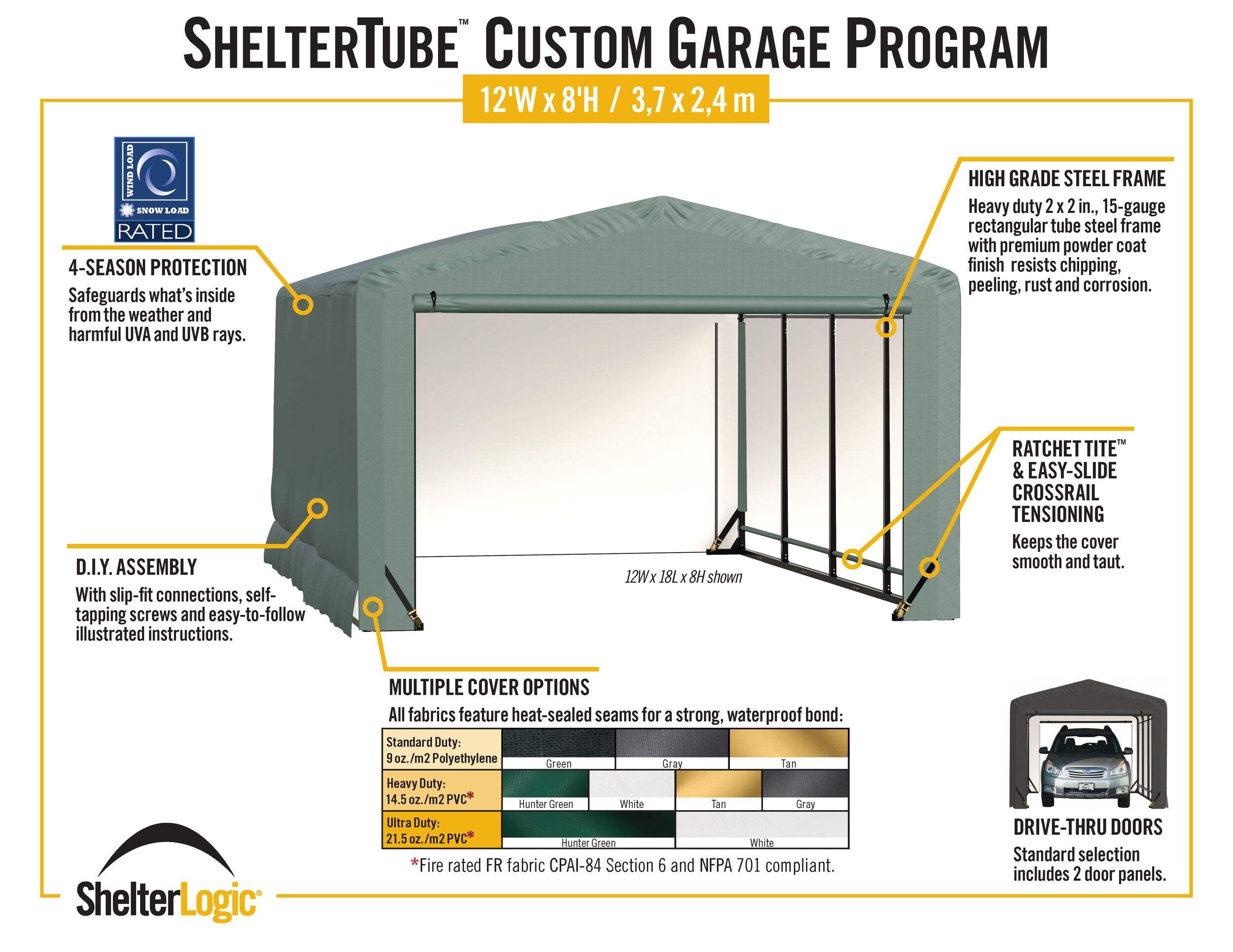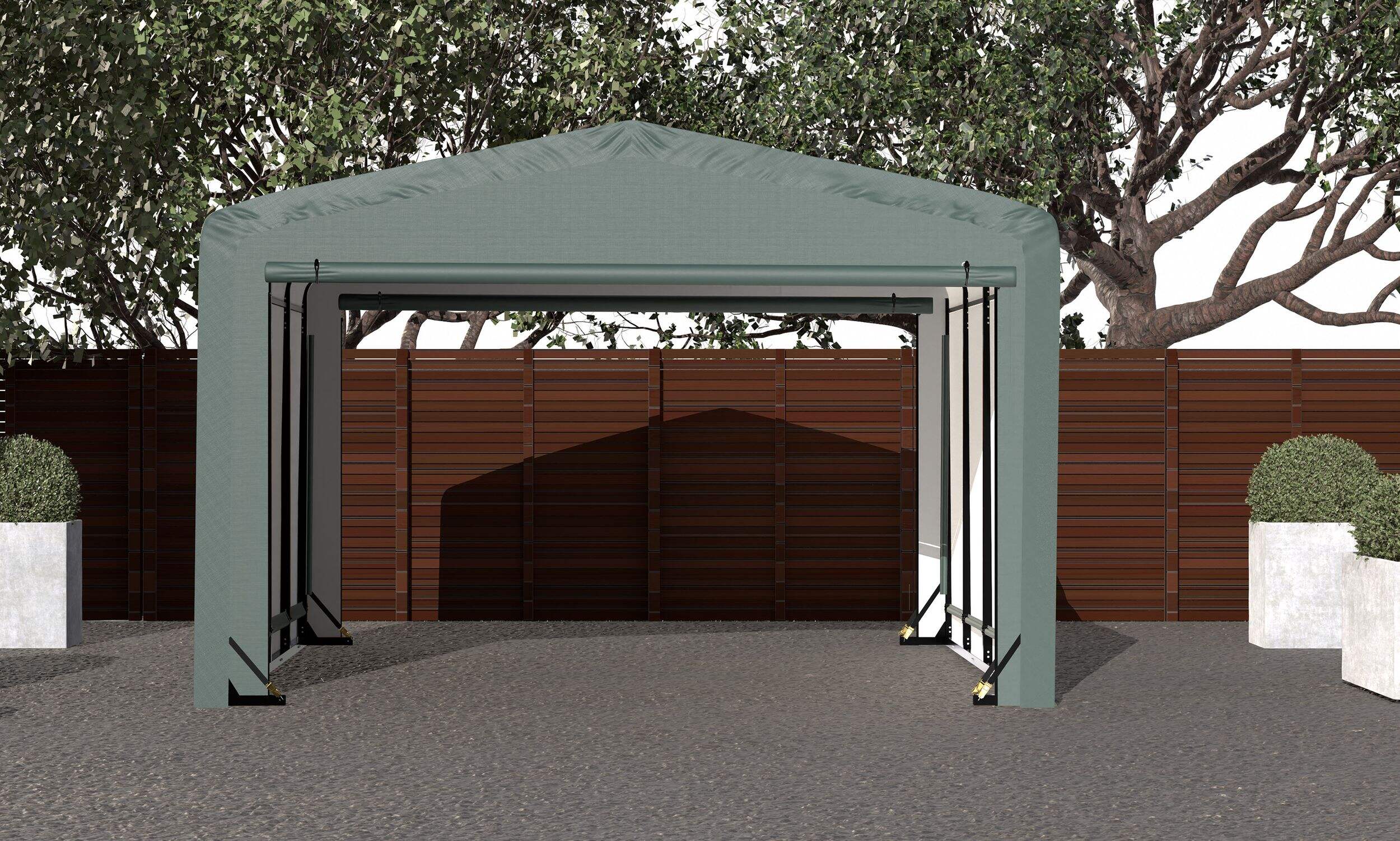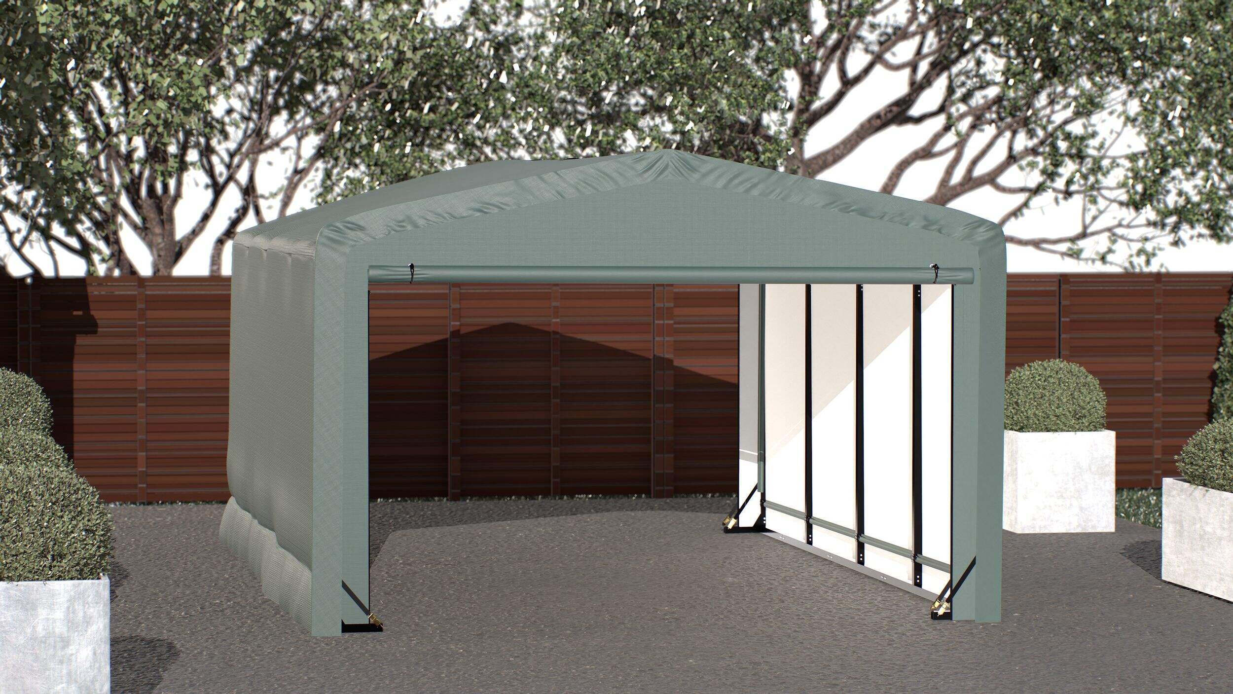 Give your prized possessions the year-round protection they deserve with this ShelterLogic ShelterTube Wind and Snow-Load Rated Garage Auto Shelter. Its industrial-strength steel frame can withstand heavy snow loads, while the rugged cover shrugs off wind, rain and UV rays. It has room for everything from cars and trucks to boats, ATVs and tools. No more cluttering your garage — store it all in this outdoor storage solution.