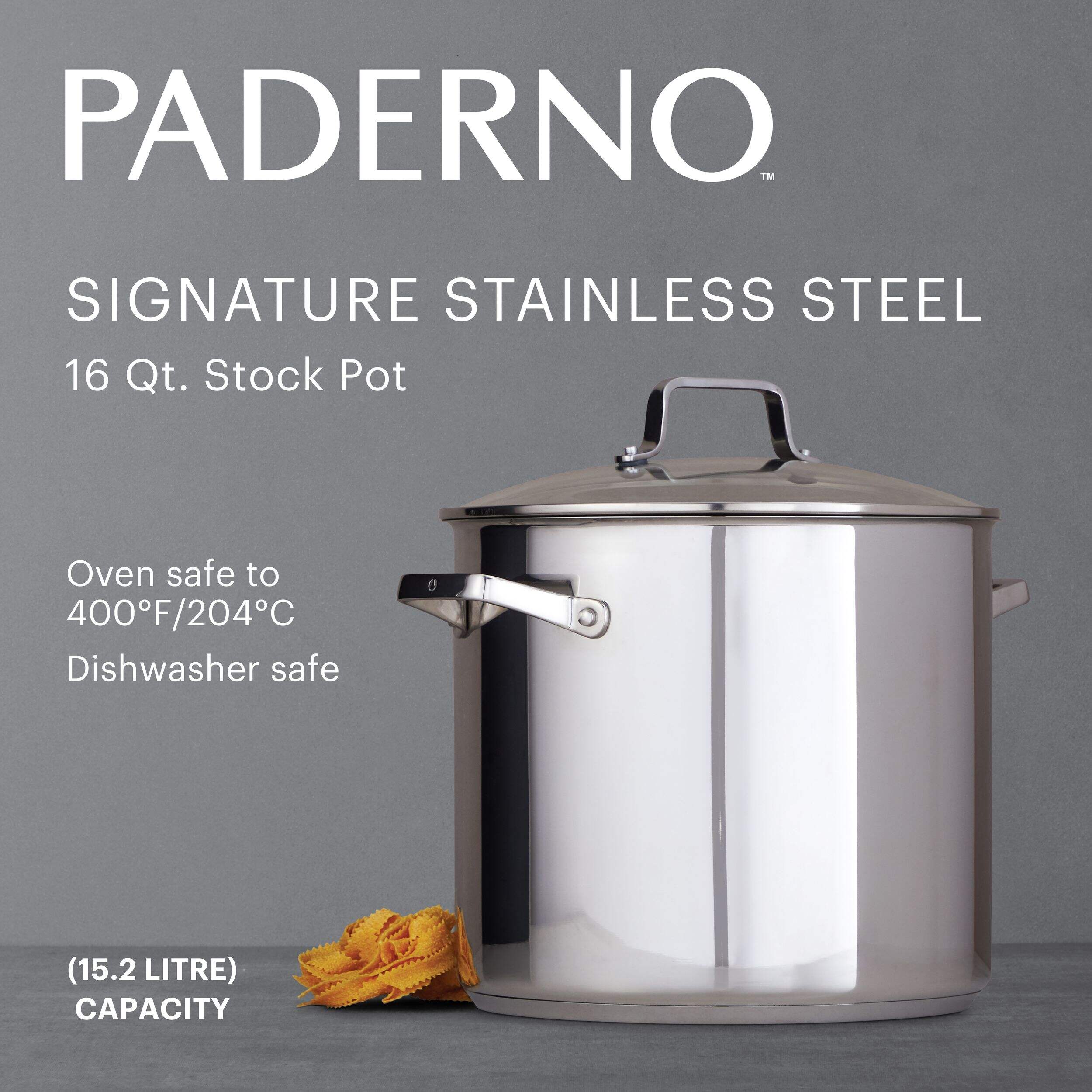 Make delicious one-pot meals with the handy PADERNO Signature Stock Pot. Built with durable food-grade stainless steel, this reliable stock pot features an aluminum encapsulated base for quick and even heat distribution for well-cooked food. Its riveted cool-touch handles ensure easy lifting for hassle-free use in the kitchen.