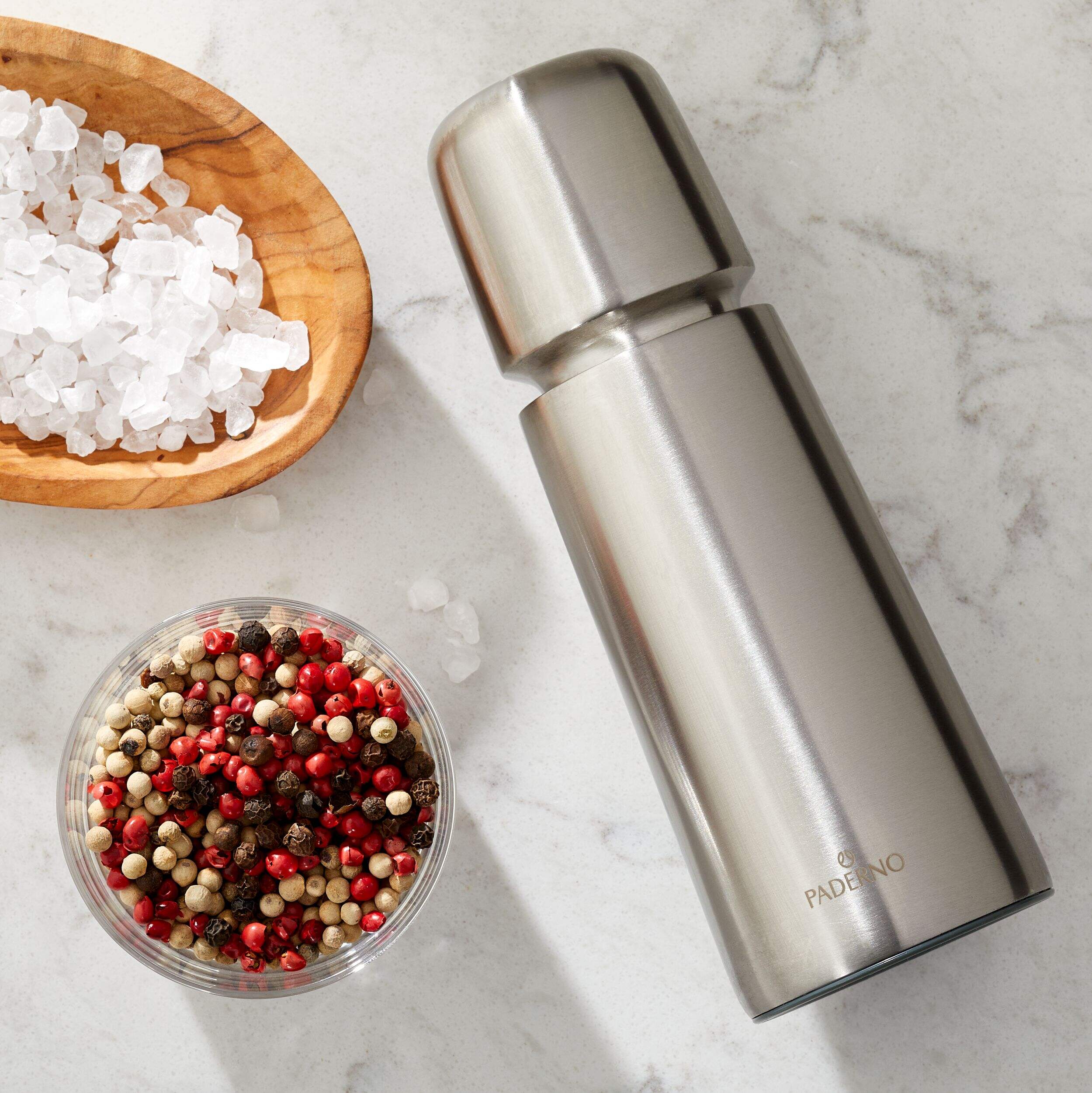 The PADERNO Stainless Steel Salt/Pepper/Spice Mill is mounted with an original CrushGrind® ceramic grinding mechanism