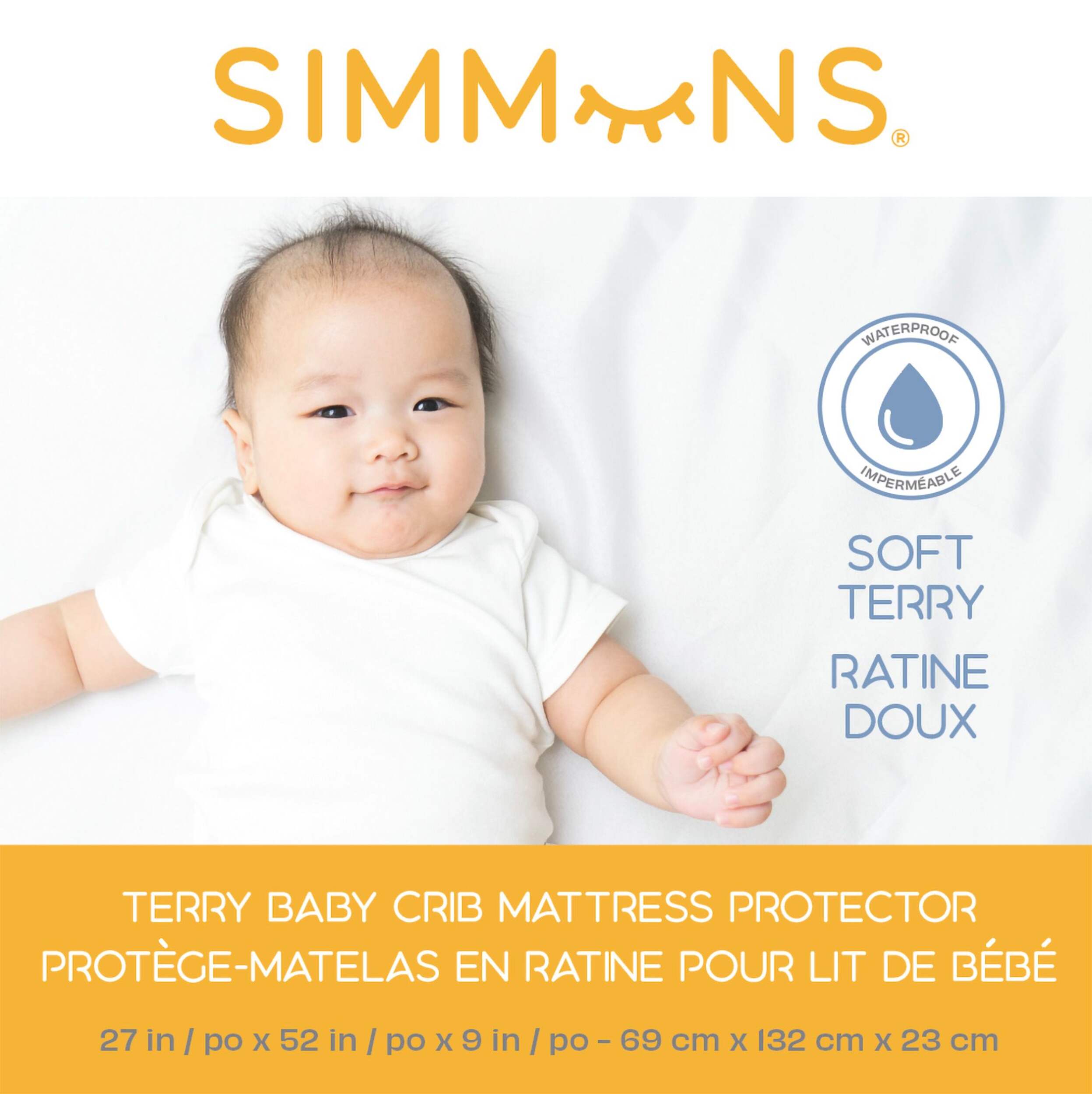 The Simmons Polycotton Terry Crib Mattress Protector provides a breathable layer between your little one and their mattress. Its protective TPU coating is free of VOCs for a healthier sleep environment. Sized to fit standard crib and toddler mattresses, this protector can be easily machine washed for convenient cleaning. Designed with baby's comfort and safety in mind, it creates a drier surface while allowing airflow. Exclusively available online, this protector offers superior quality and peace of mind from the trusted Simmons brand.