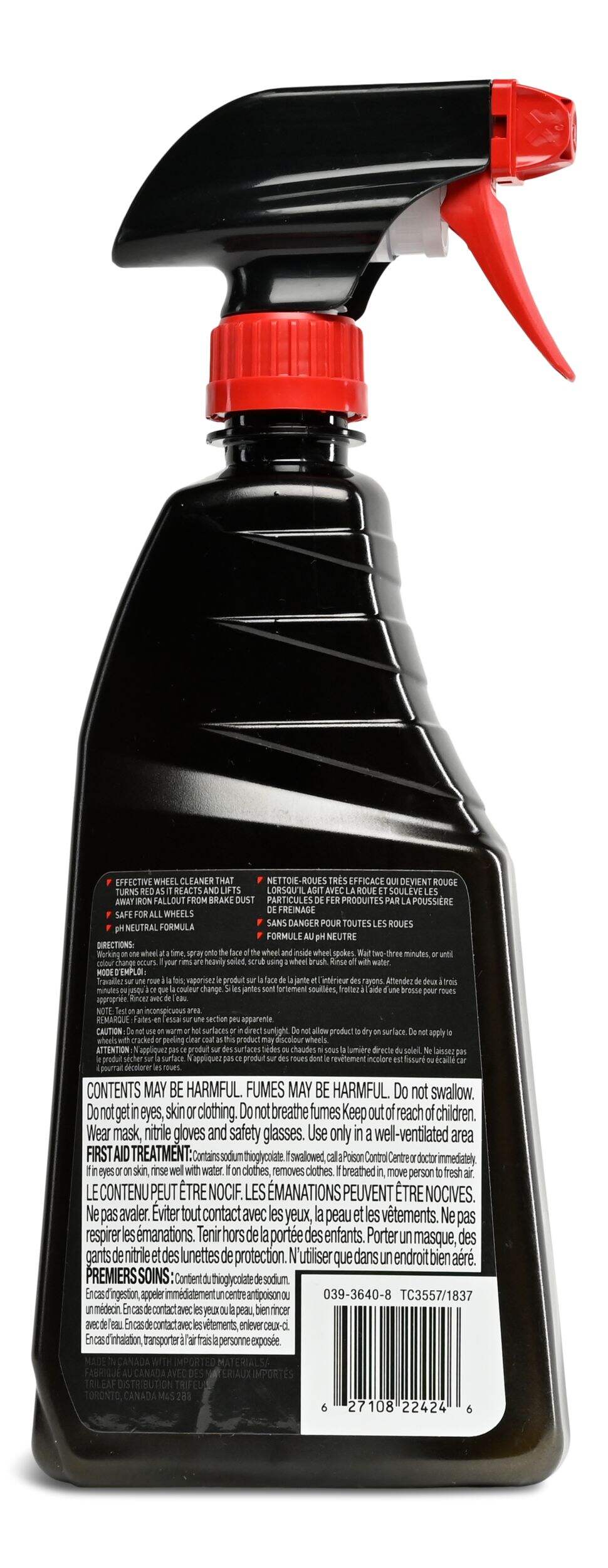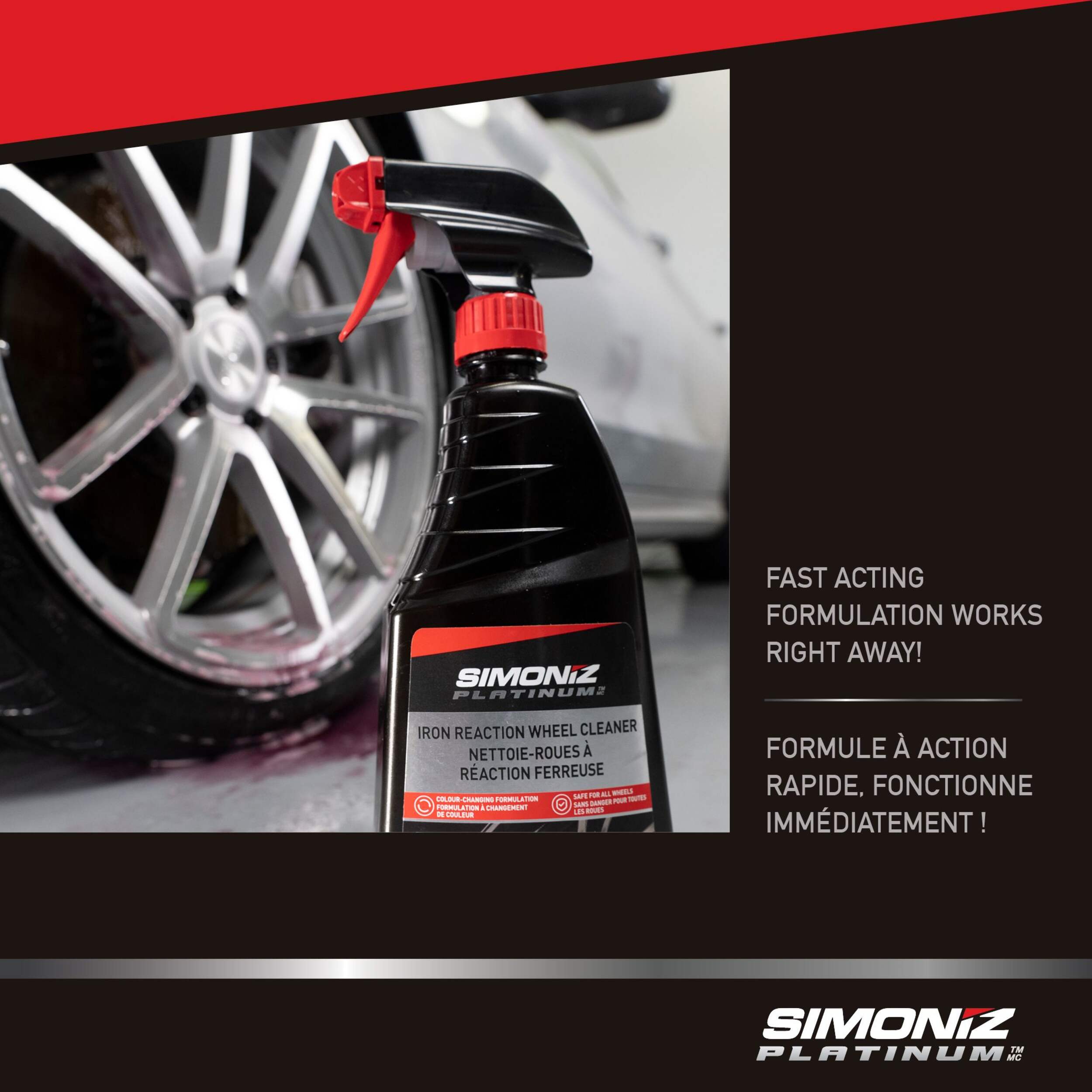 See the cleaning difference with this innovative Simoniz Platinum Iron Wheel Cleaner; a unique formula that changes colour as it cleans so you know you're getting all the dirt off. This wheel cleaner easily removes the dirt and corrosive materials that accumulate on wheels to improve performance, extend wheel life, and make your vehicle look great. The 750-mL spray bottle makes application quick and easy, and has a pleasant citrus scent.