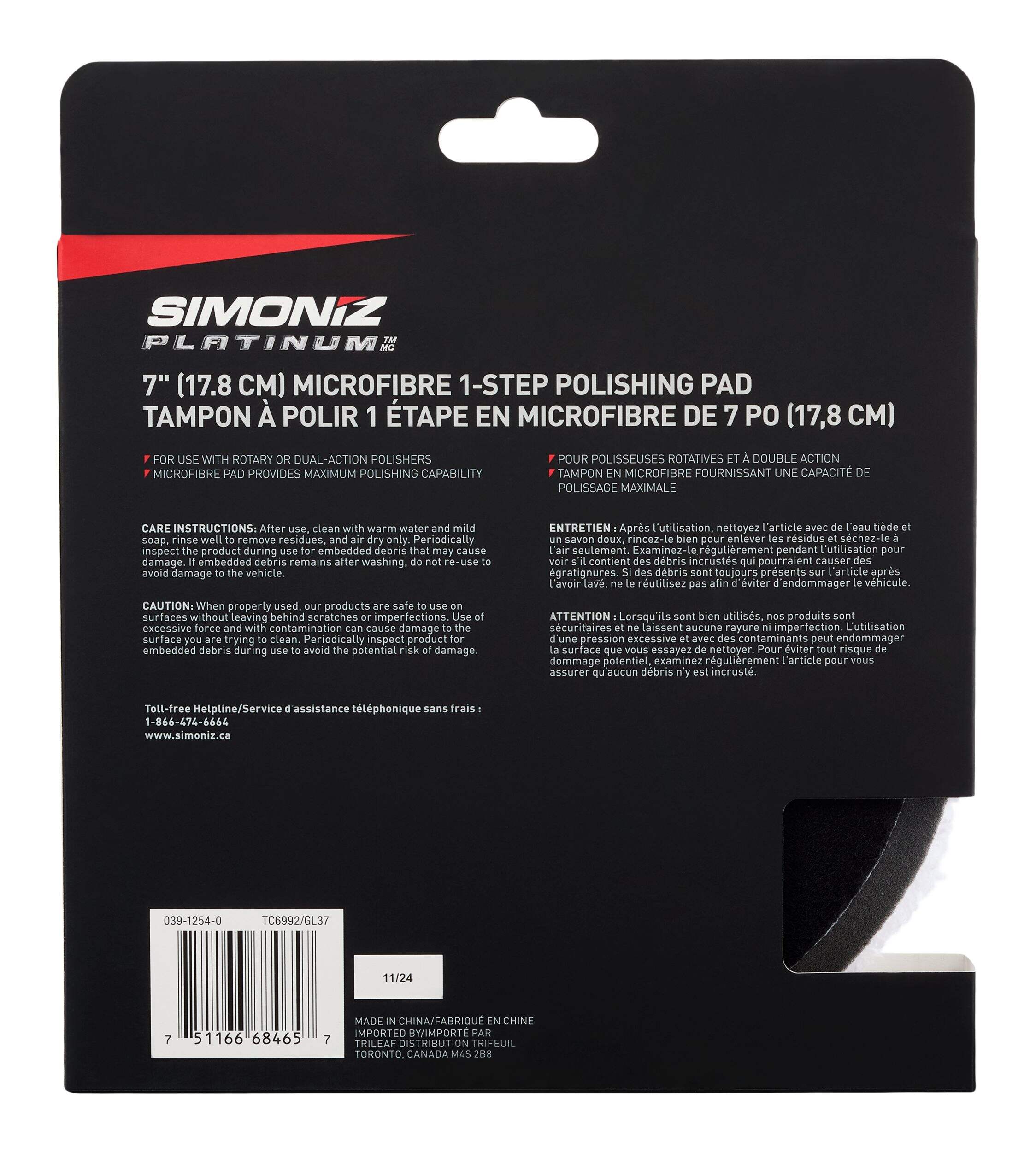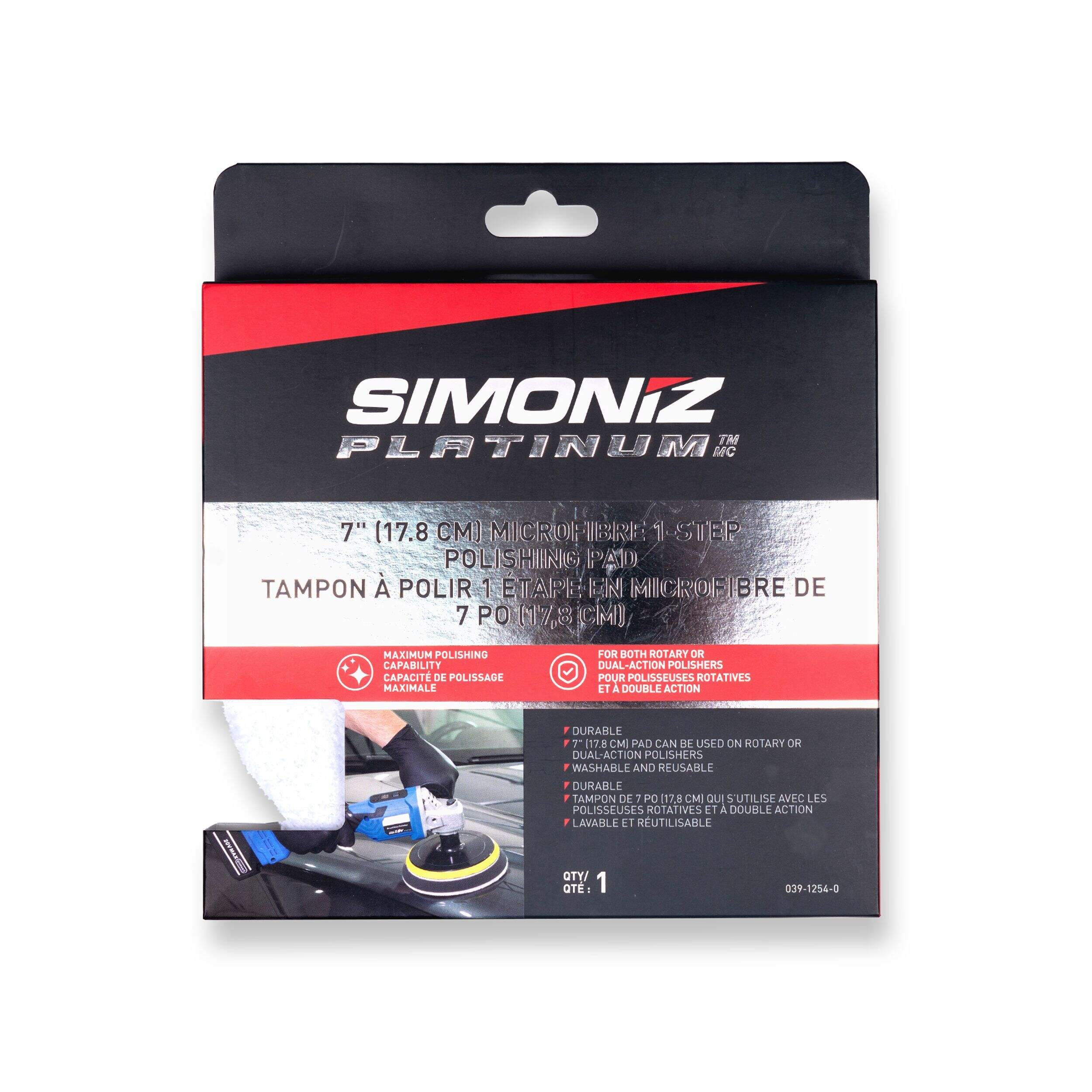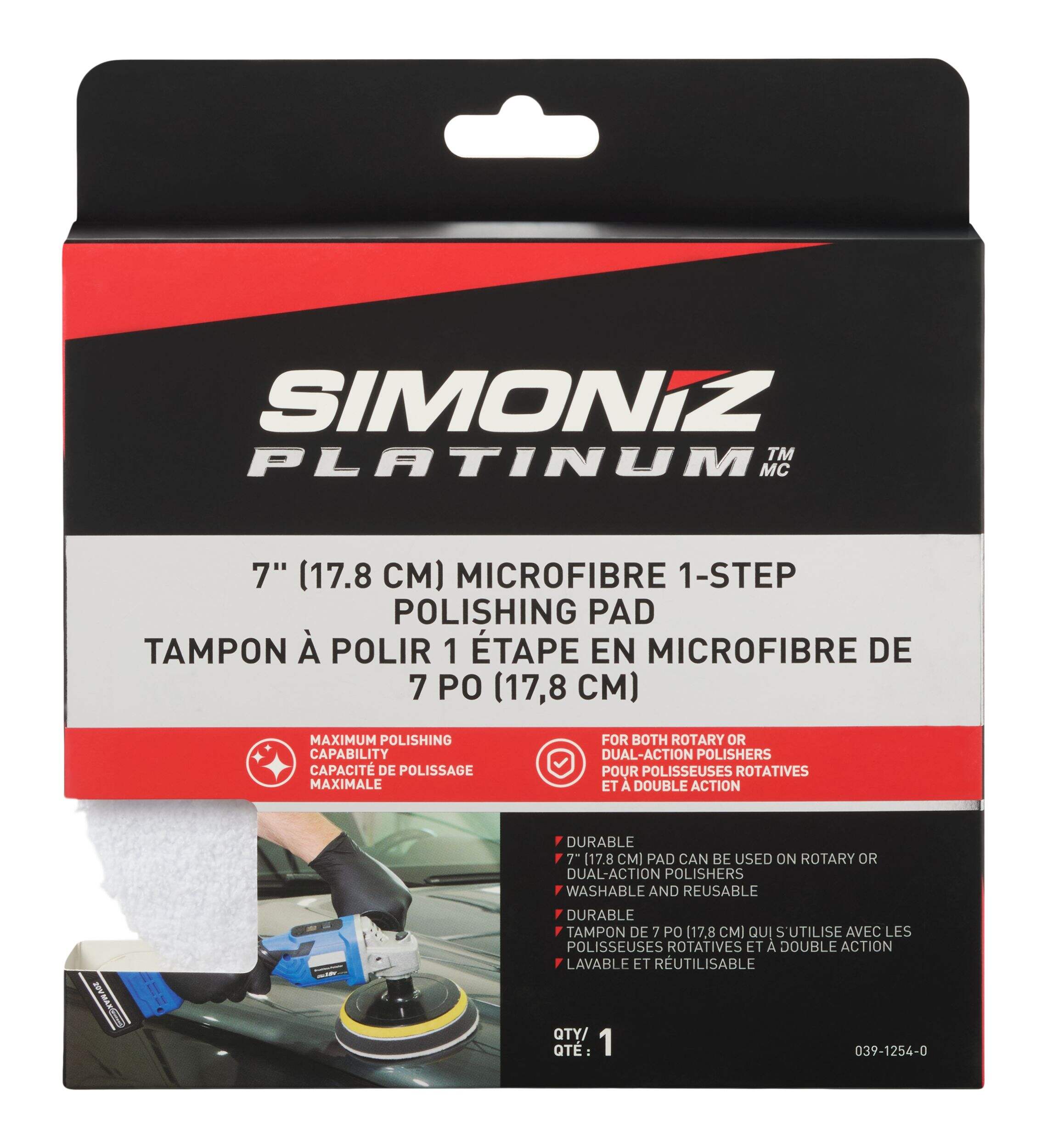 The Simoniz Platinum Microfibre 1-Step Polishing Pad is built for efficiency and versatility in automotive maintenance. Designed for use with rotary and dual-action polishers, the highly absorbent material enhances polishing performance. Durable construction ensures repeated use, making it a reliable addition to any car care routine. Washable and reusable, this pad offers a practical, long-term solution for maintaining a good-looking vehicle.