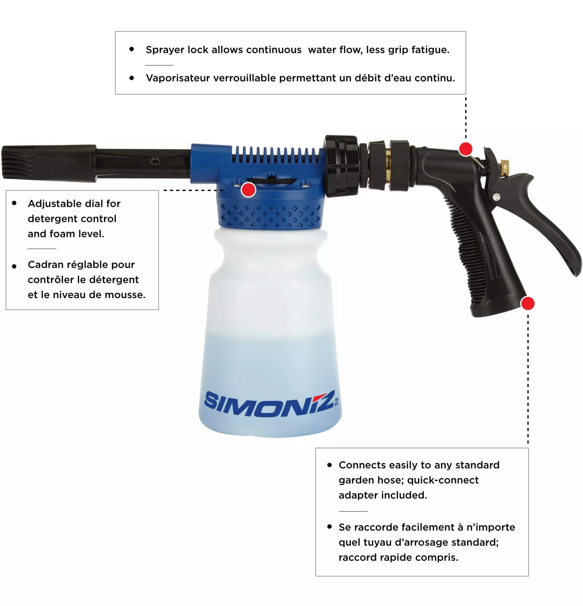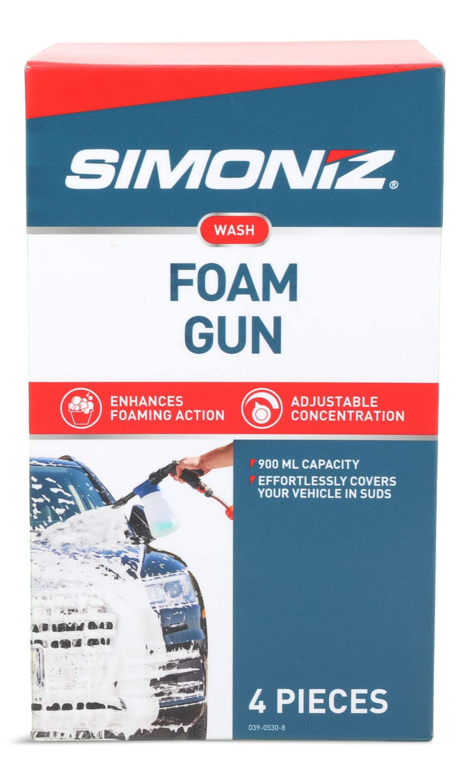 Bring your vehicle's appearance up to speed with the SIMONIZ Adjustable Foam Gun. Get a great, exterior car wash with the sudsing ability and power of this 4-pc car wash kit. The foaming gun connects to a standard garden hose to lather your ride in minutes, loosening and releasing stubborn road grime. Compact and convenient, this foaming wash gun is an economical way to keep your car looking great without leaving your driveway.