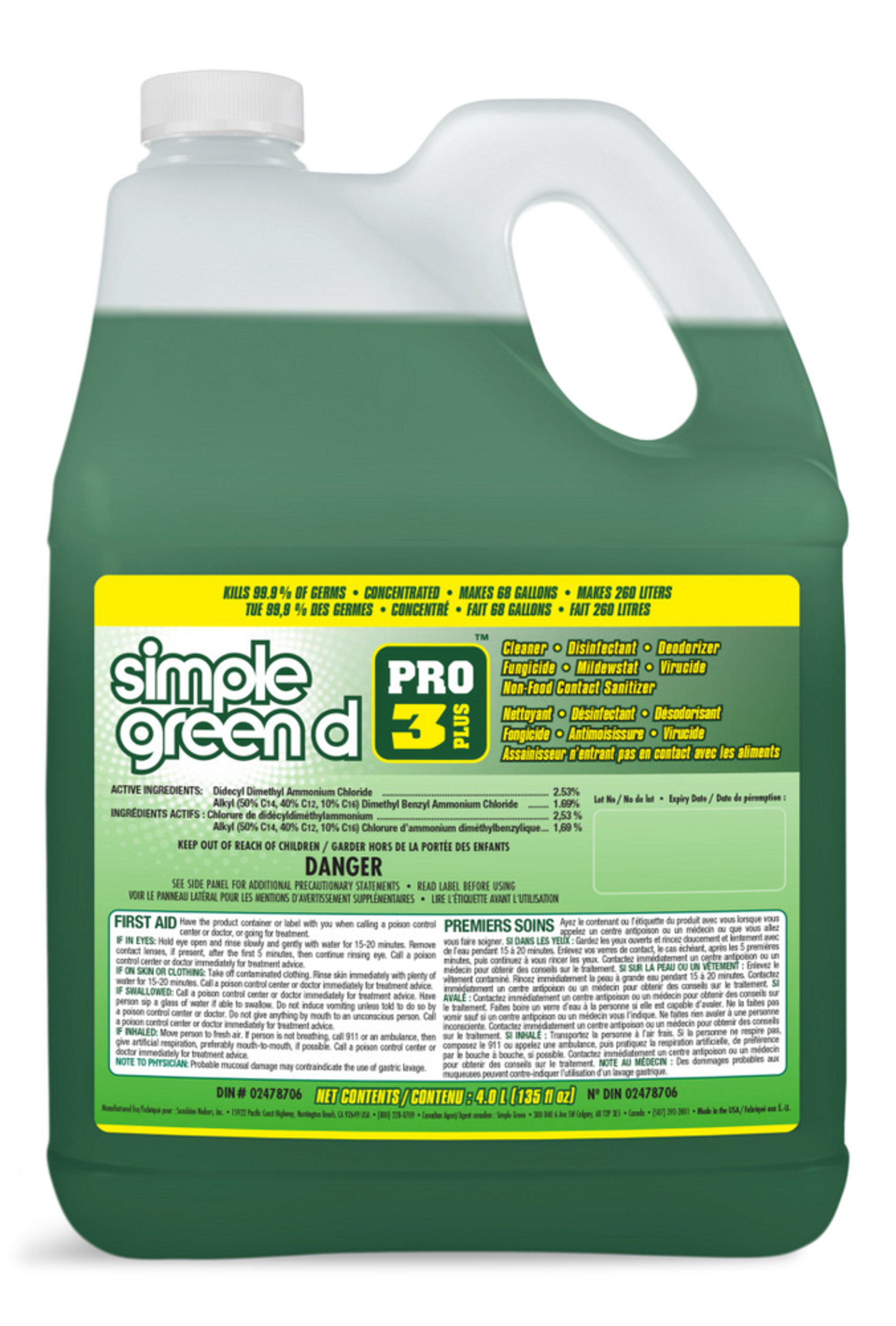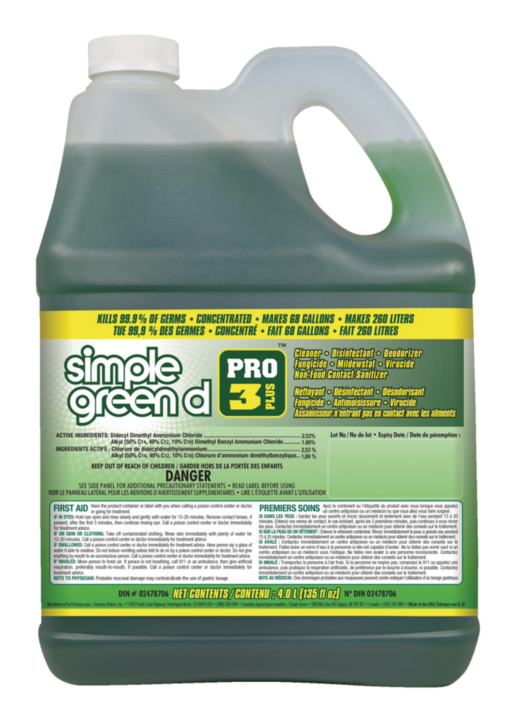 Simple Green® dPRO3 PLUS kills 99.9% of germs. Cleans, disinfects, eliminates odors leaving surfaces residue-free and smelling clean and fresh. Sanitizes non-food contact hard, surfaces and floors. For kitchens, bathrooms, classrooms, office buildings.