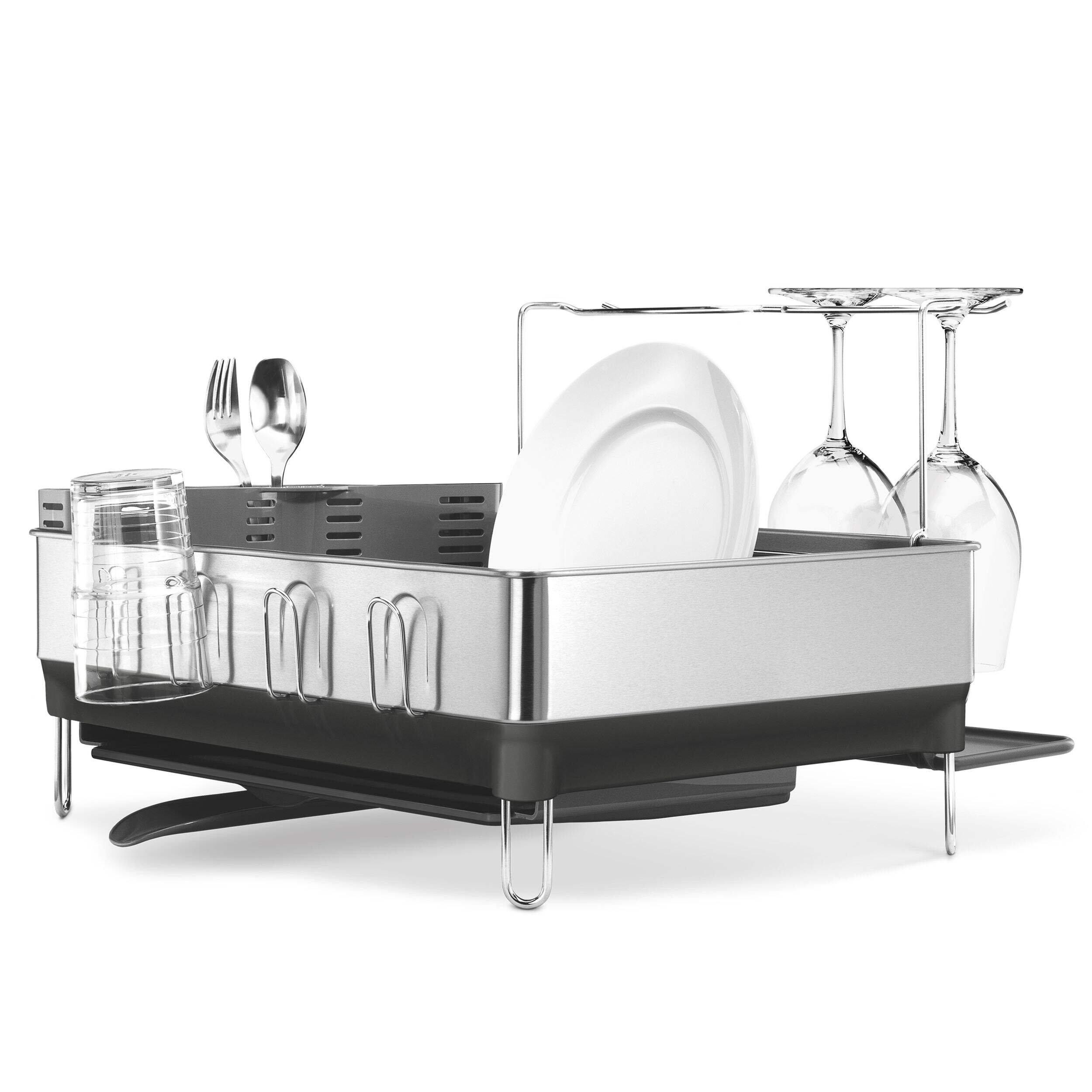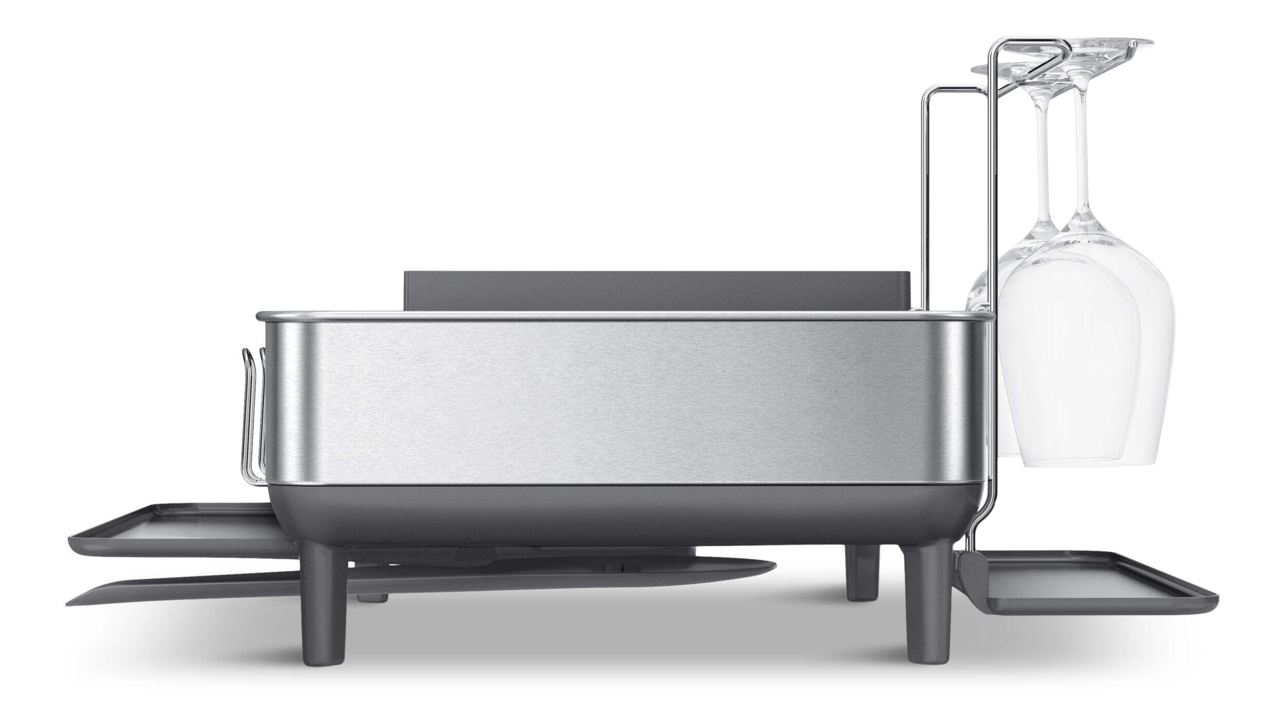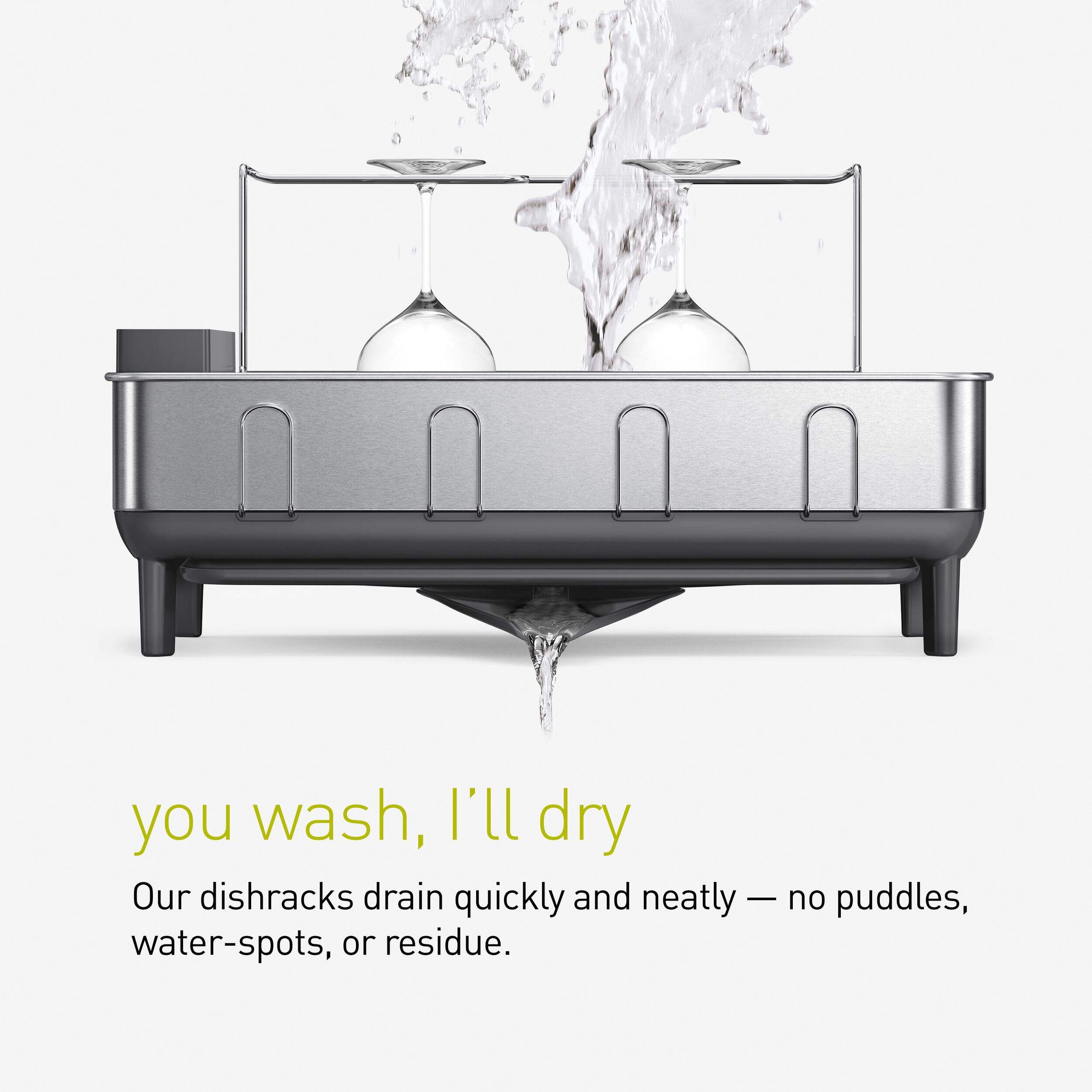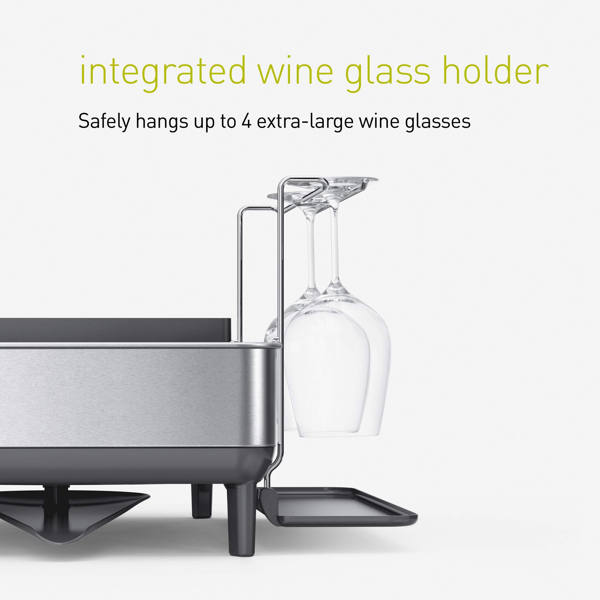 The Simplehuman Large Steel Frame Dish Rack seamlessly complements the sleek, modern style of upscale kitchen appliances. Its innovative swivel spout rotates 360° to drain water directly into the sink, no matter how it’s positioned, and removes easily for hassle-free cleaning. An anti-residue coating keeps water spots and buildup at bay, while silicone-capped wires secure dishes without scratching or chipping. Plus, the wine glass holder safely hangs up to four glasses, including oversized Bordeaux stems, making clean-up as effortless as it is elegant.