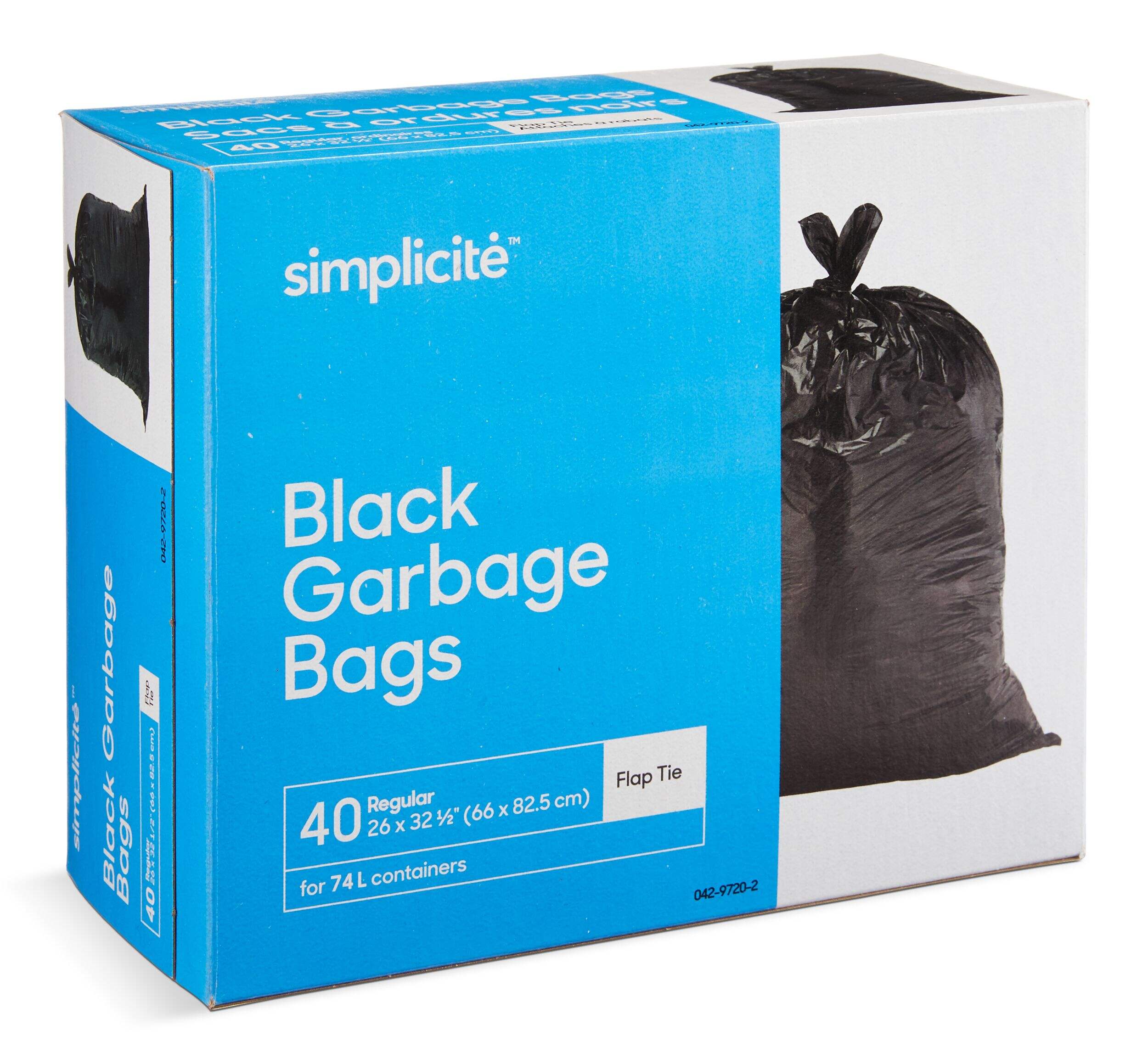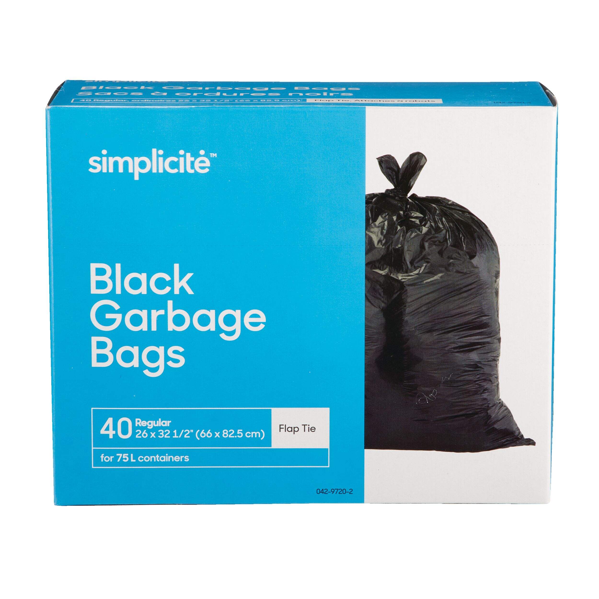 The Simplicité Regular 4-Flap Ties Outdoor Garbage Bags are ideal for containing yard and outdoor waste. These durable black plastic garbage bags feature four flap ties for secure closure. The 80-bag pack is perfect for gathering leaves, grass clippings and other outdoor debris.