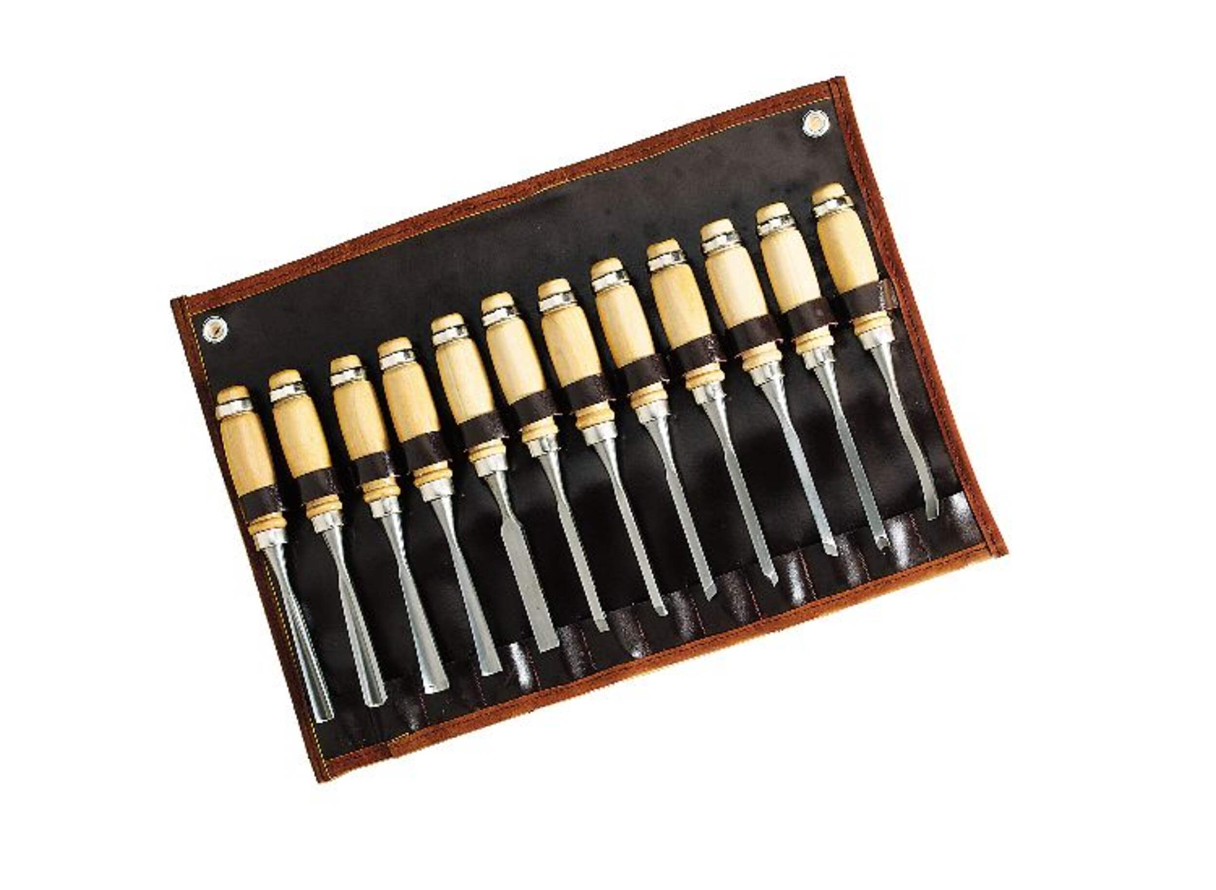 Includes the following tools: 1/4” (6.35 mm) straight chisel, 1/2” (12.7 mm) straight chisel, 1/4” (6.35 mm) spear point, 1/4” (6.35 mm) hollow point, 1/4” (6.35 mm) spoon chisel, 1/4” (6.35 mm) round point, 1/4” (6.35 mm) skew, 1/4” (6.35 mm) double-face skew, 3/8” (9.5 mm) gouge, 1/2” (12.7 mm) gouge, 3/8” (9.5 mm) parting tool, and a 5/8” (15.8 mm) gouge