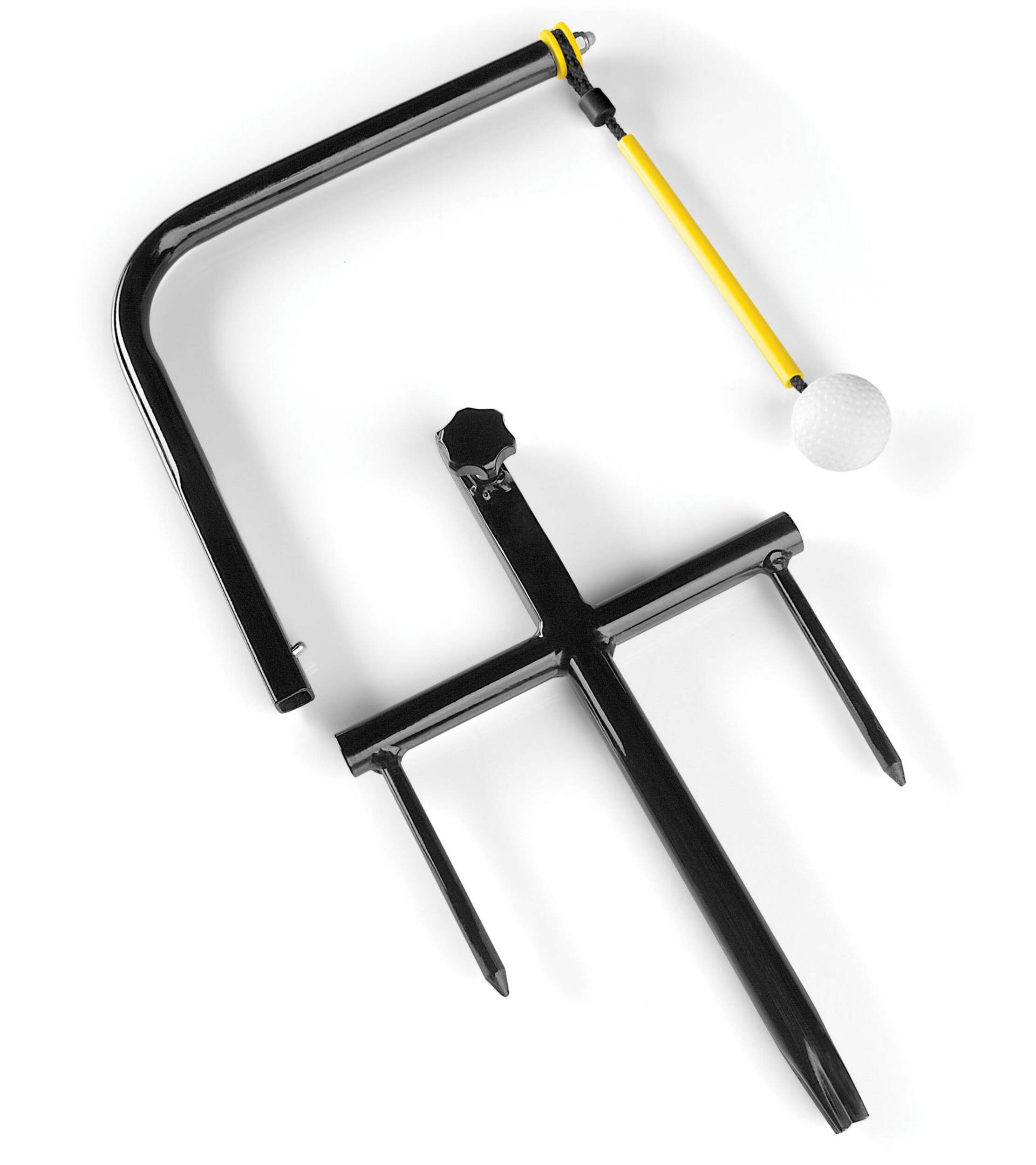The SKLZ Pure Path is a must-have training tool to correct and perfect your golf swing. The aid provides you honest and instant feedback on your swing, while helping you eliminate slices and hooks. The attached target ball eliminates the need for a practice net and you'll never run out of golf balls and can be adjusted to different heights. Portable and lightweight, the Pure Path Swing Trainer sets up quickly and easily using stakes into the ground. The trainer can be hit with any wood, iron, or wedge club and is perfect for backyard training or on the range.