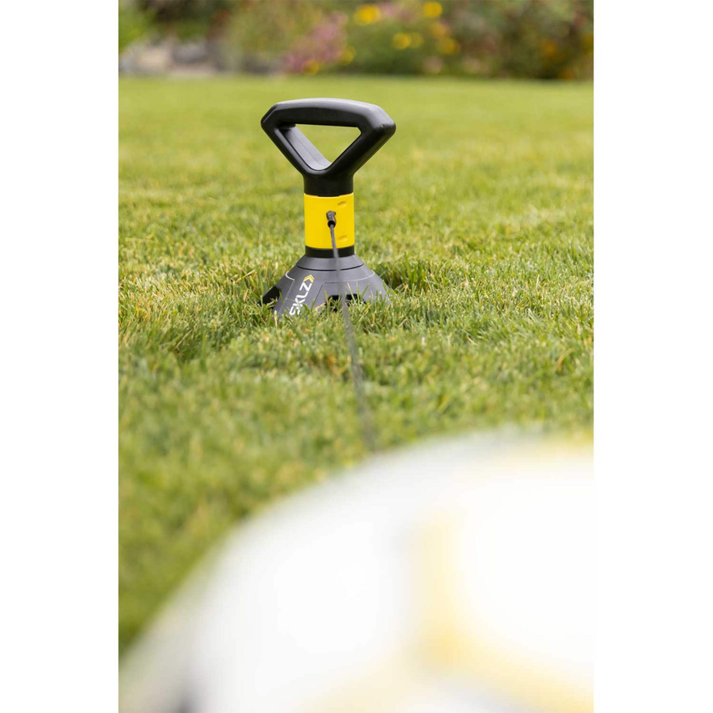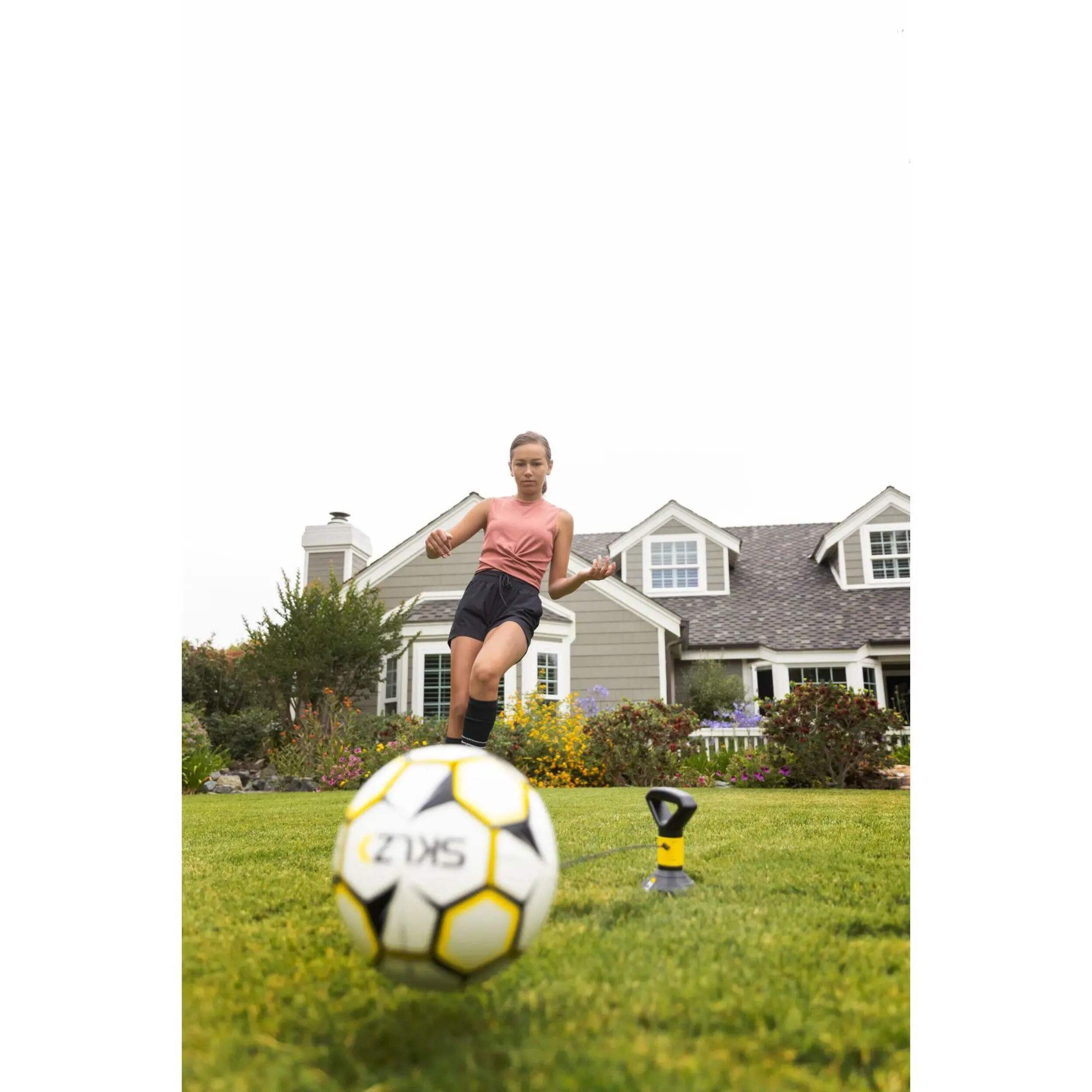 The Pass Around is a stationary passing trainer that helps athletes improve their passing, ball control, rhythm, and overall touch. Designed to work on both right and left footwork, when practiced consistently, can improve their overall training. The solo trainer provides instant feedback if the ball is kicked incorrectly, allowing athletes to adjust their technique to practice accuracy. The simple design of the trainer spins the soccer ball freely with a 360- swivel design so the rotation is smooth and provides a realistic feel when kicked. Easily anchor and secure the spiral spike into grass for training. Designed with a size 5 regulation soccer ball. A fun and effective tool helps athletes play and train to be better on the pitch on game day.
