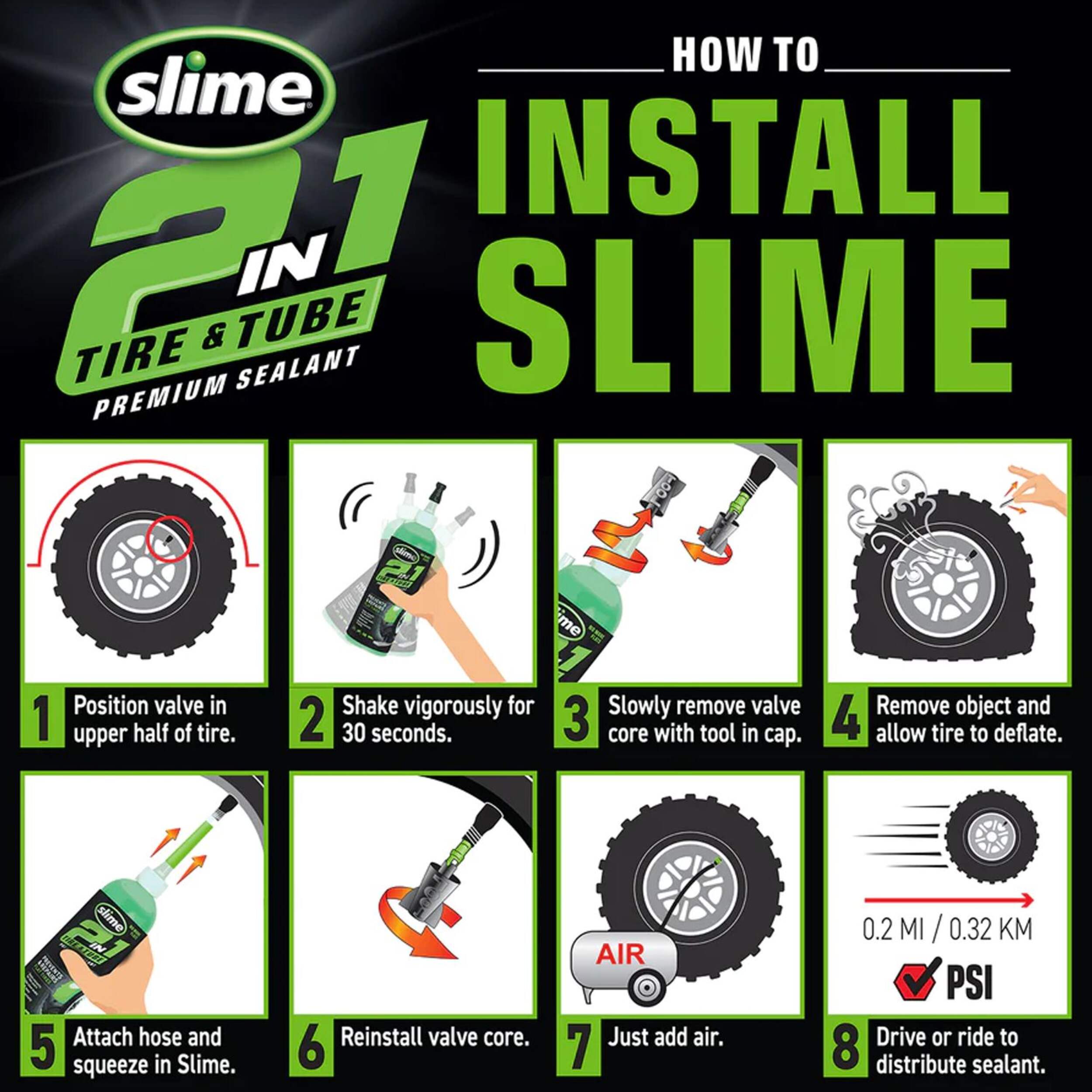 Slime 2-in-1 Tire and Tube Premium Sealant works to prevent and instantly seal punctures in off-highway tires and tubes that remain sealed for up to 2 years. Slime uses innovative Fibro-Seal Technology that's highly effective in extreme temperatures. The formula is also environmentally-friendly, non-toxic, non-hazardous, non-flammable, and non-corrosive, so you never have to worry about adverse reactions with other materials and surfaces.