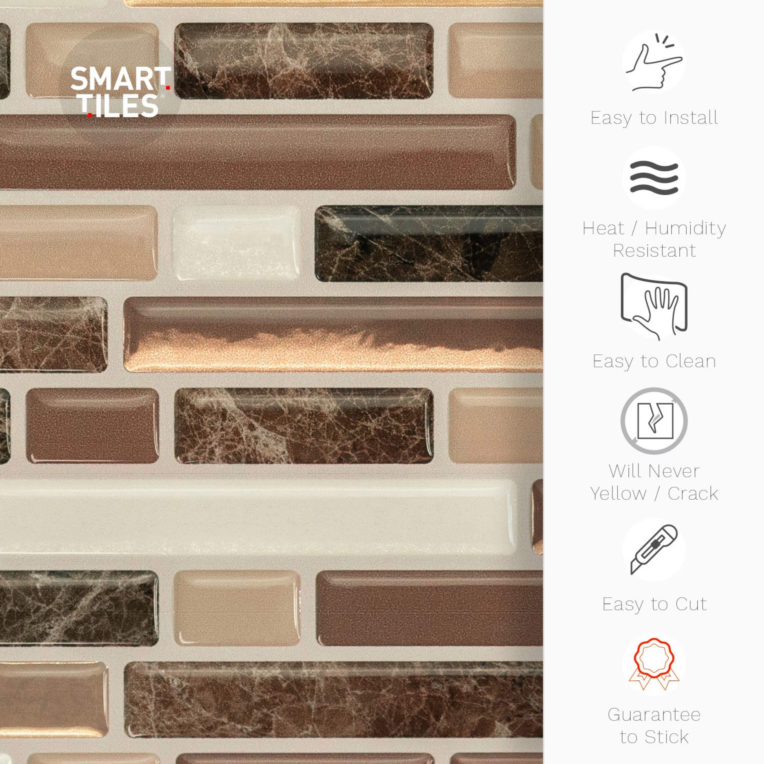 Premium Quality, Made in North America. Smart Tiles are robust and resistant to heat from kitchen cooktops. They are also suitable as a backsplash in bathrooms (not suitable for inside the shower) or even around a fireplace. Follow the installation instructions to ensure a long life-span and a trendy, smart new look for your interior in minutes. No more messy, time-consuming and nerve wracking tile installations with grout or glue. Effortless DIY, easy to follow instructions included! Clean and dust free installation. Designed with a patented gel component called Gel-O, which gives the tiles a 3-dimensional effect. Keep your home looking stylish over the long term.