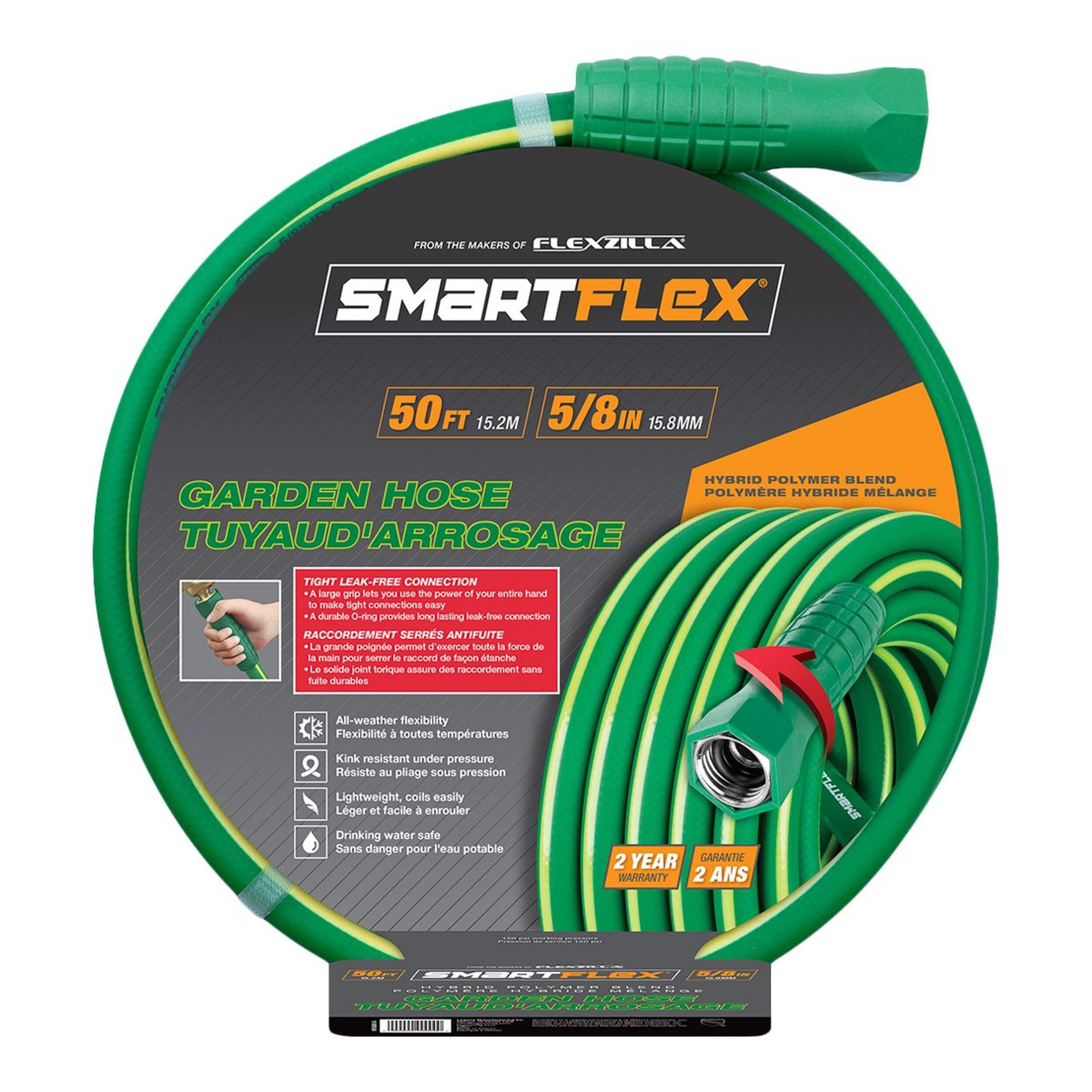 Make outdoor watering hassle-free with the SmartFlex All-Weather Garden Hose. Its kink-resistant, lightweight design ensures smooth water flow even when bent or twisted, thanks to its durable construction. With an abrasion-resistant cover, it withstands rough use, while leak-free, easy-grip connections simplify tightening by hand. Safe to drink from, this hose is built for convenience and reliability.