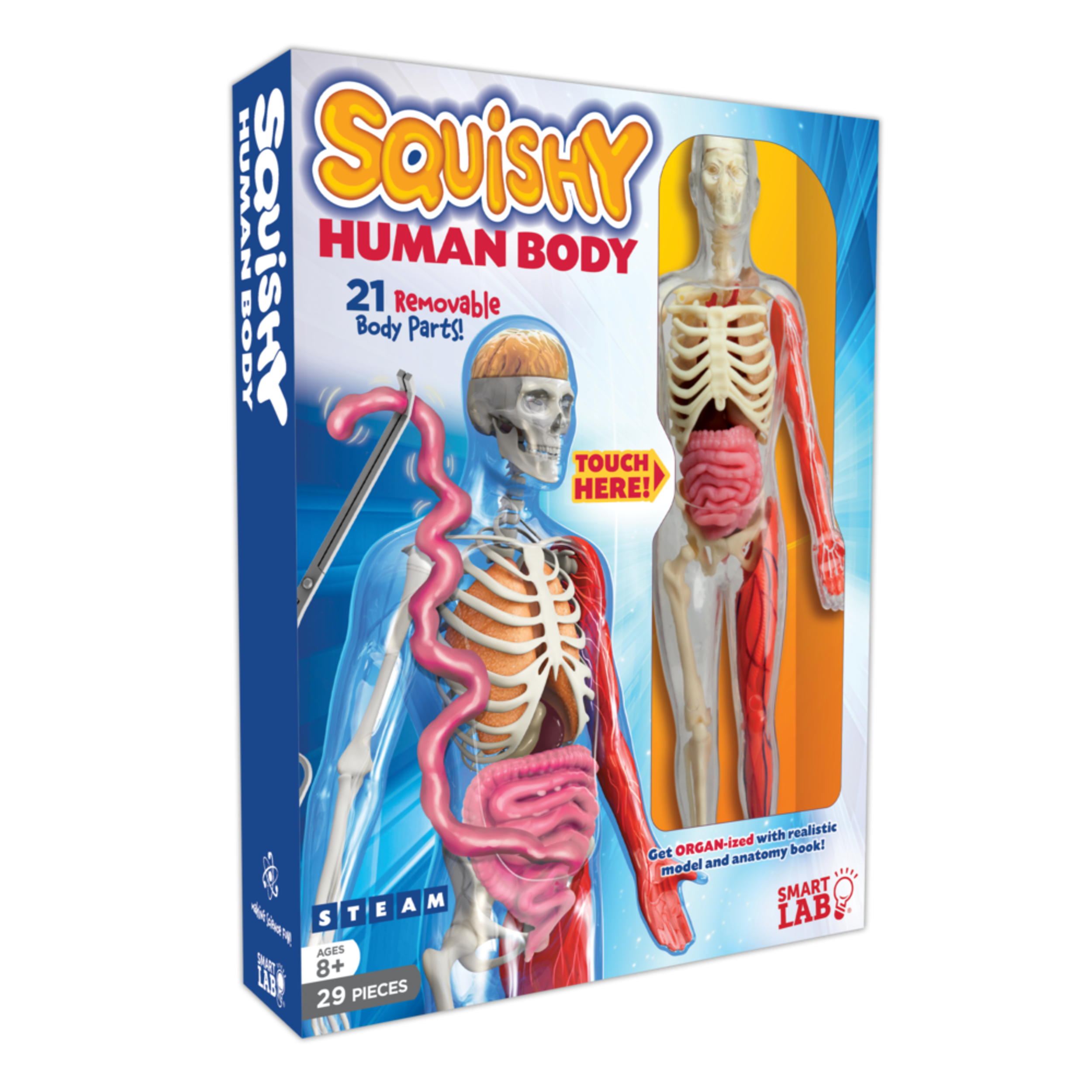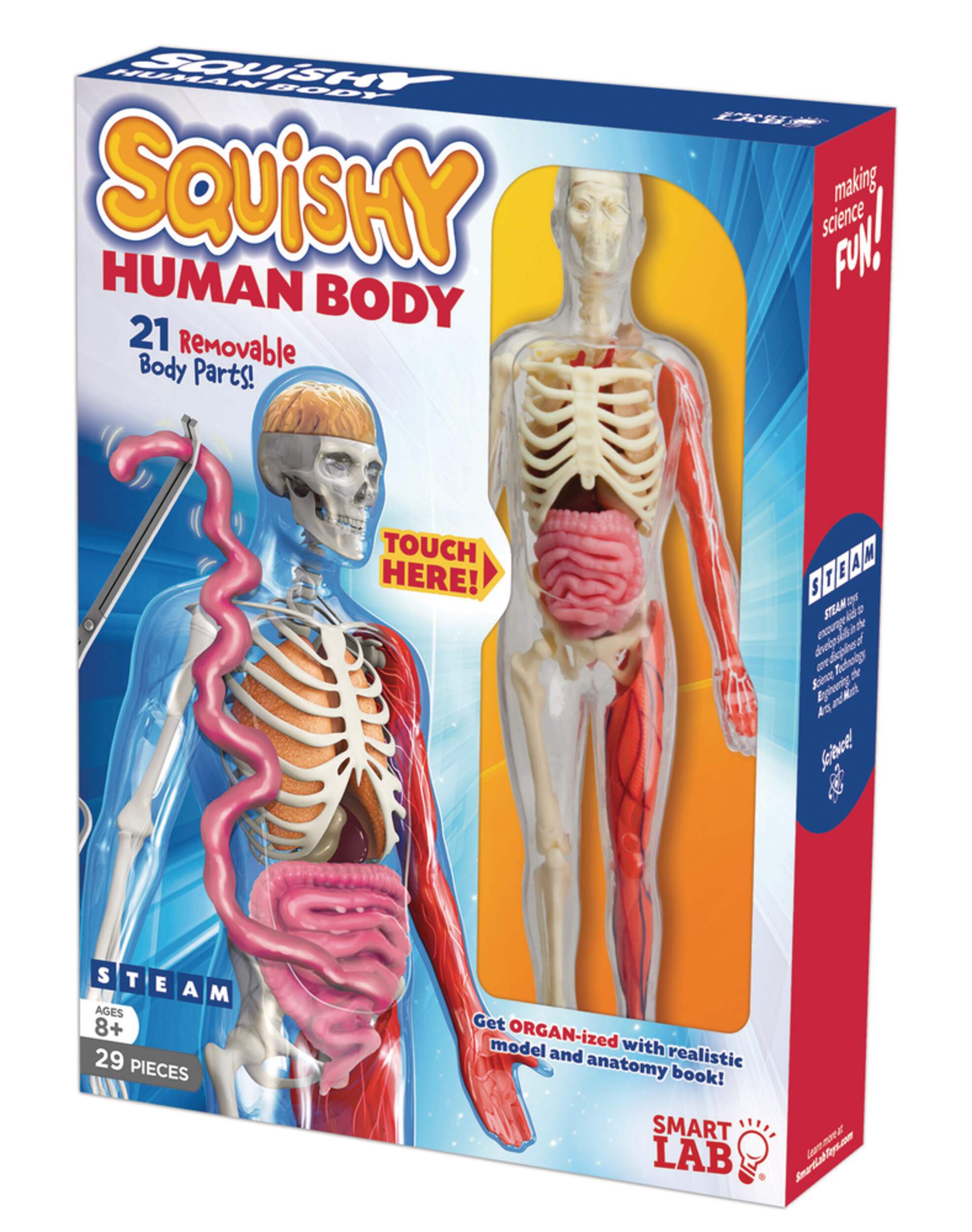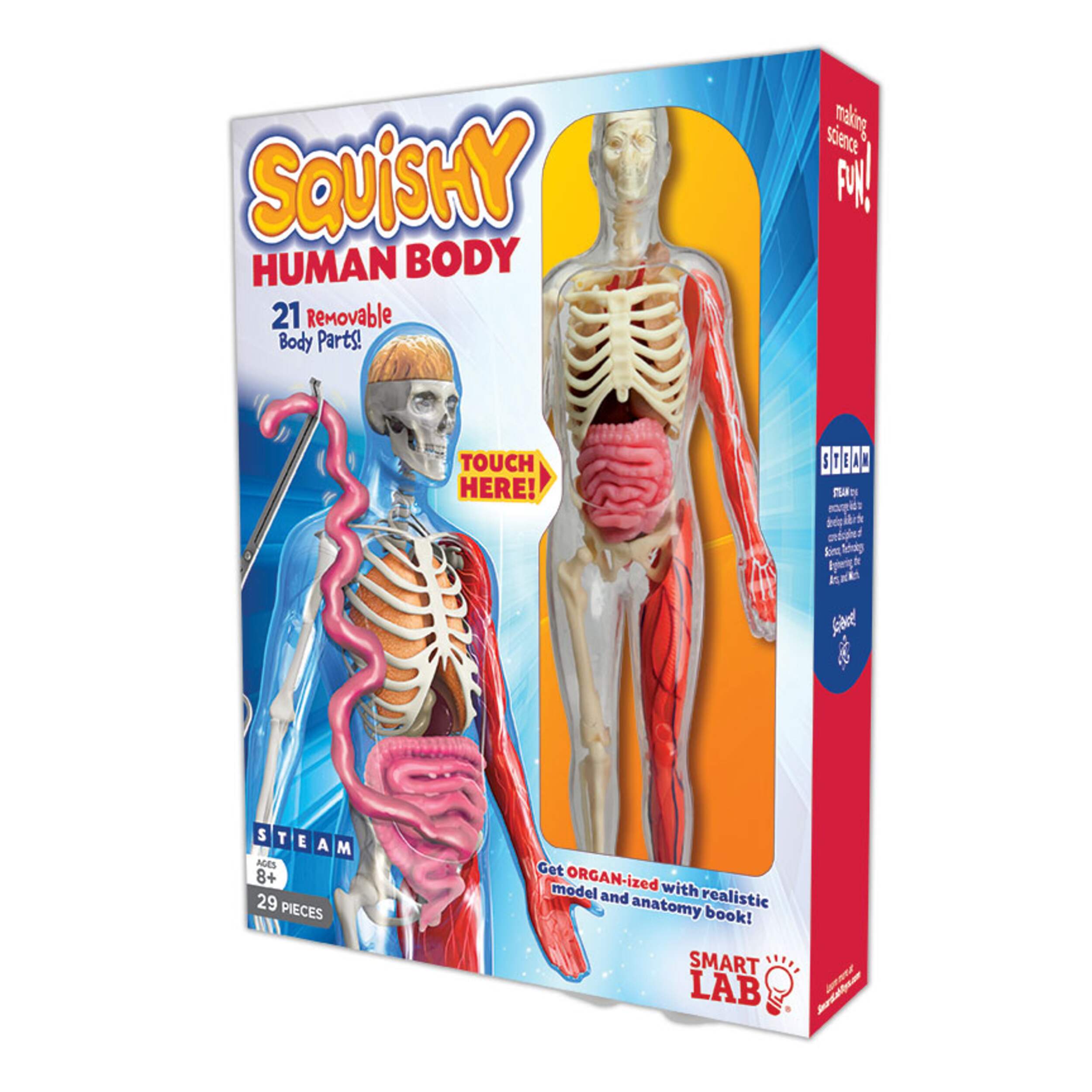 Squishy Human Body by Smart Lab comes with 21 removable body parts and an anatomy book to teach you all about the human body! Explore! Discover! Digest!