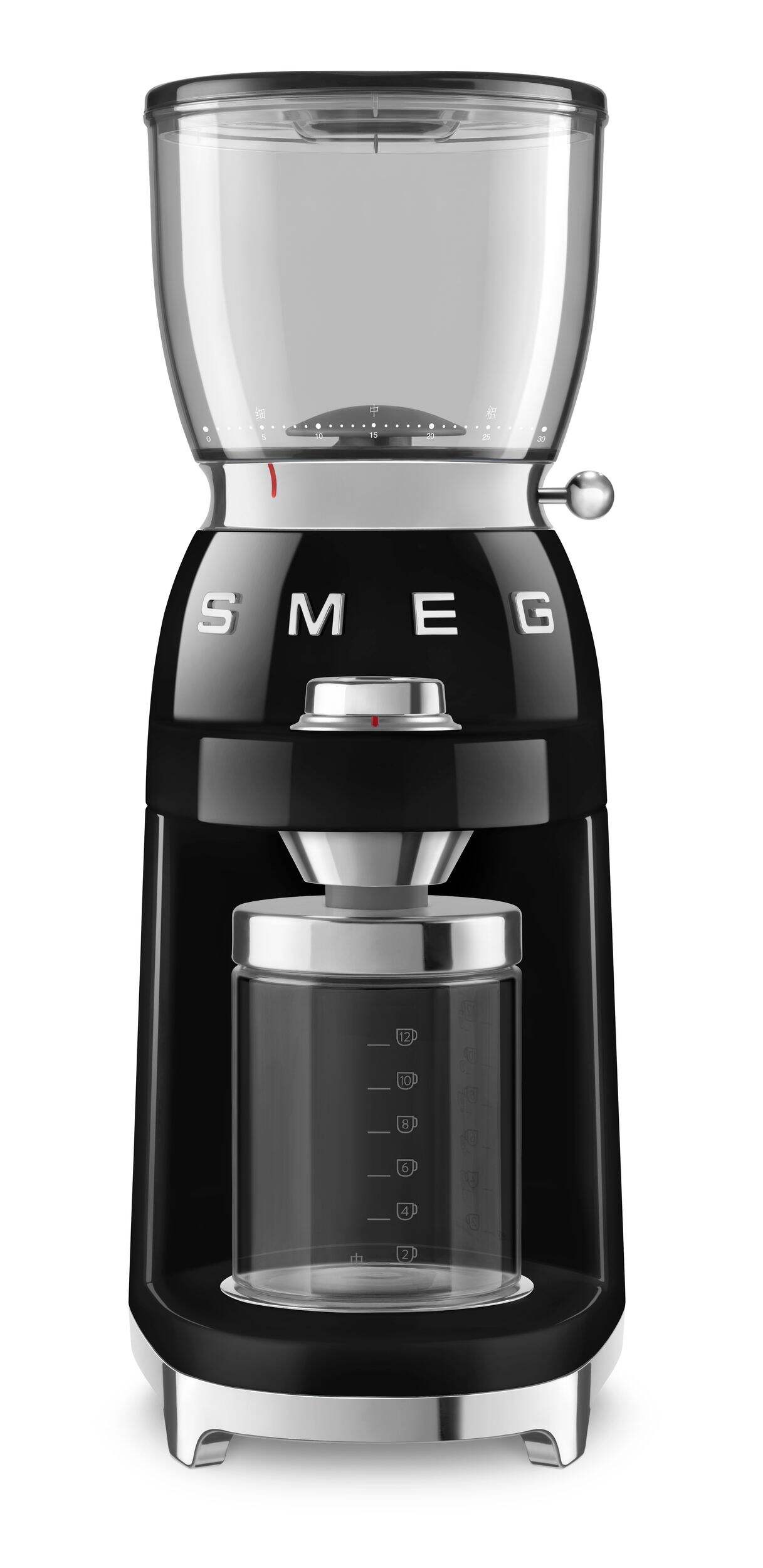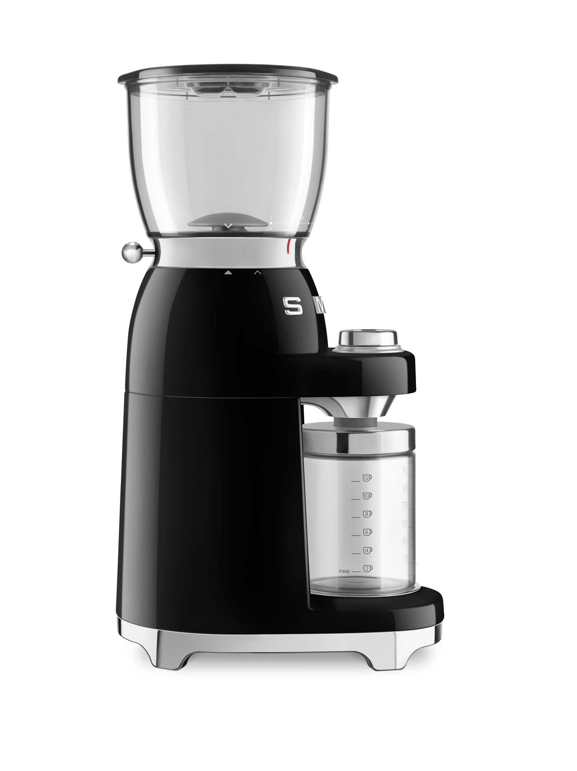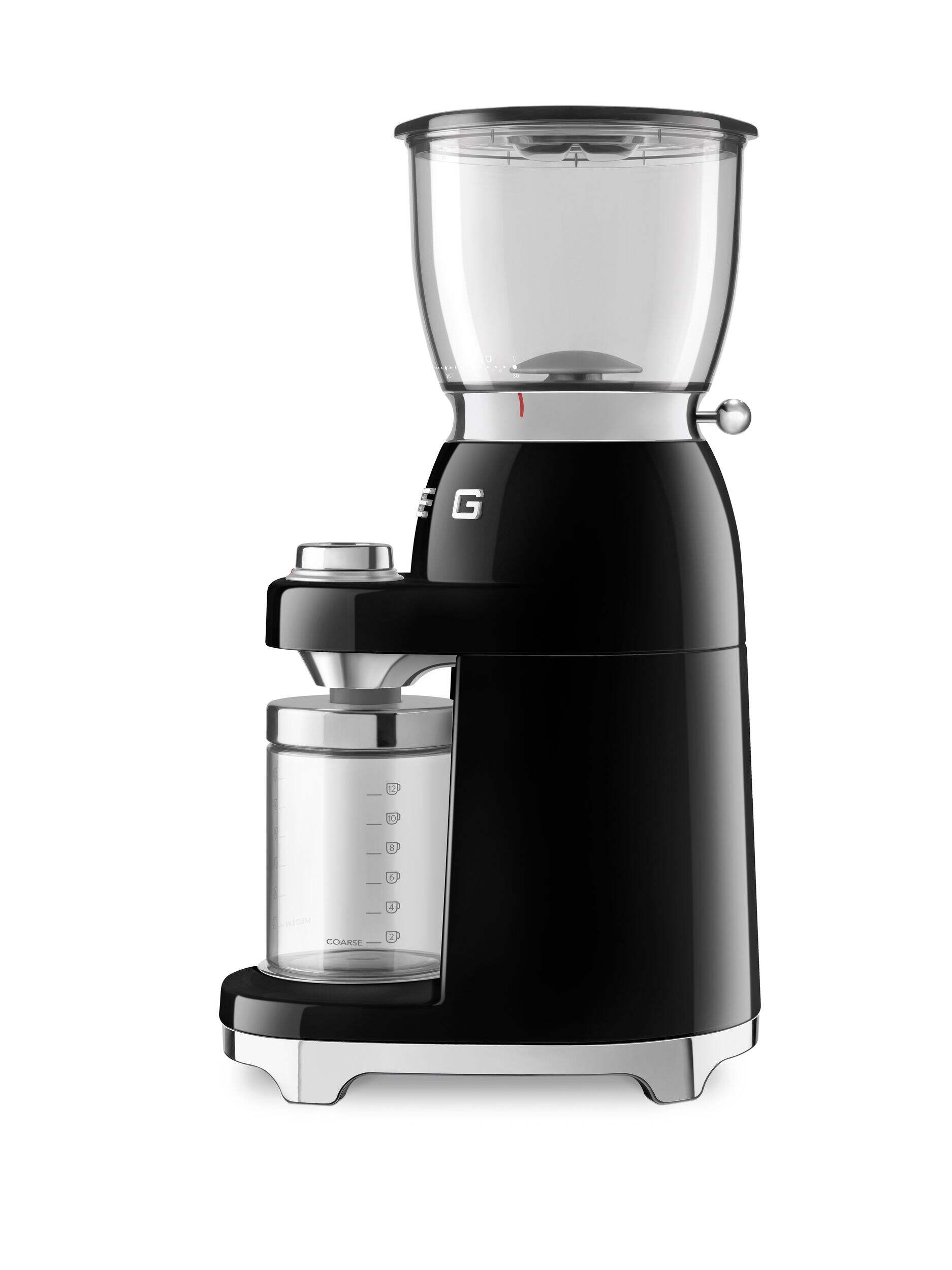 The Smeg 50s Retro Style Countertop Coffee Grinder brings a touch of vintage charm to your kitchen countertop with its unique design. This multi-function coffee grinder with stainless steel conical burrs has up to 30 grinding levels for different coffee extraction methods — from espresso grinding to coarser for filtered coffee. Its conical stainless steel grinders allow for better consistency of the chosen grain size. So, go ahead and enjoy the true aroma of ground coffee.