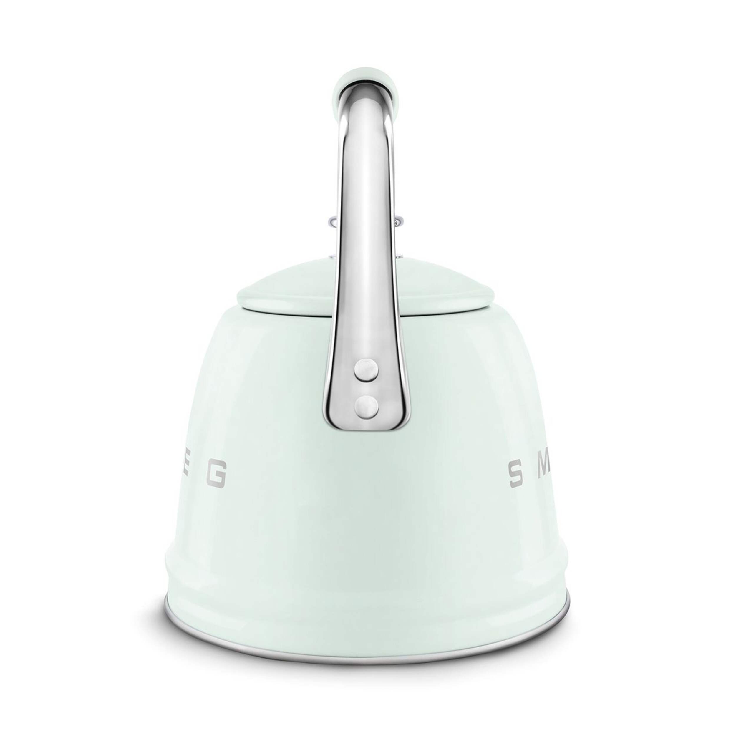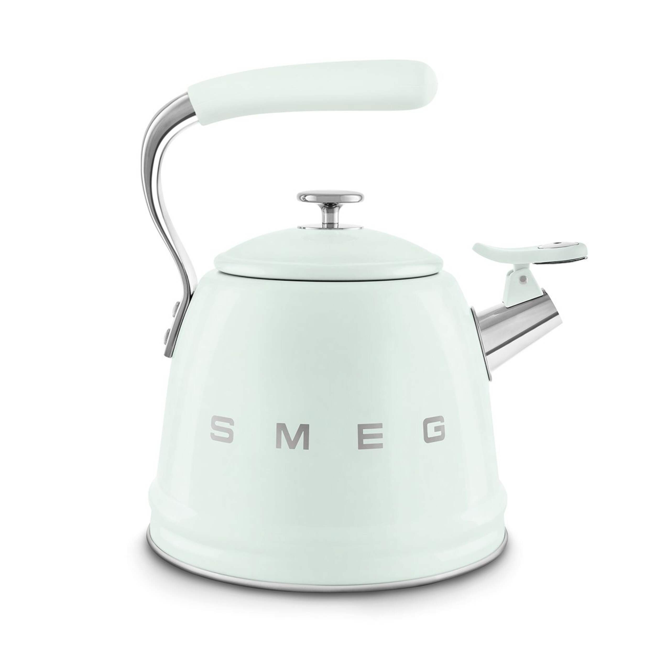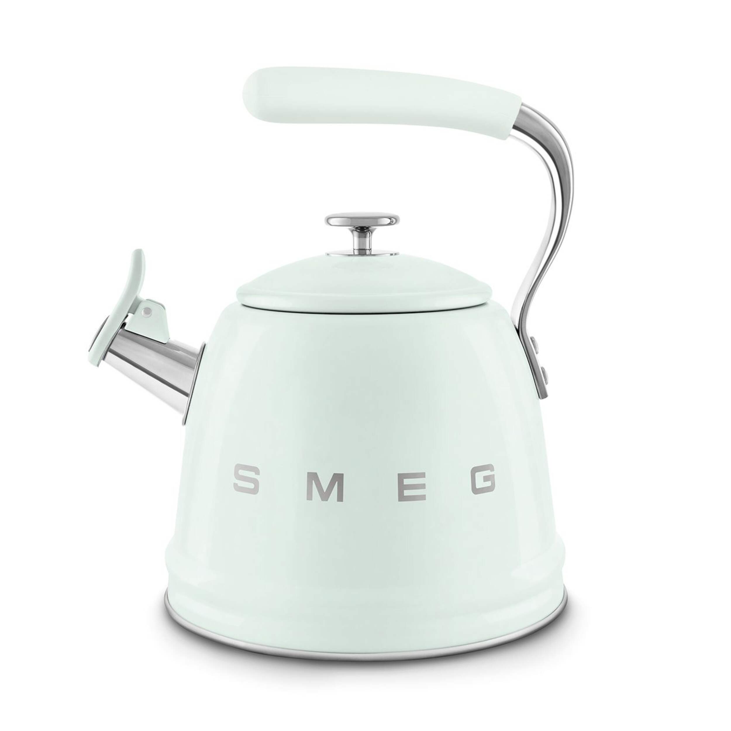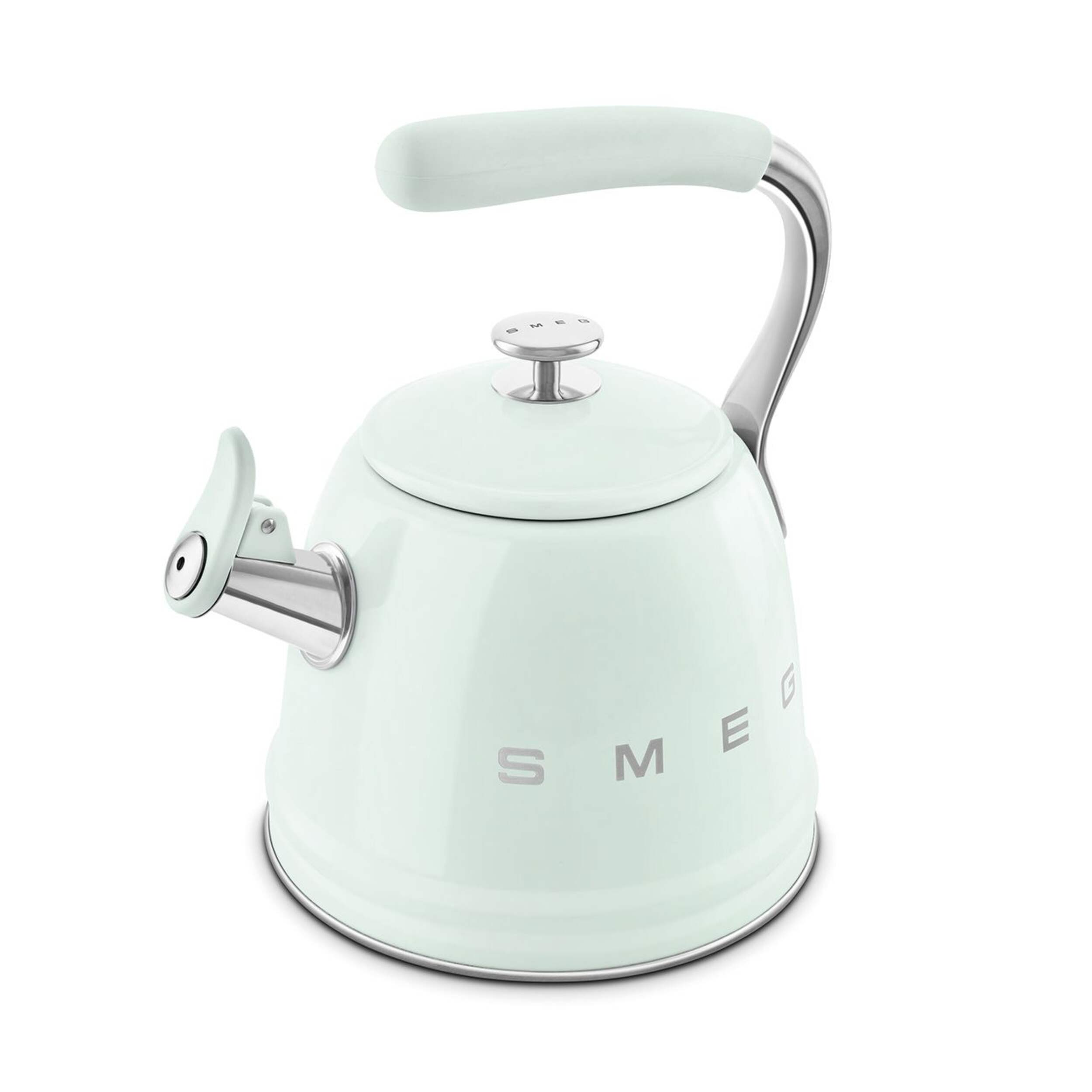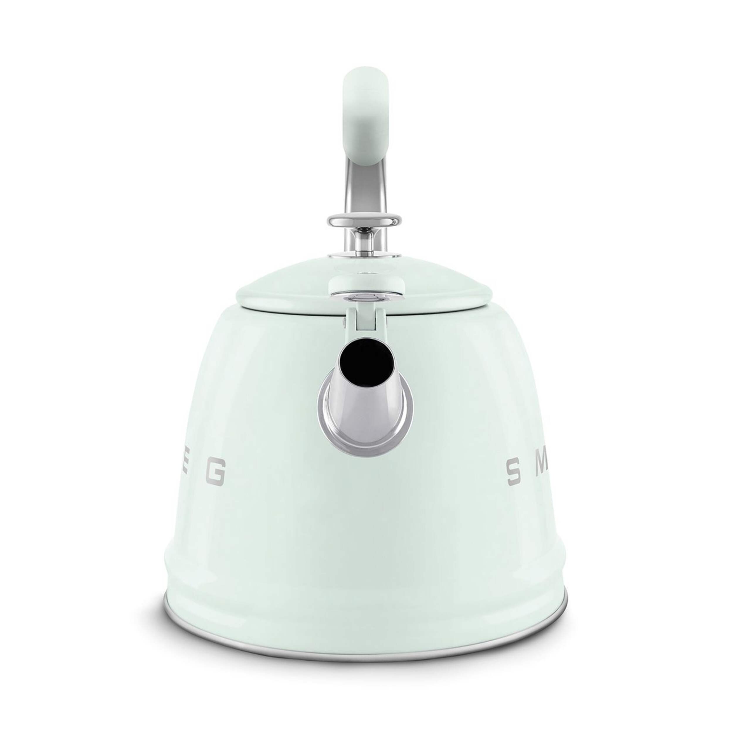 Add a touch of retro elegance to your kitchen with SMEG’s 50s-style whistling kettle. Crafted from durable stainless steel with a glossy pastel green finish, it offers a 2.3 L capacity and is compatible with all cooking surfaces, including induction. Featuring a practical spout cap, ergonomic cool-touch handle, and a single-tone whistle, this kettle combines style, safety, and functionality for everyday use.
