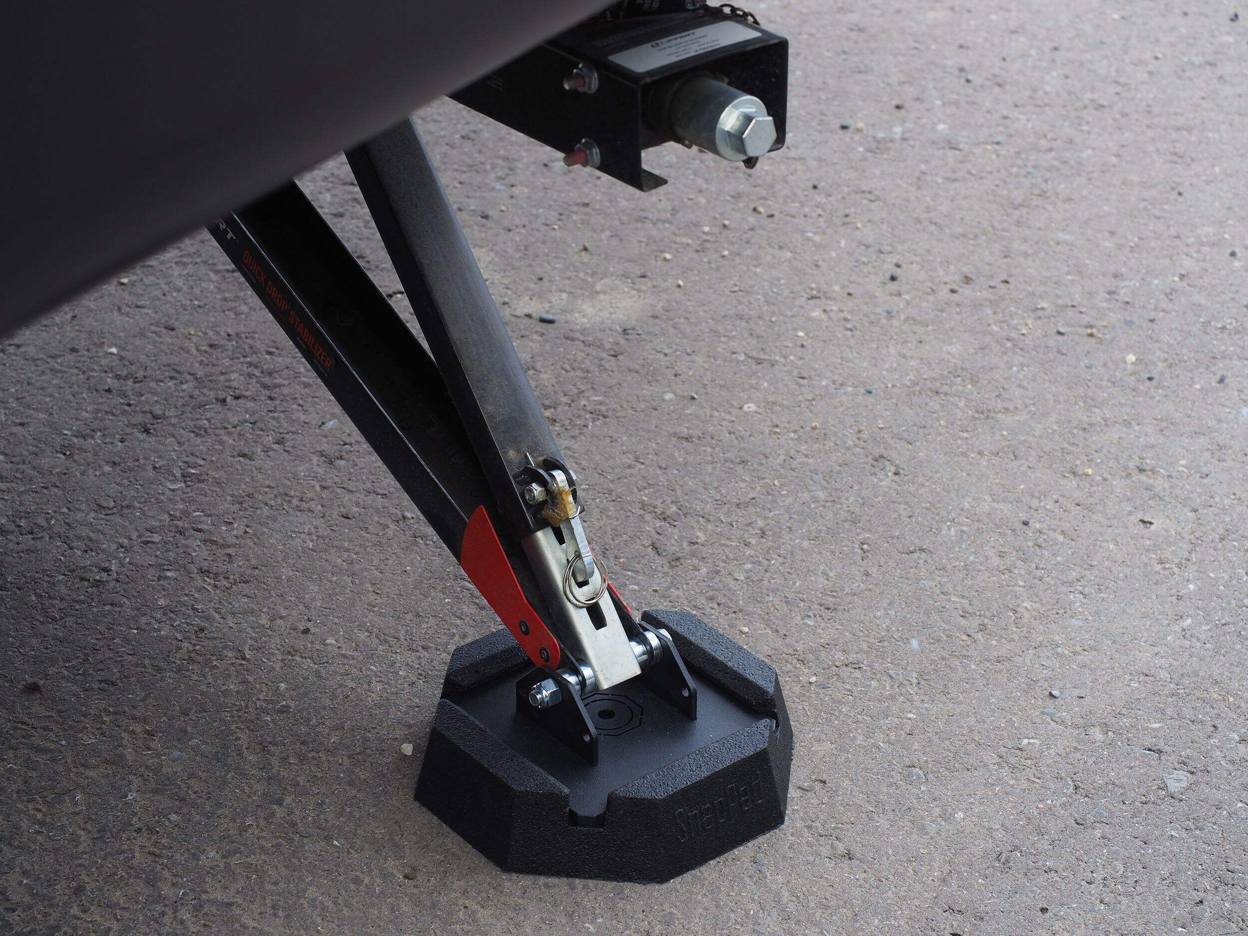 The SnapPad SnapJack QuickDrop QDU4 Conversion Kit for Quickdrop, PSX1, PSX1 level systems provides a quick and easy upgrade to stabilize Quickdrop jacks. The rubber SnapJack foot pads increase the footprint, dampen vibrations, and conform to uneven terrain like gravel, preventing sinking or shifting of your jack. Durable recycled tire crumb and high-strength resin hold their shape under heavy loads. With a textured grip, these SnapJacks fit Quickdrop, PSX1, PSX2 level systems and boost stability on any surface. The included 1/4-inch thick powder coated steel plate provides a sturdy base. Get improved convenience with this upgrade.