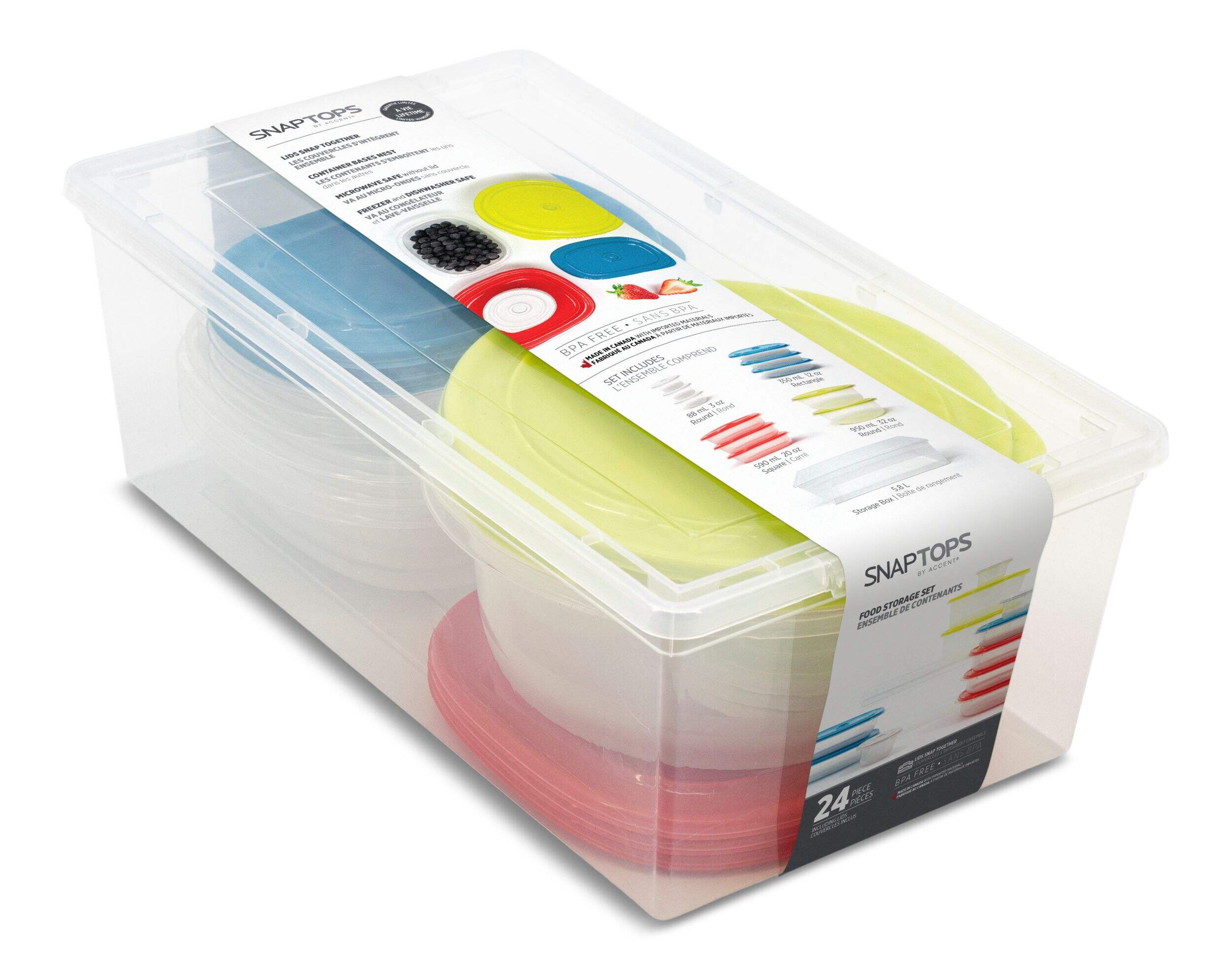 Injection molded polypropylene containers featuring a unique lid design that allows all shapes and sizes to snap together. Graduated sizing makes Snaptops stackable and nestable for space saving storage.