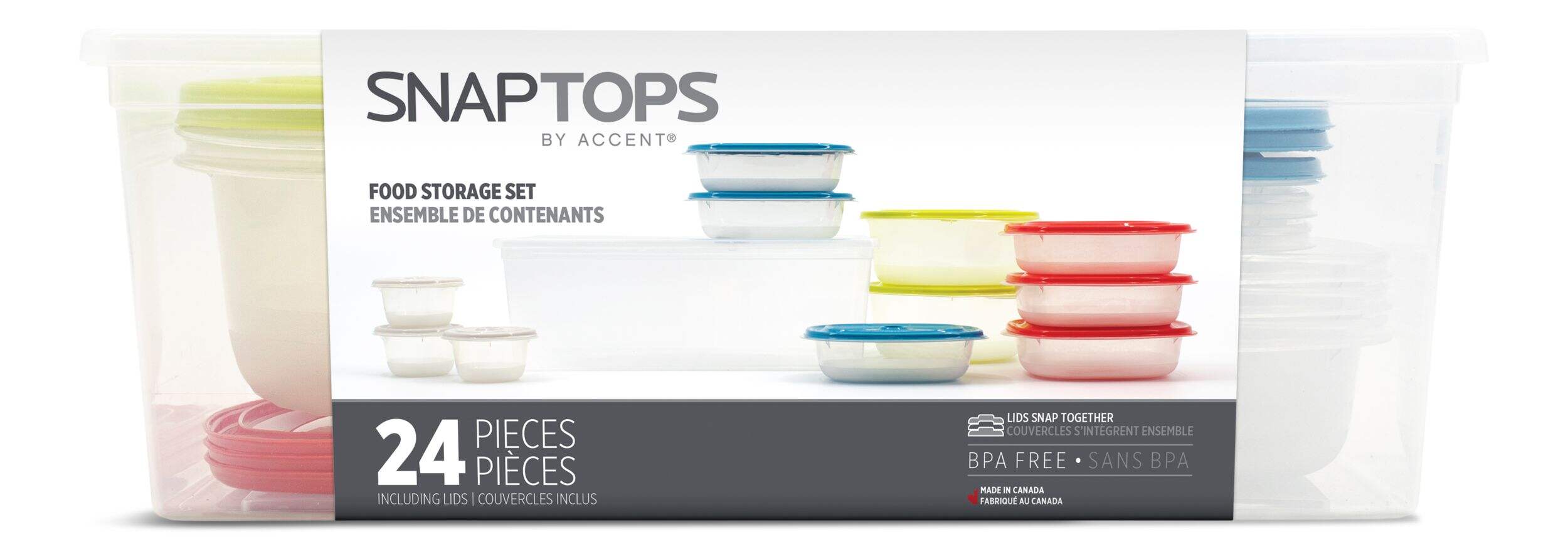 Snaptop Food Storage Set comes with graduating sized containers with unique lids