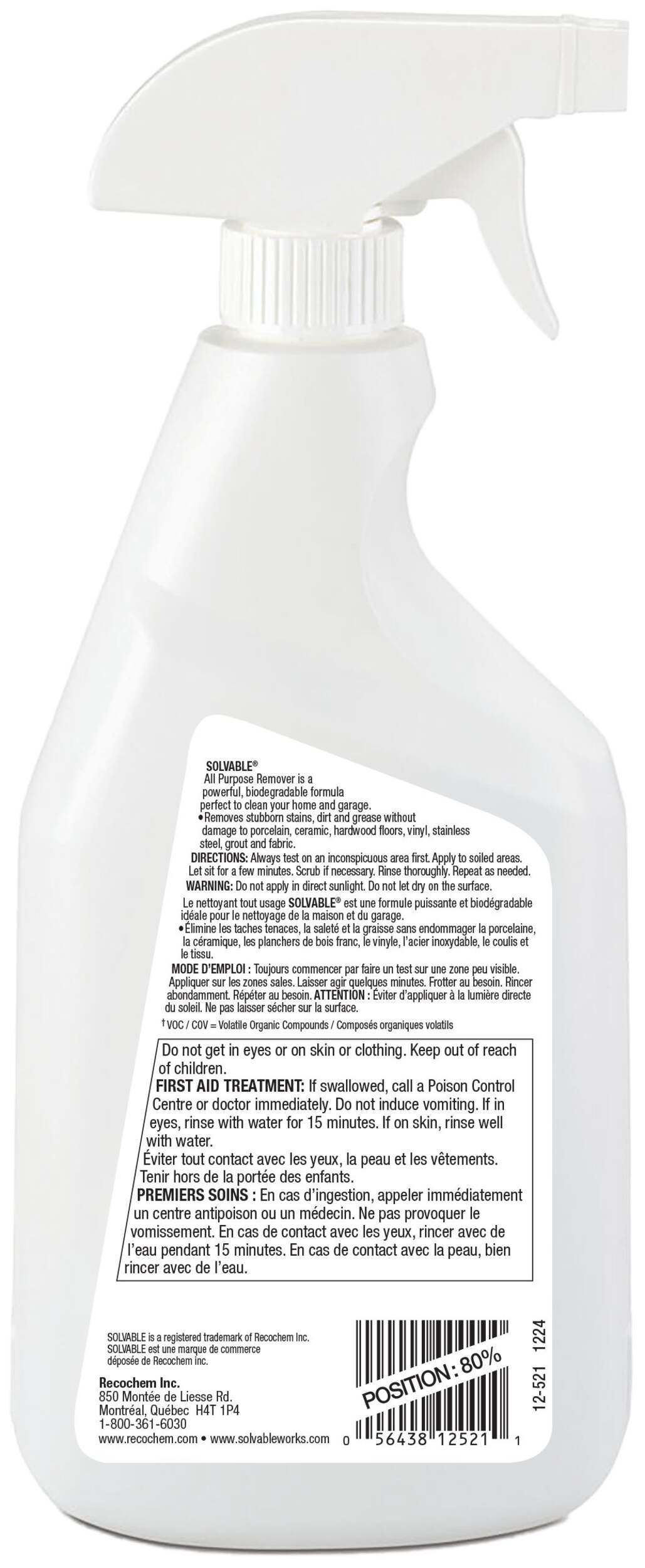 SOLVABLE® All Purpose Remover is a versatile and powerful cleaning solution for your home and garage. Its biodegradable formula removes stubborn stains, dirt, and grease without damaging delicate surfaces like porcelain, ceramic, hardwood floors, vinyl, stainless steel, grout, and fabric. Safe and effective, it simplifies cleaning with ease.