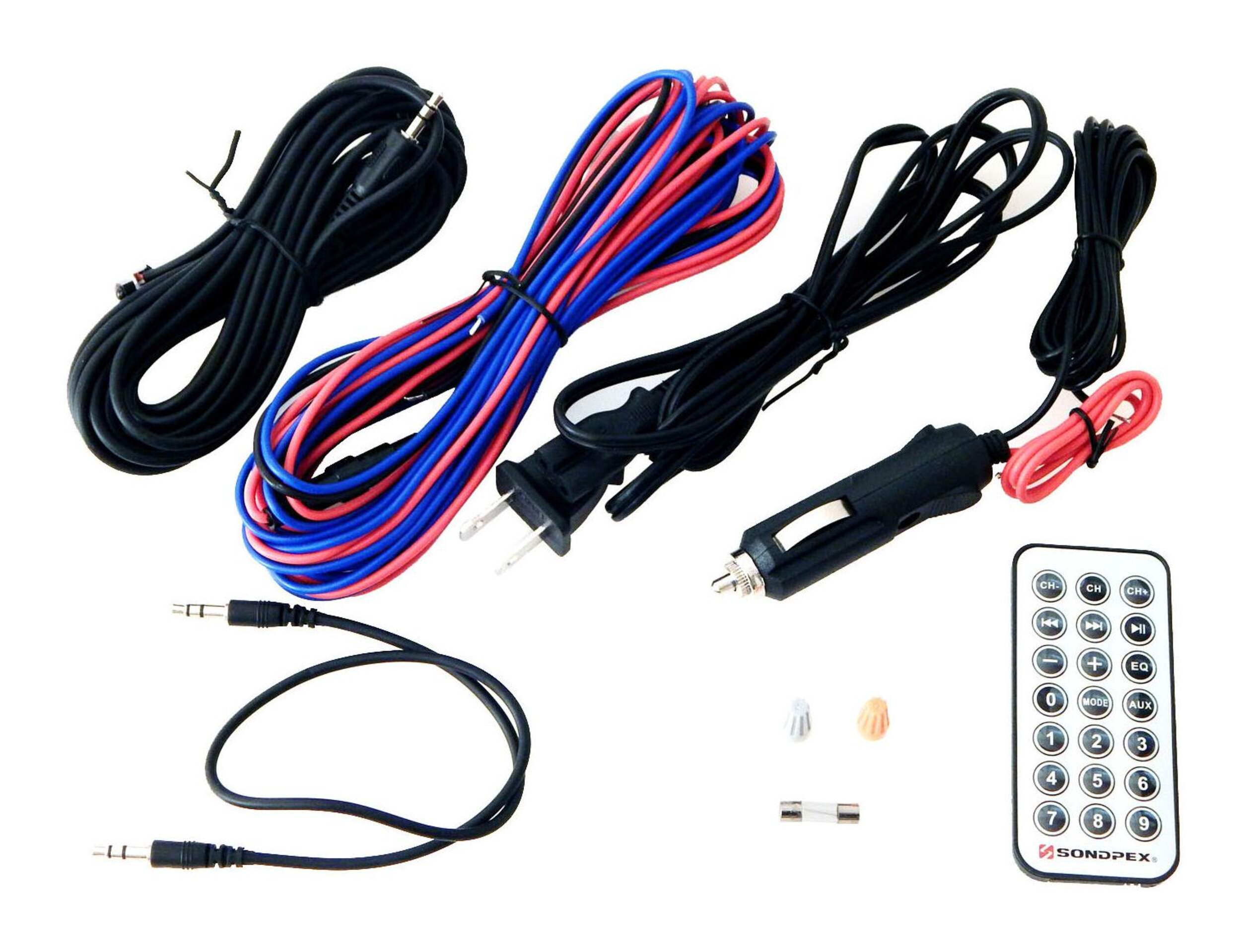 Includes: Remote control, 12V power cable wiring kit, IR remote cable, and 3.5mm M/M audio cable
