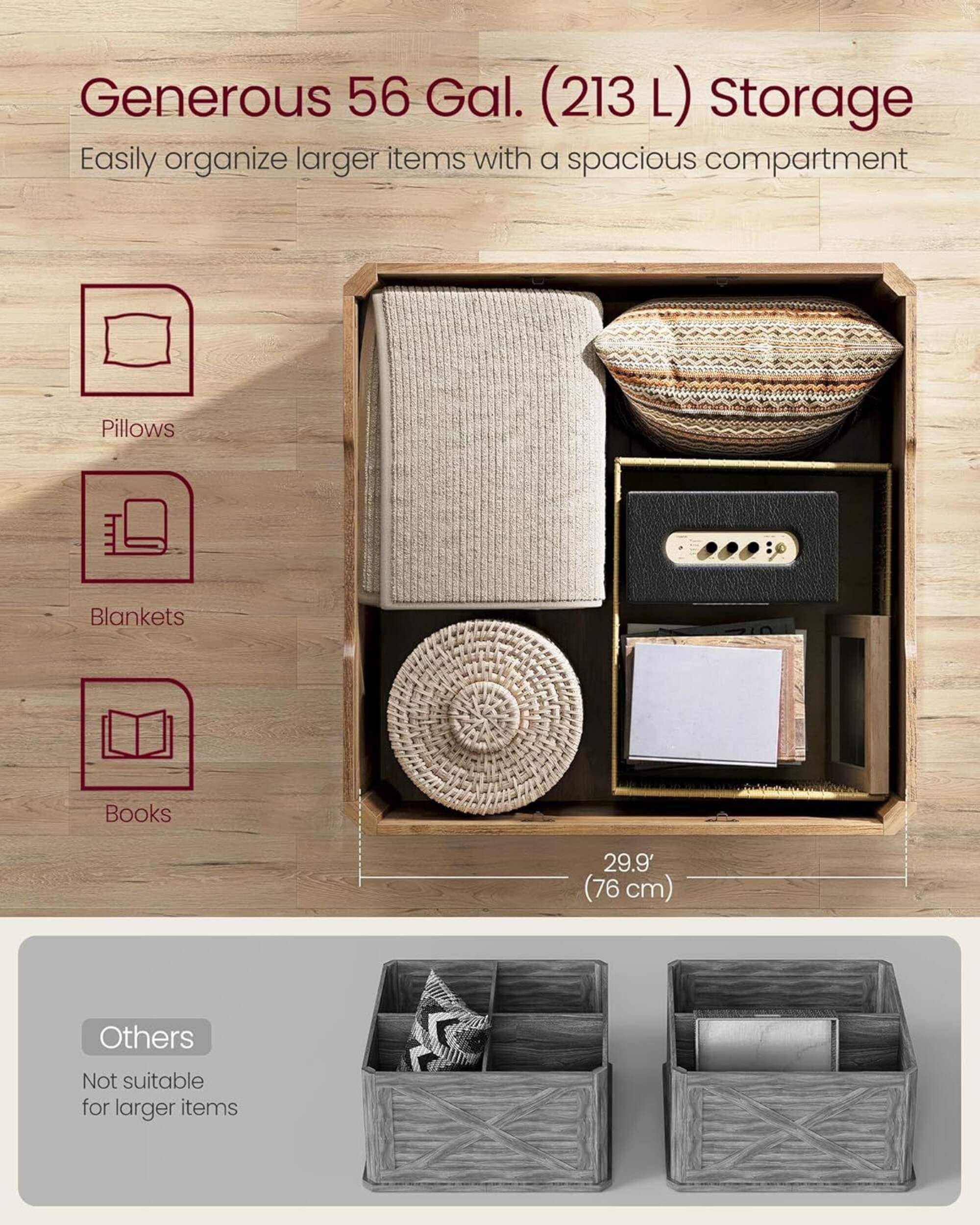 Spacious hidden storage with a 56-gallon compartment for blankets, pillows, books, and other items