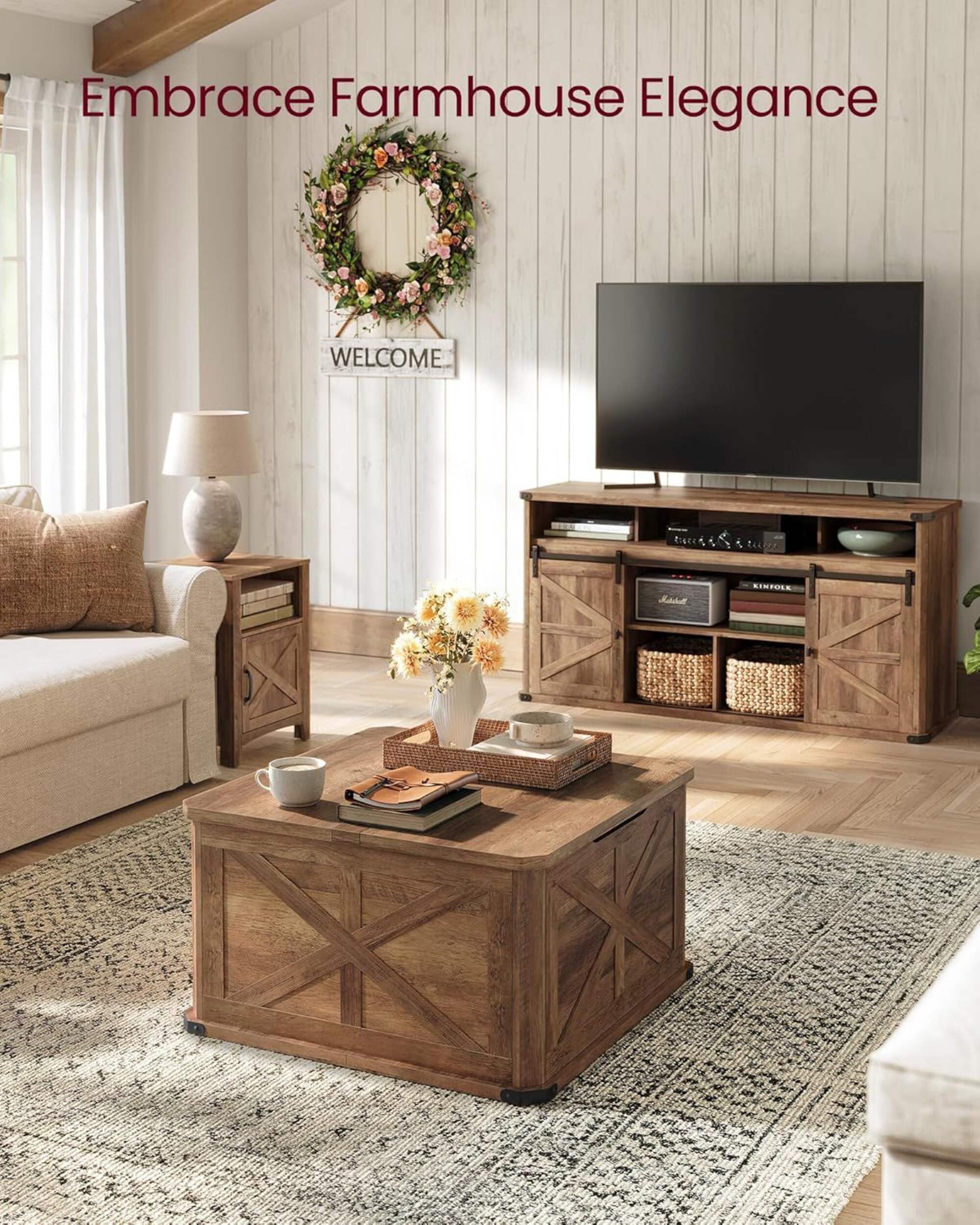 Farmhouse chic design with barn door aesthetic and metal bottom corner accents
