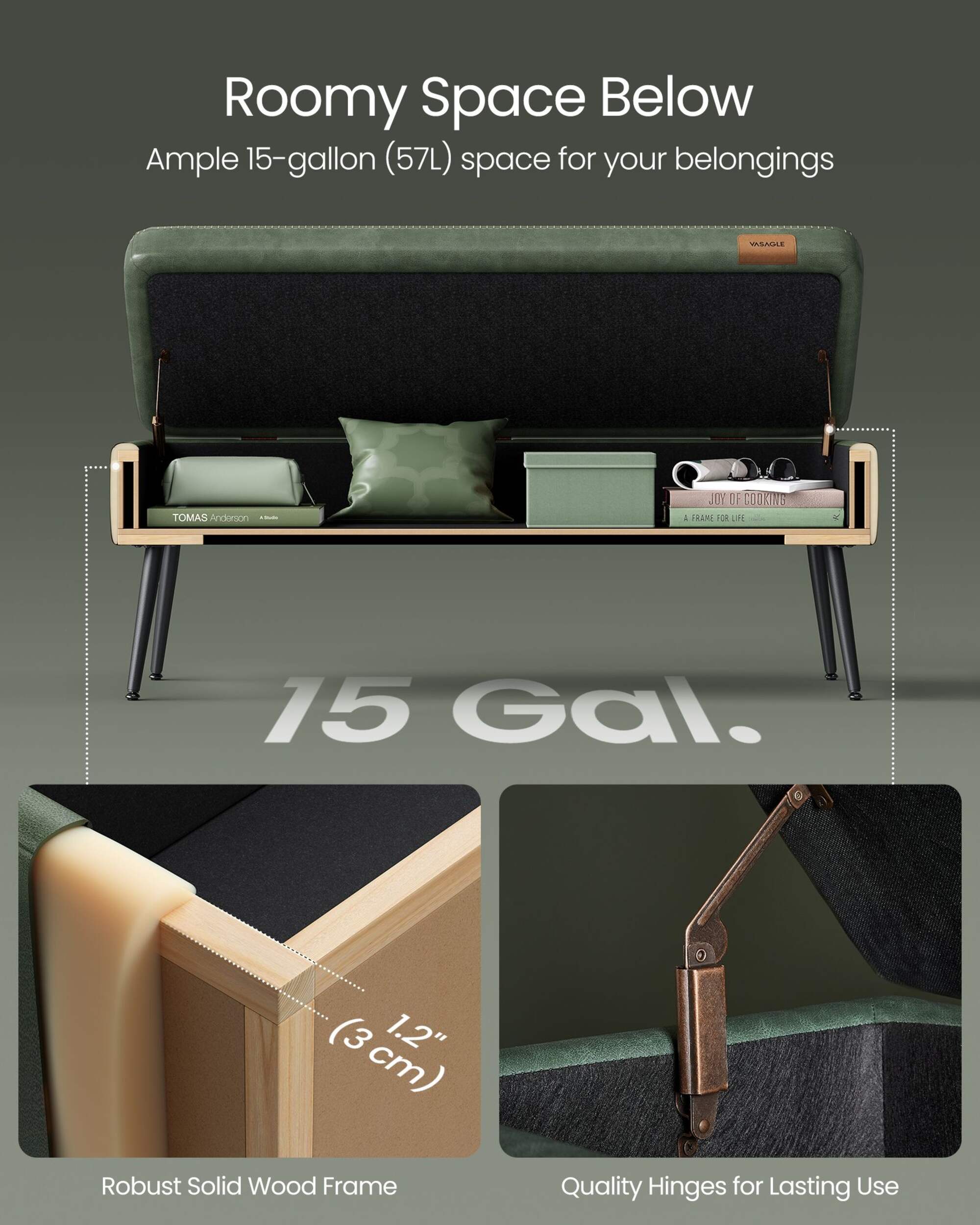 15-Gallon (58 Litres) spacious storage with safety hinges: Tame clutter with a massive hidden compartment that effortlessly stores blankets, pillows, seasonal clothing, shoes, and toys