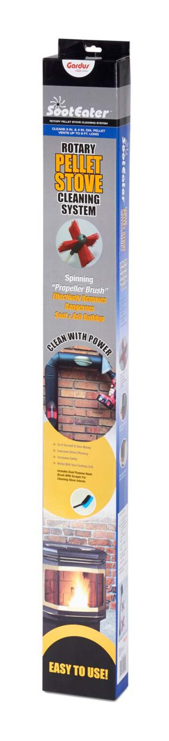 The SootEater Rotary Pellet Stove Cleaning System is designed to clean both 3" (7.6 cm) and 4" (10.2 cm) pellet vents. This system effectively decreases the risk of flue fire by removing soot and ash build-up, improving the efficiency of your pellet stove. The cleaning system uses flexible 8mm nylon screw-connect extension rods for a powerful rotating forward action. It can navigate multiple bends in vent systems, and features a replaceable whip line. The product works with cordless drills and includes three 3’ (1 m) flexible screw-connect extension rods, two propeller brushes, a long handle stove cleaning brush with scraper, and a user guide.
