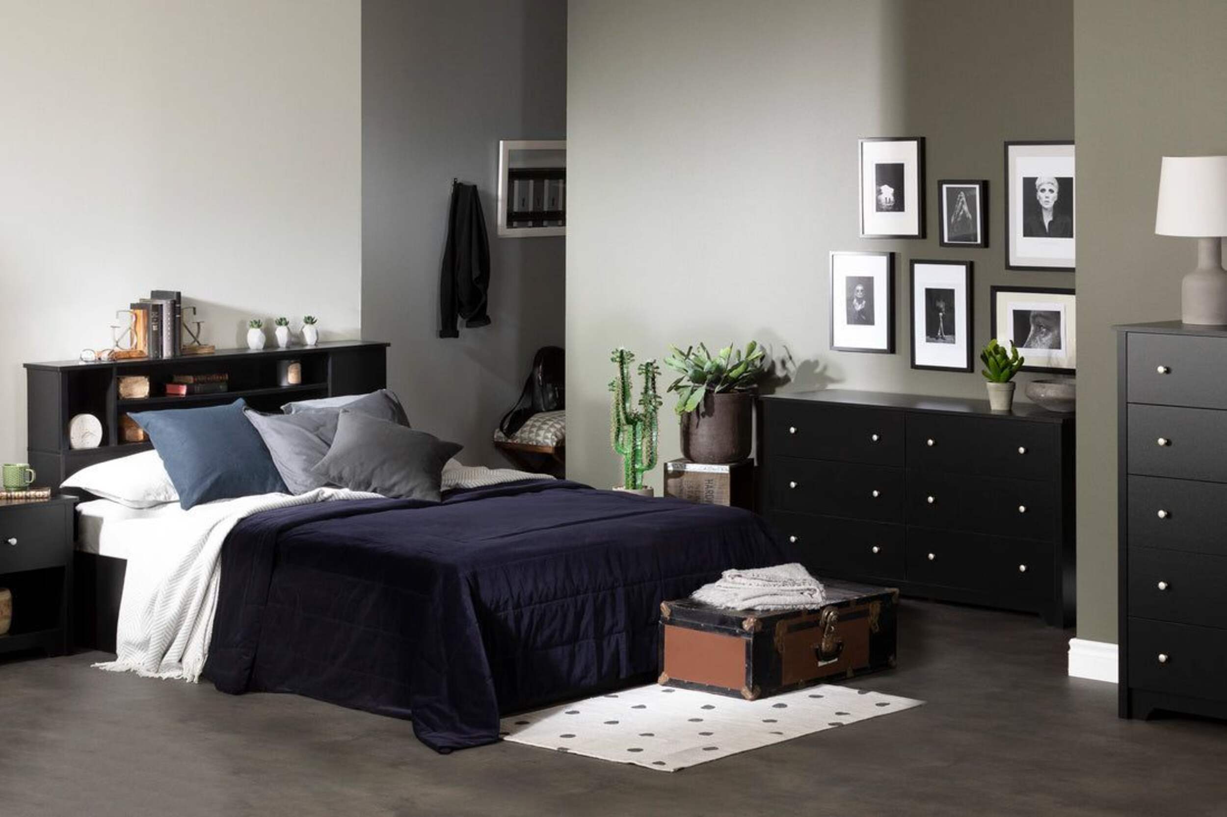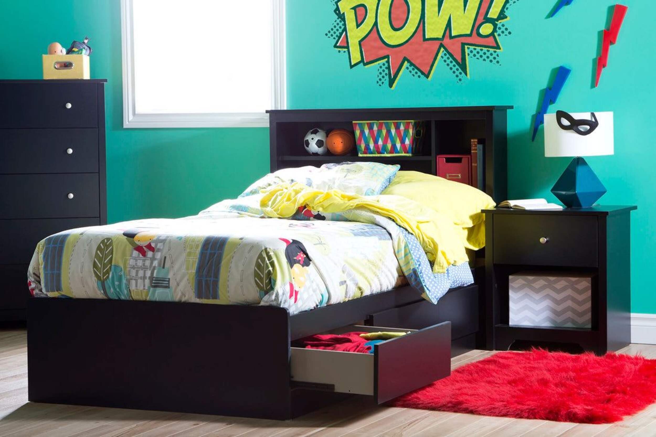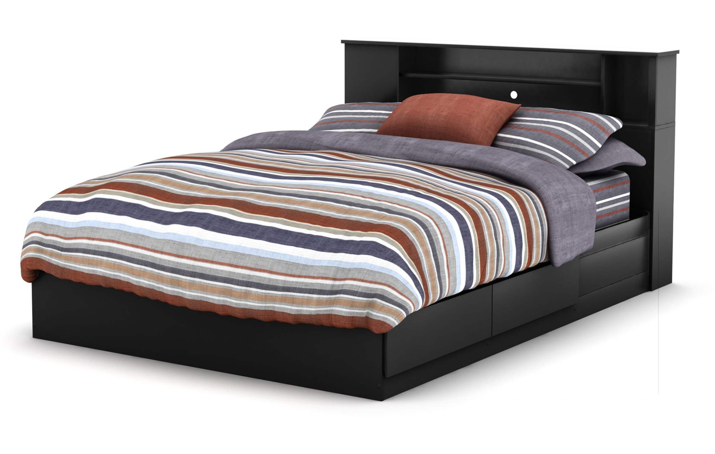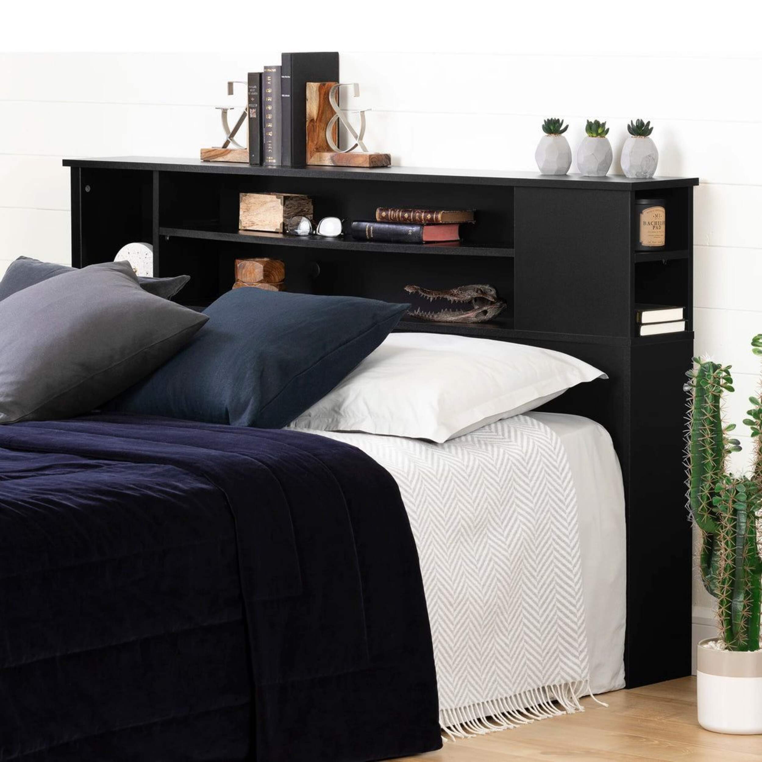BEDSIDE STORAGE: Providing multiple practical and accessible storage spaces within easy reach, the bookcase headboard has fixed shelves and additional storage on one side