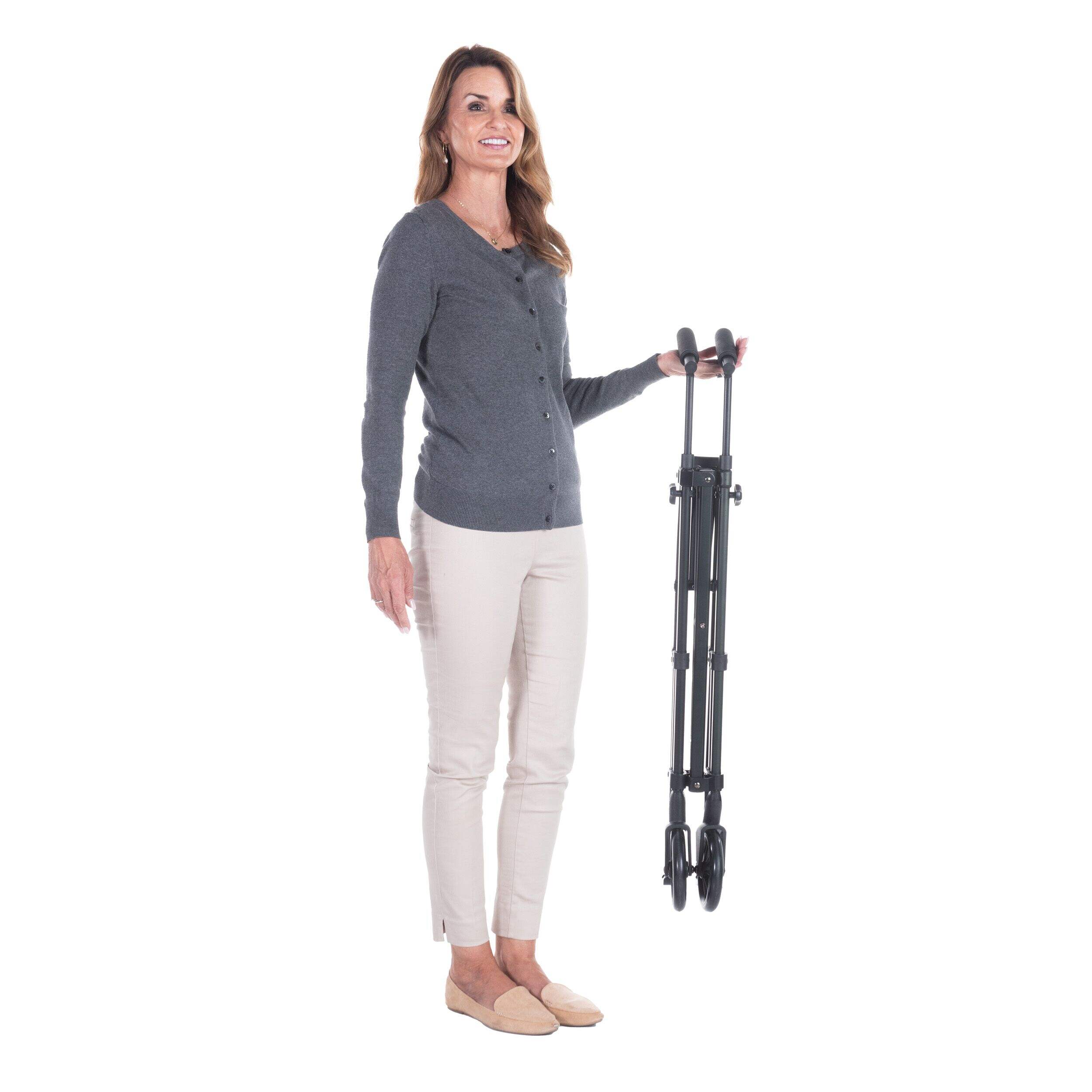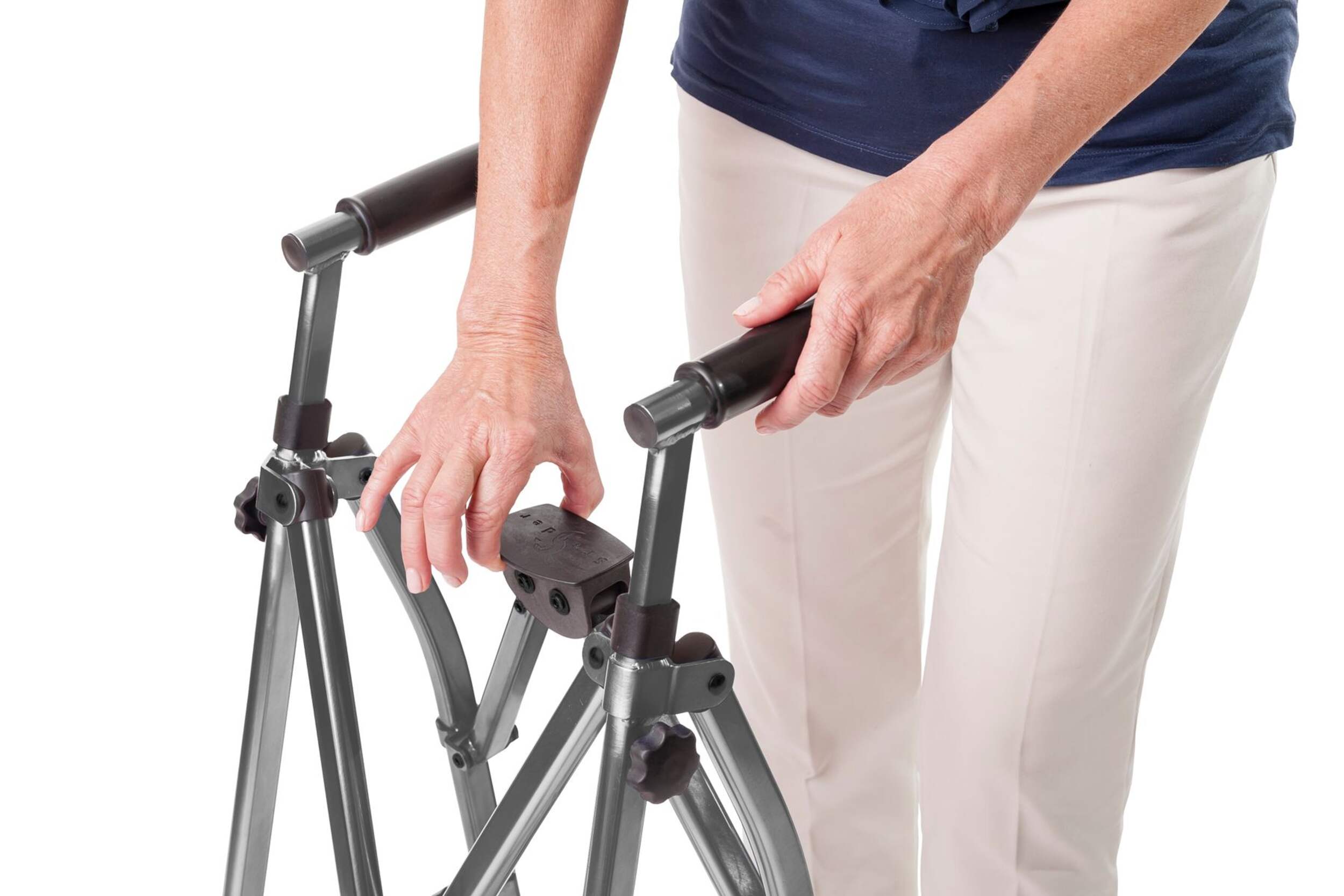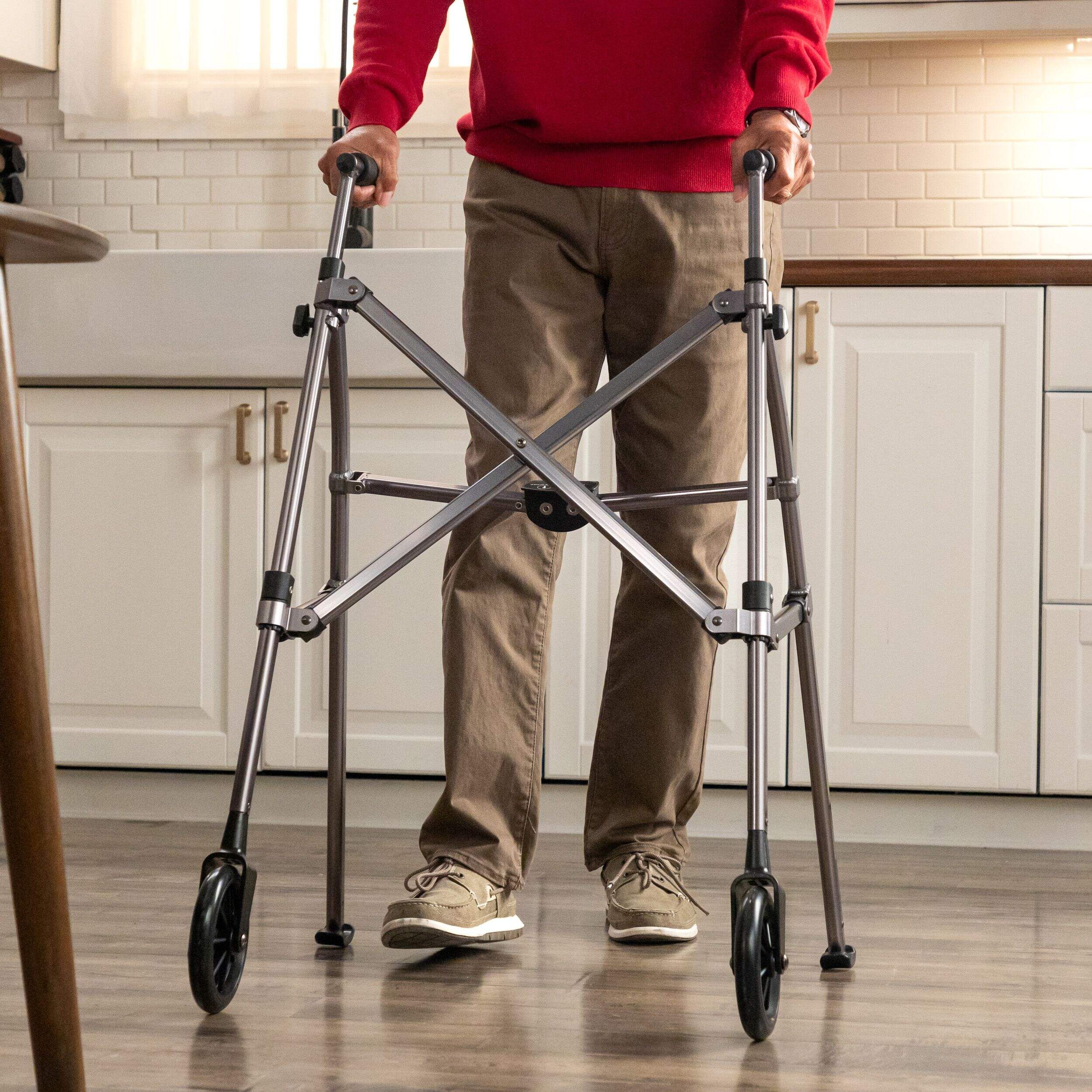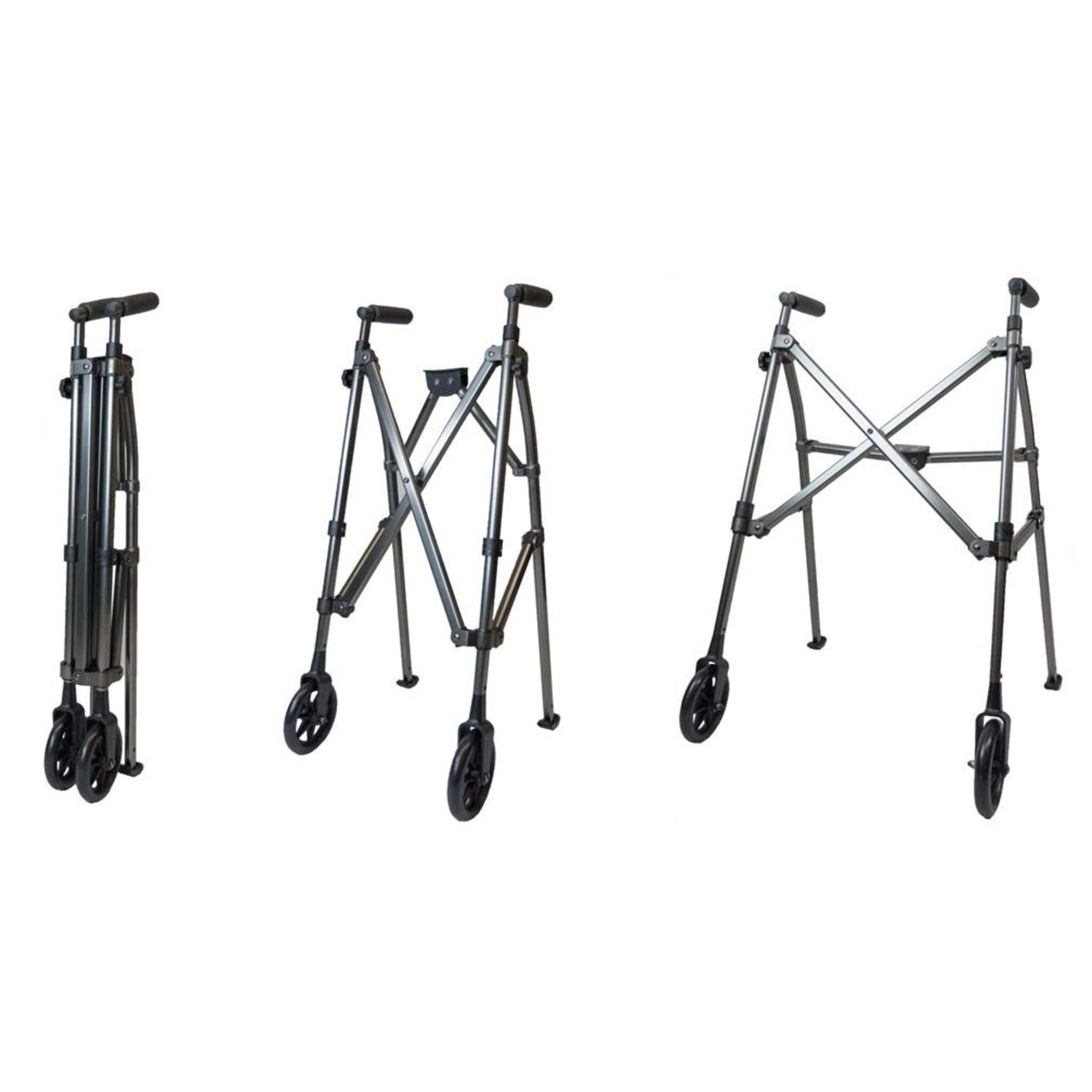 The Space Saver Adjustable Walker folds four times smaller than the average walker yet supports up to 181 kgs. This lightweight aluminum walker is easy to transport and store. It features two front wheels for maneuverability and rear ski glides for stability. The space saver adjustable walker offers a safe walking aid that is foldable and portable.