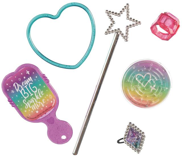 Little girls will go crazy for these party favors featuring a star wand, rings and mirror. Simply slide the plastic goodie bag items into treat bags for an instant hit at your child's birthday bash. Kids will have fun exploring their inner princess with the festive sparkly accessories, perfect for an at-home pretend play party.