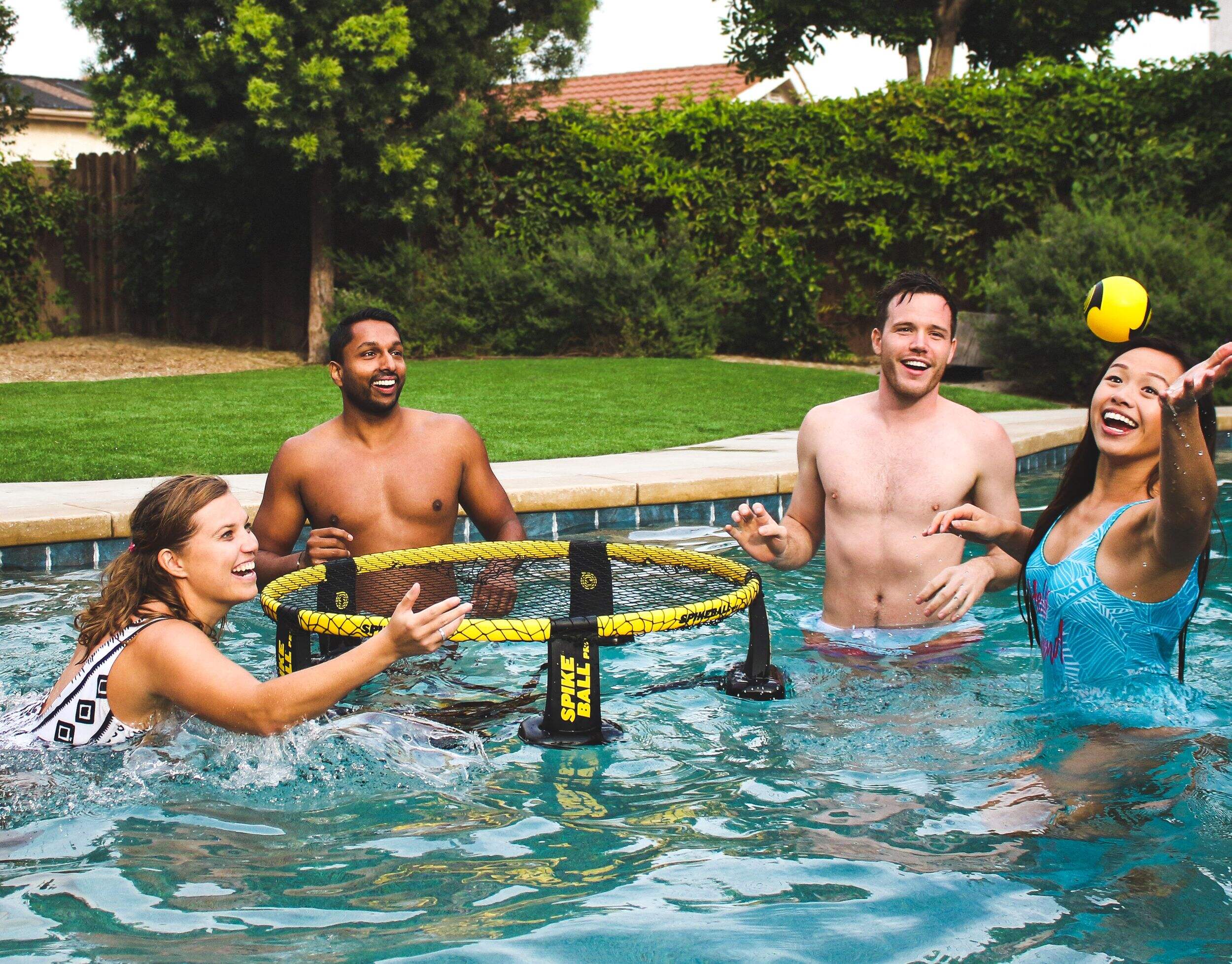 Standard Spikeball rules with one exception: any shot that lands outside the pool is out of bounds