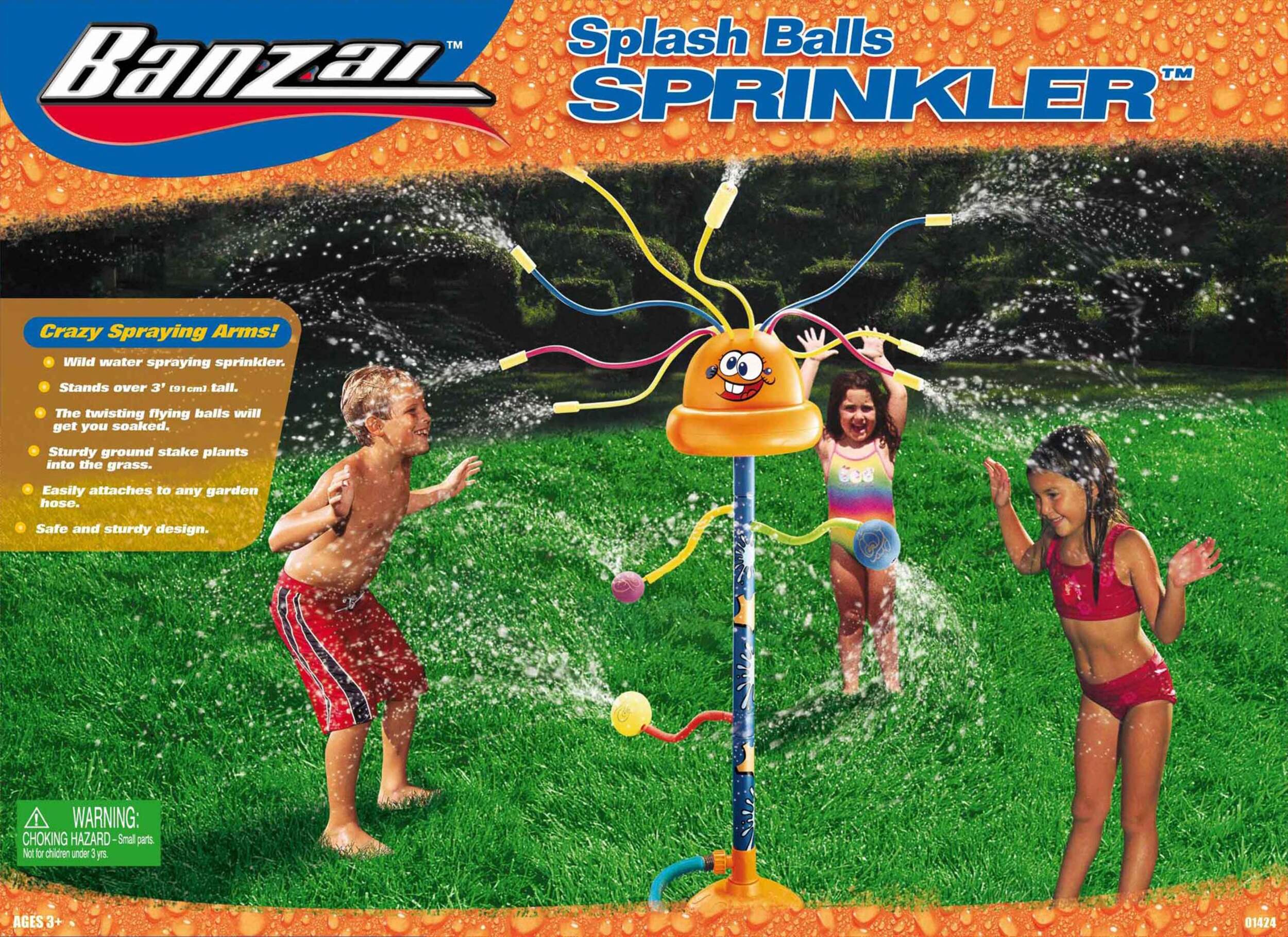 Splash balls sprinkler has wacky twisting balls and hose ends that soak you with its powerful water blasting action