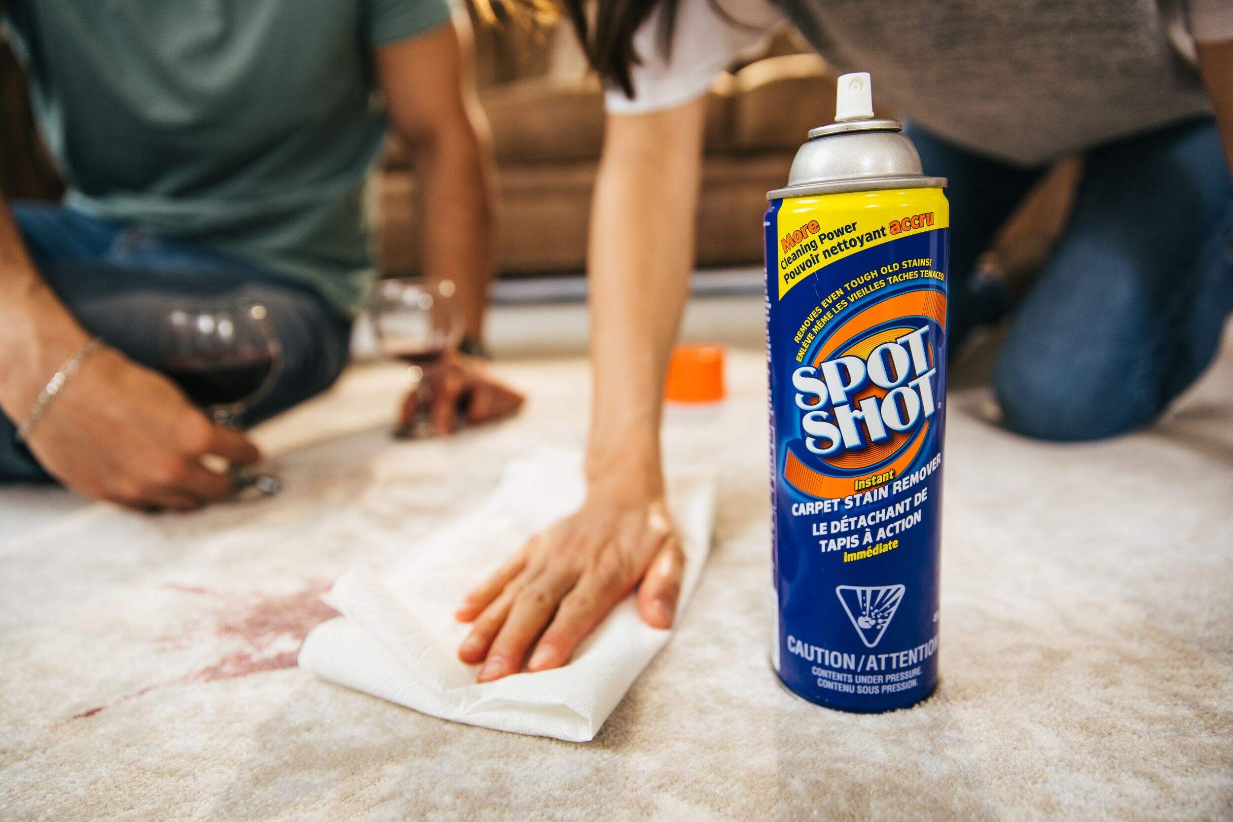 Spot Shot Aerosol Stain Remover works on pet stains, coffee, spaghetti sauce, marker wine, grease, oil and more