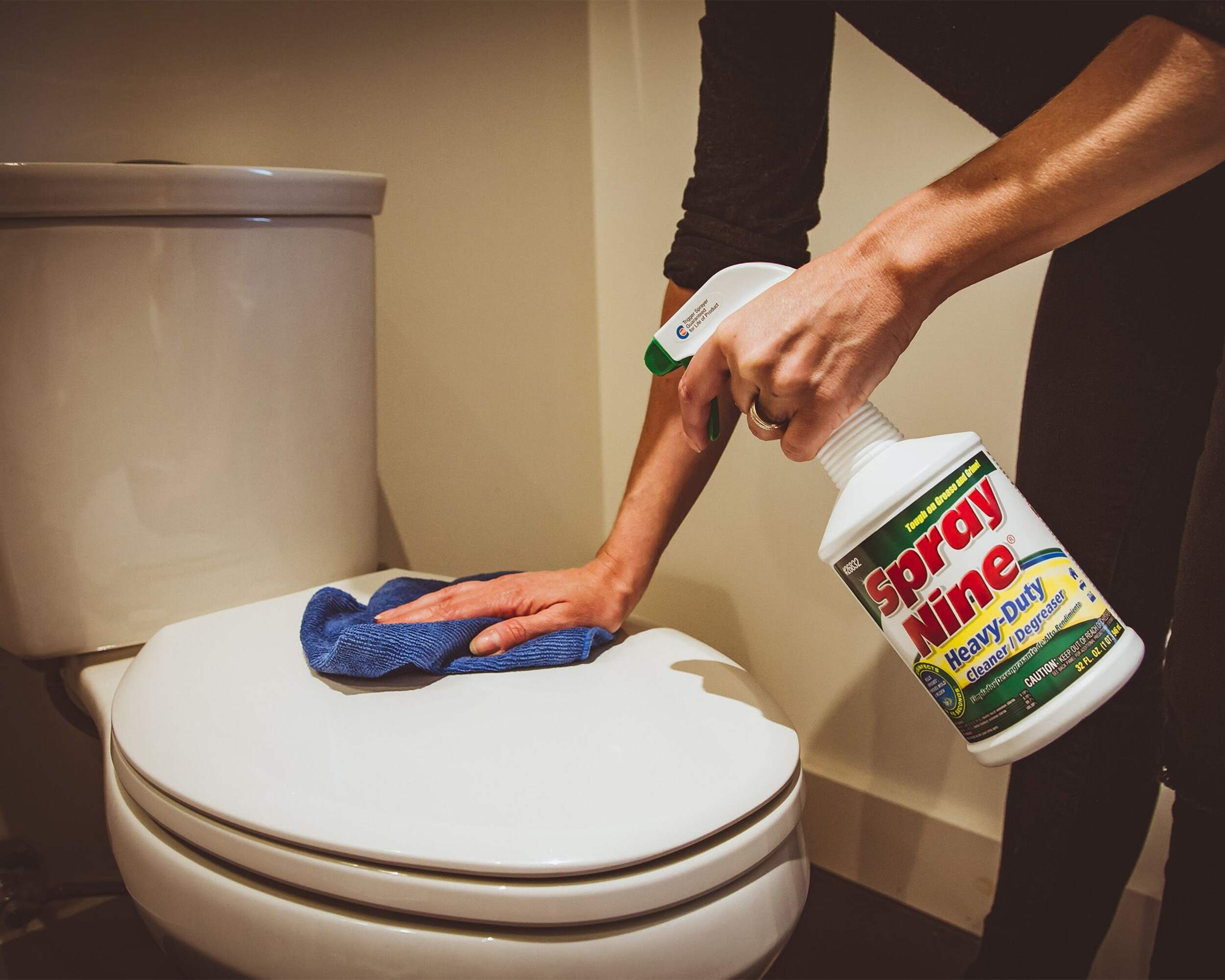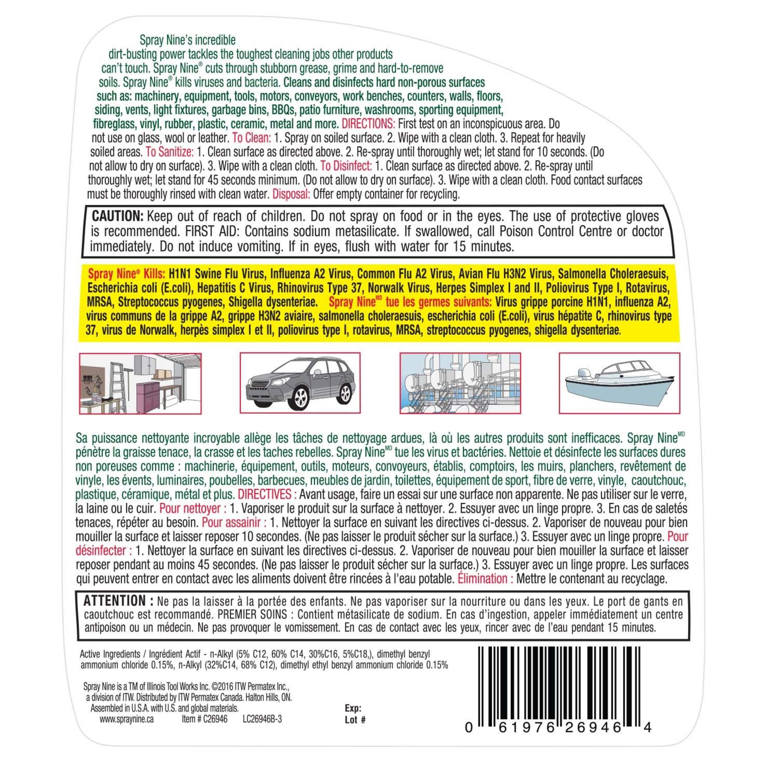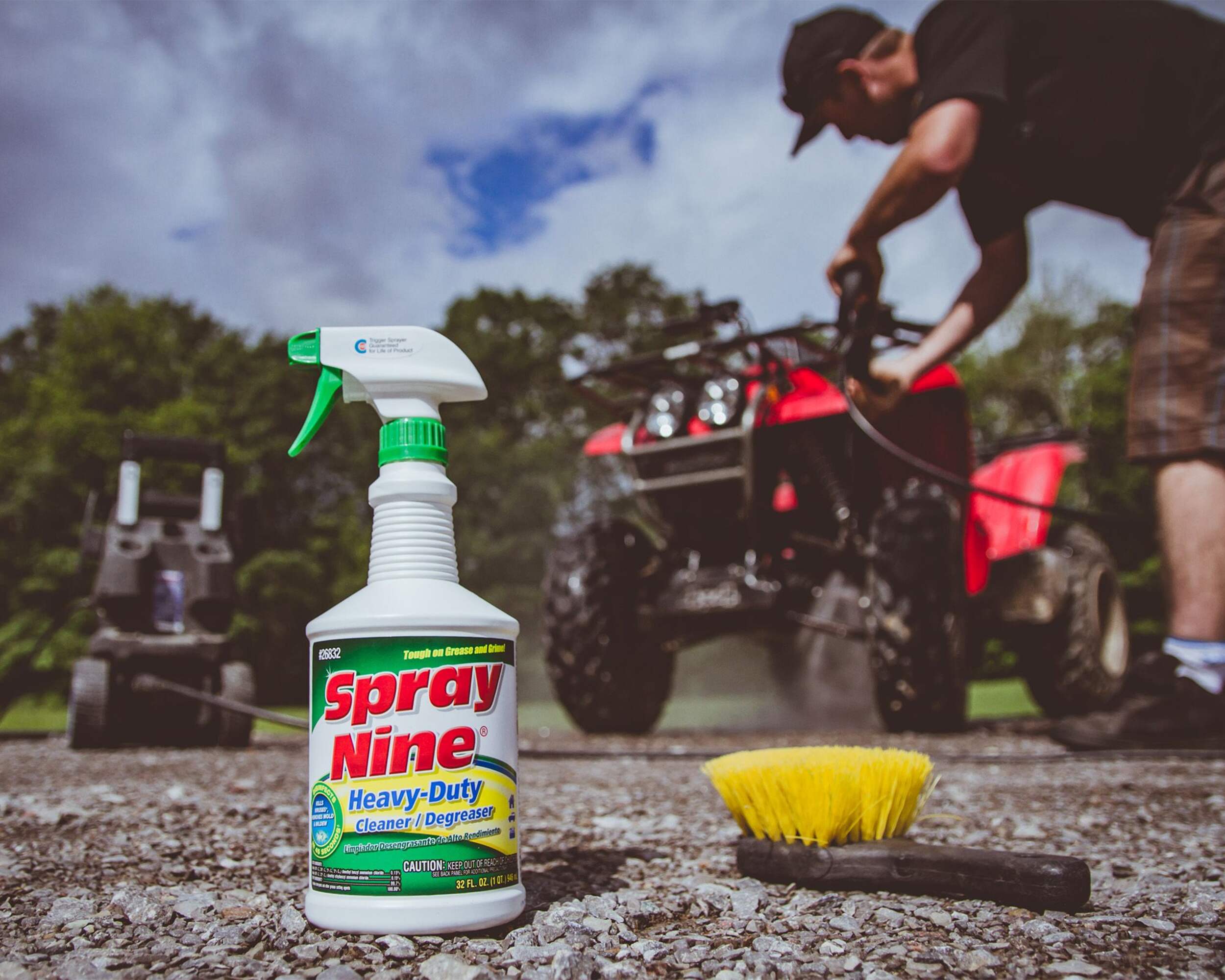 Spray Nine’s Heavy-Duty Cleaning, Degreasing and Disinfecting action tackles the toughest grease, grime, stains and bacteria. Spray Nine’s “Triple Threat” formula delivers professional strength performance, all without the use of bleach or corrosive chemicals.