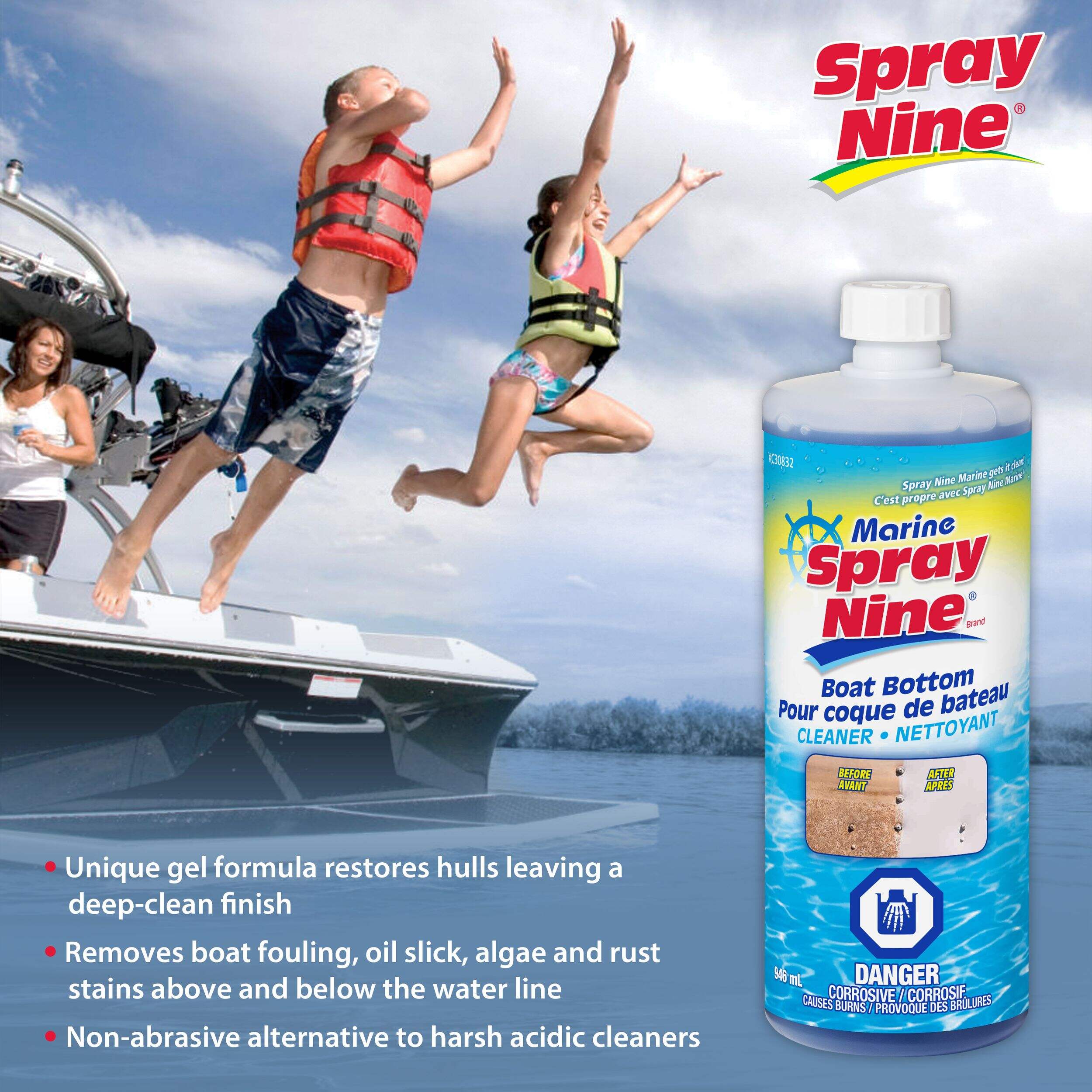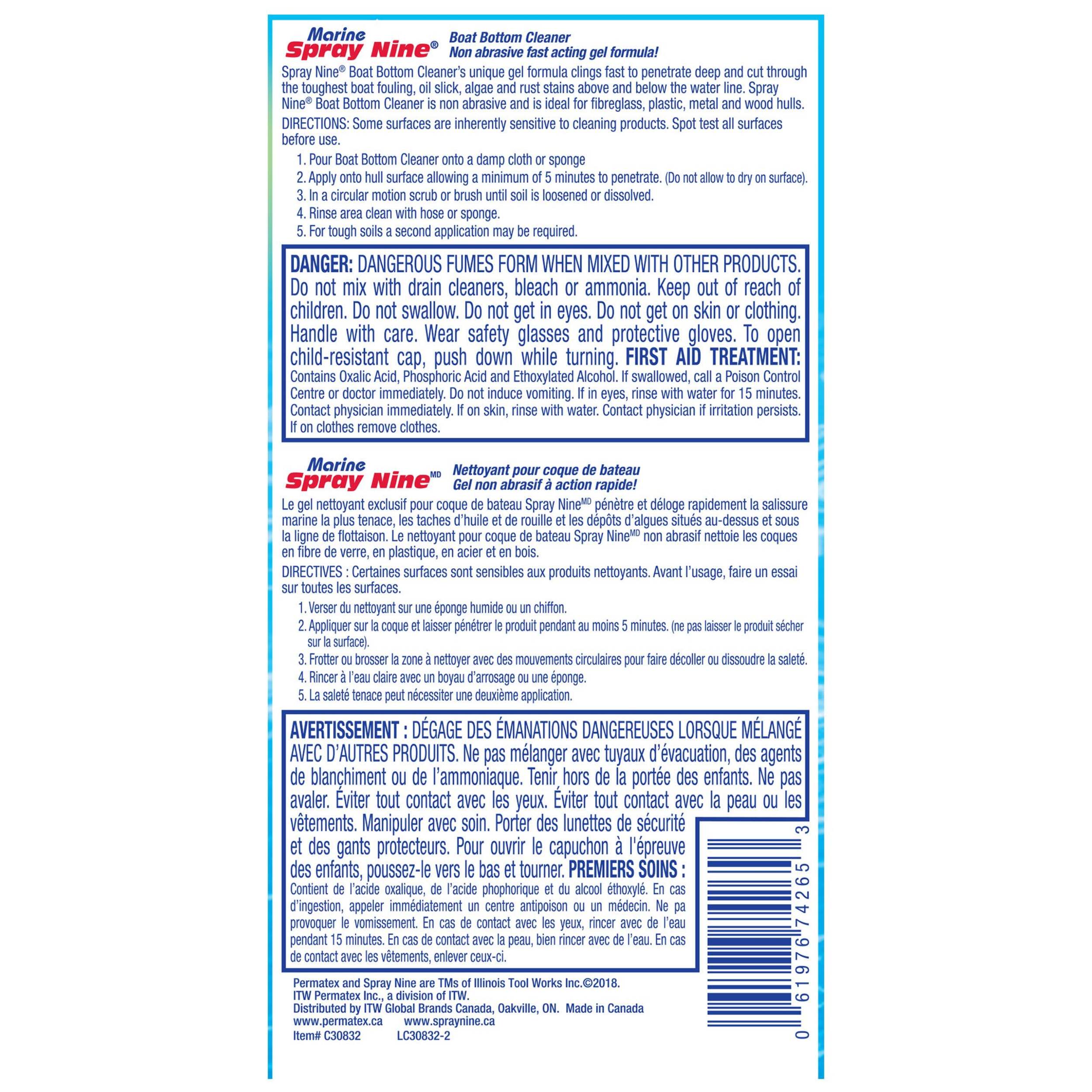 For those that know a clean boat bottom makes for smoother sailing, this Spray Nine® Marine Boat Bottom Cleaner is a must-have for your marine arsenal. Featuring an innovative gel formula, this boat bottom cleaner clings to vertical surfaces and cuts through tough algae, slime, and rust stains above and below the water line to keep your watercraft gliding smoothly through water. This boat cleaner also help restore hulls, leaving a deep glossy finish.