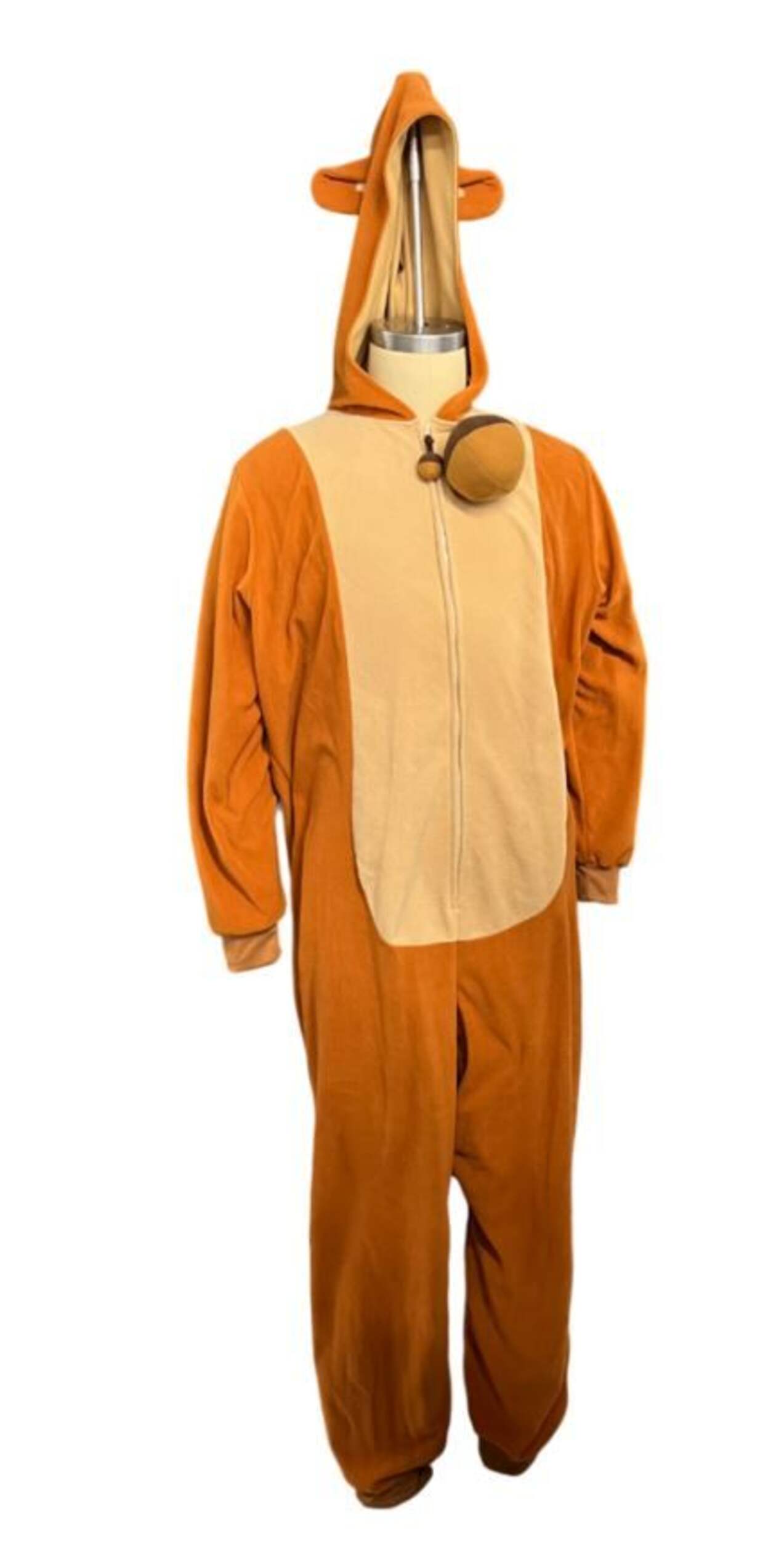 This costume includes a brown onesie featuring a hood with squirrel ears, a light tan belly patch, and a large, fluffy tail attached to the back