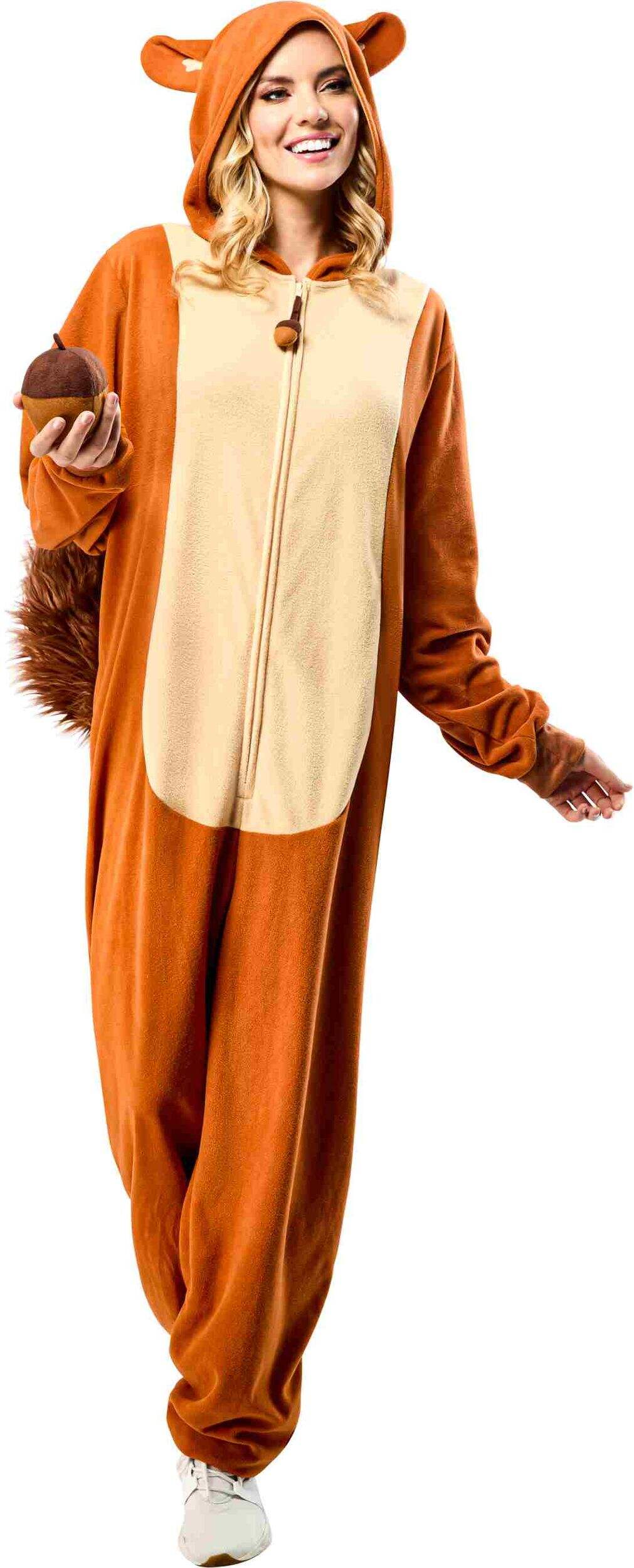 Transform into a playful squirrel with this charming zip-up onesie costume. Perfect for Halloween or any costume party, this outfit features a hood with cute squirrel ears and a fluffy tail, ensuring you stand out in the crowd. Available in multiple sizes, it offers a comfortable fit for everyone.