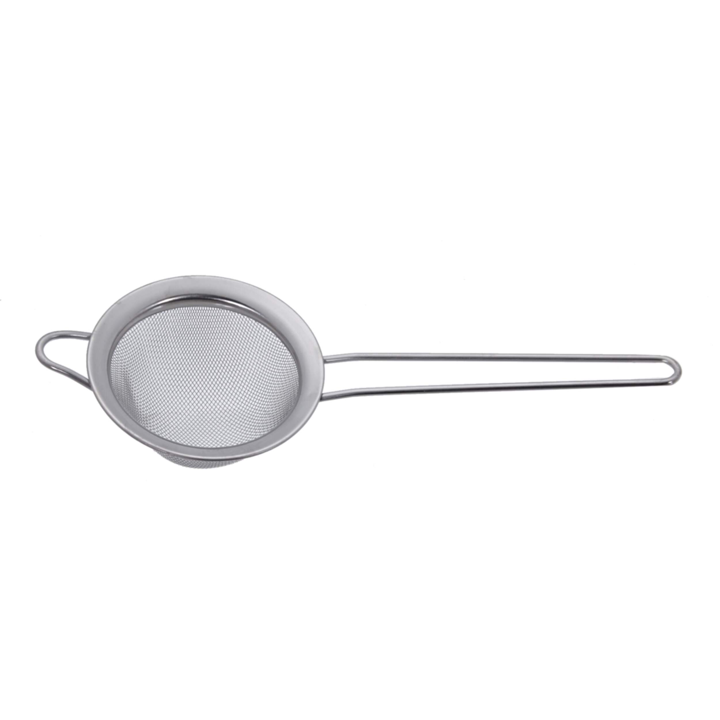 The Stainless Steel Long-Handle Strainer, 2-3/4-in, features durable stainless steel construction for extra longevity. Its fine mesh screen allows you to strain tea, stock, soups, and more. As a versatile kitchen tool, this tea strainer is a useful tool to separate solids, seeds, and little chunks of eatables from runny food items. Thanks to the small loop design, you can rest the mesh strainer on a pot or bowl. The metal strainer measures 2-3/4 inches (7 cm) in length and features a capacity of 0.08 quarts.