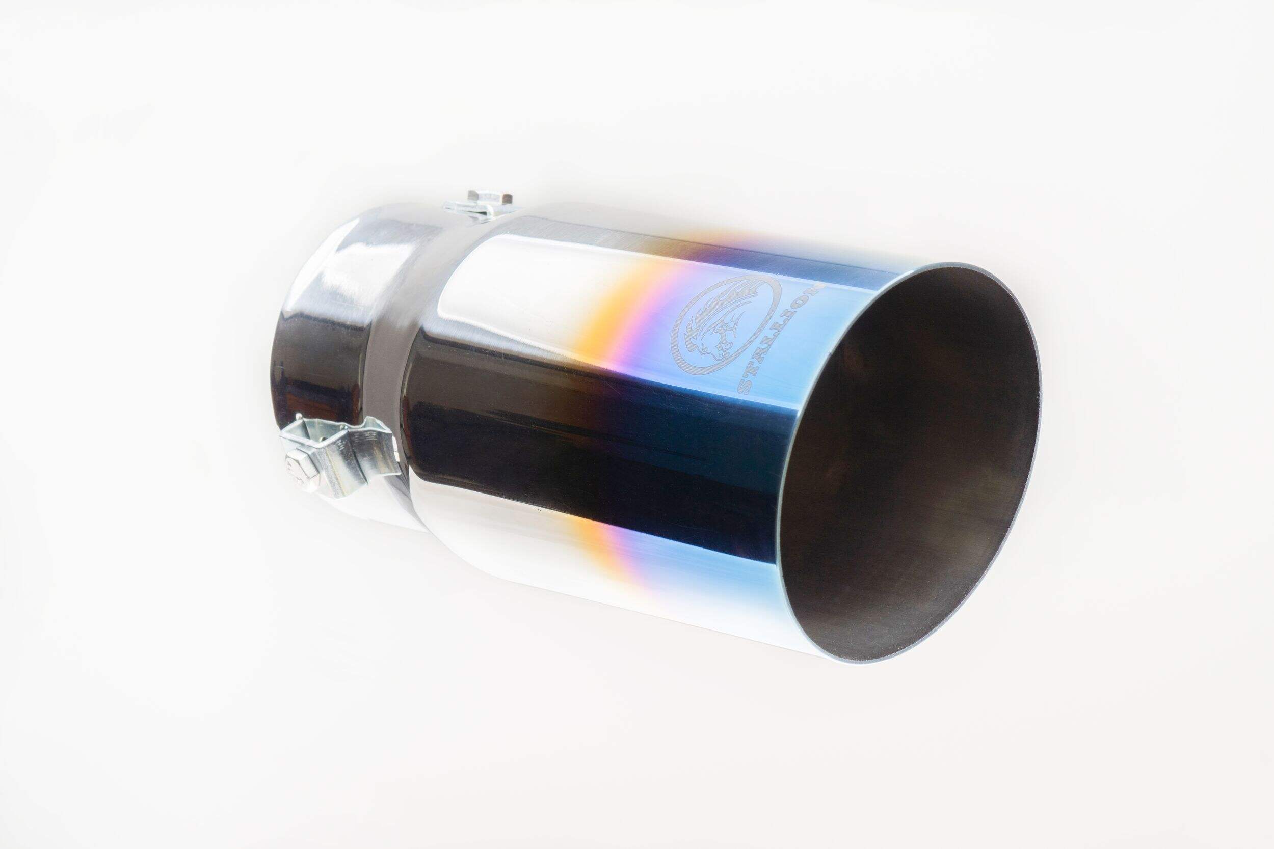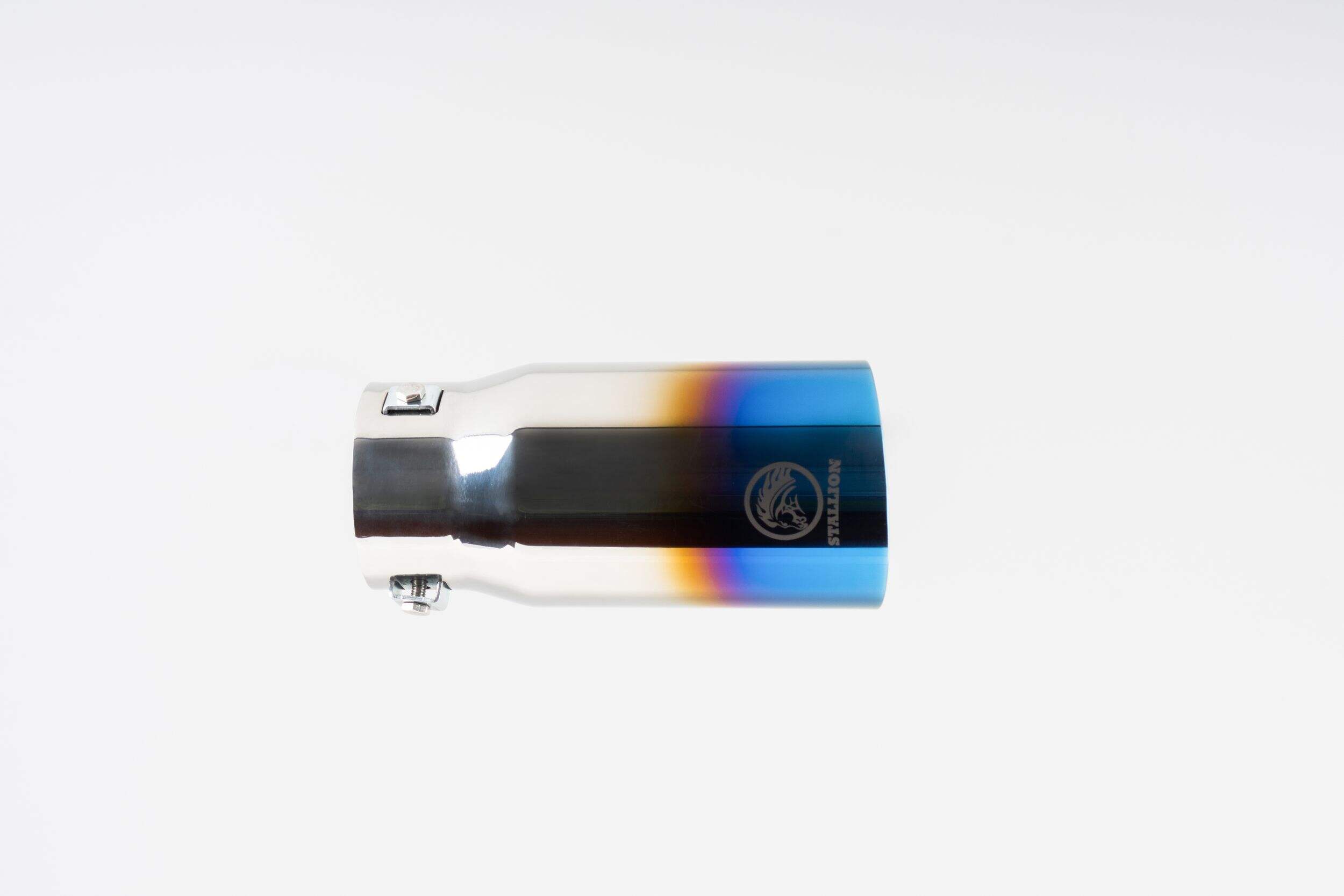 The Stallion Burnt Car Exhaust Tip adds a bold, visual feature to your ride for sporty emphasis and curb appeal. Constructed from durable stainless steel, it has a slanted cut design and a metallic burnt finish that resists corrosion and carbon buildup. The universal fit clamps securely while the wide outlet amplifies engine notes. Give your truck or muscle car a bold, custom look with this easy bolt-on exhaust extension.
