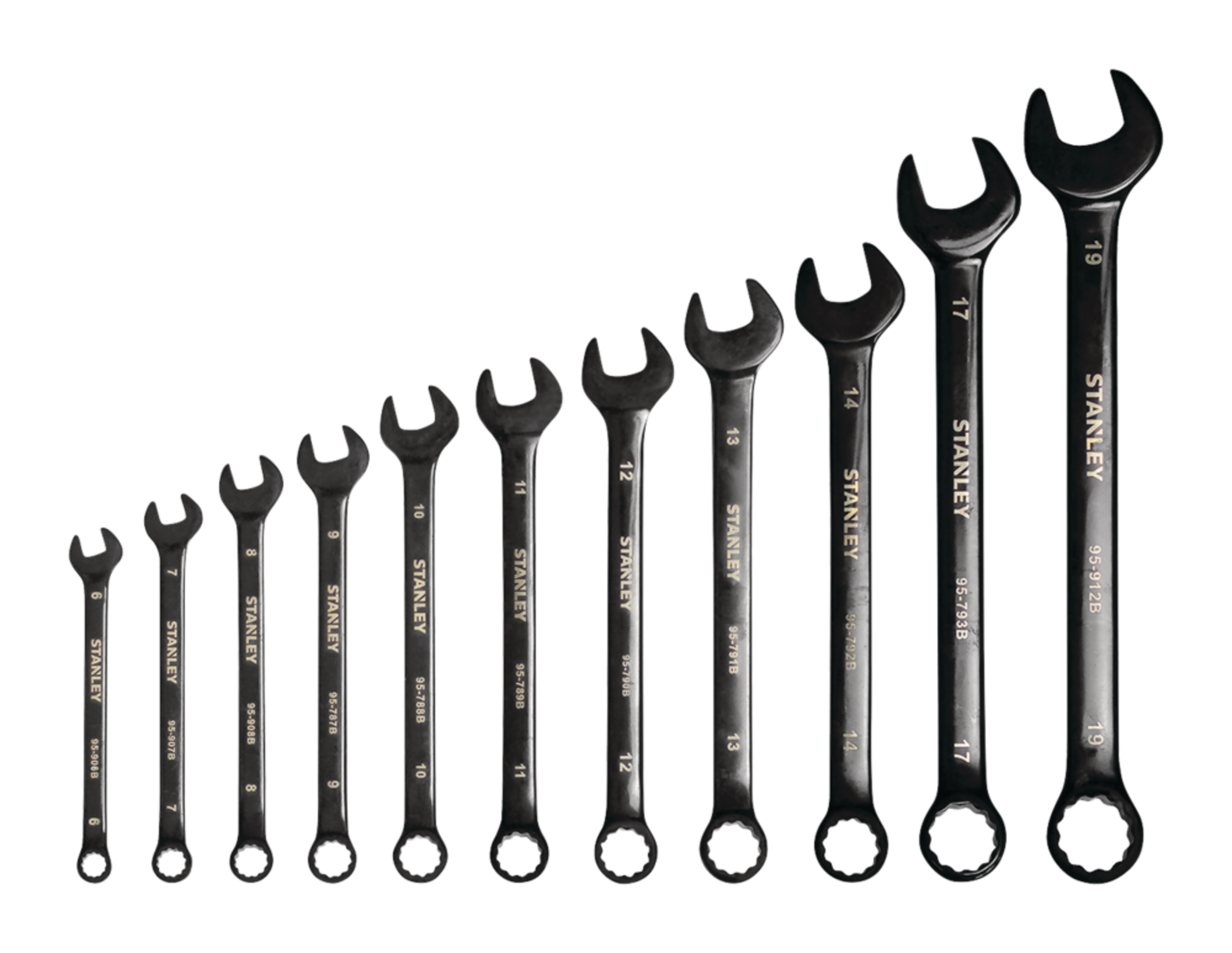 Stanley Black Chrome Wrench Set features durable black chrome plating for enhanced rust resistance
