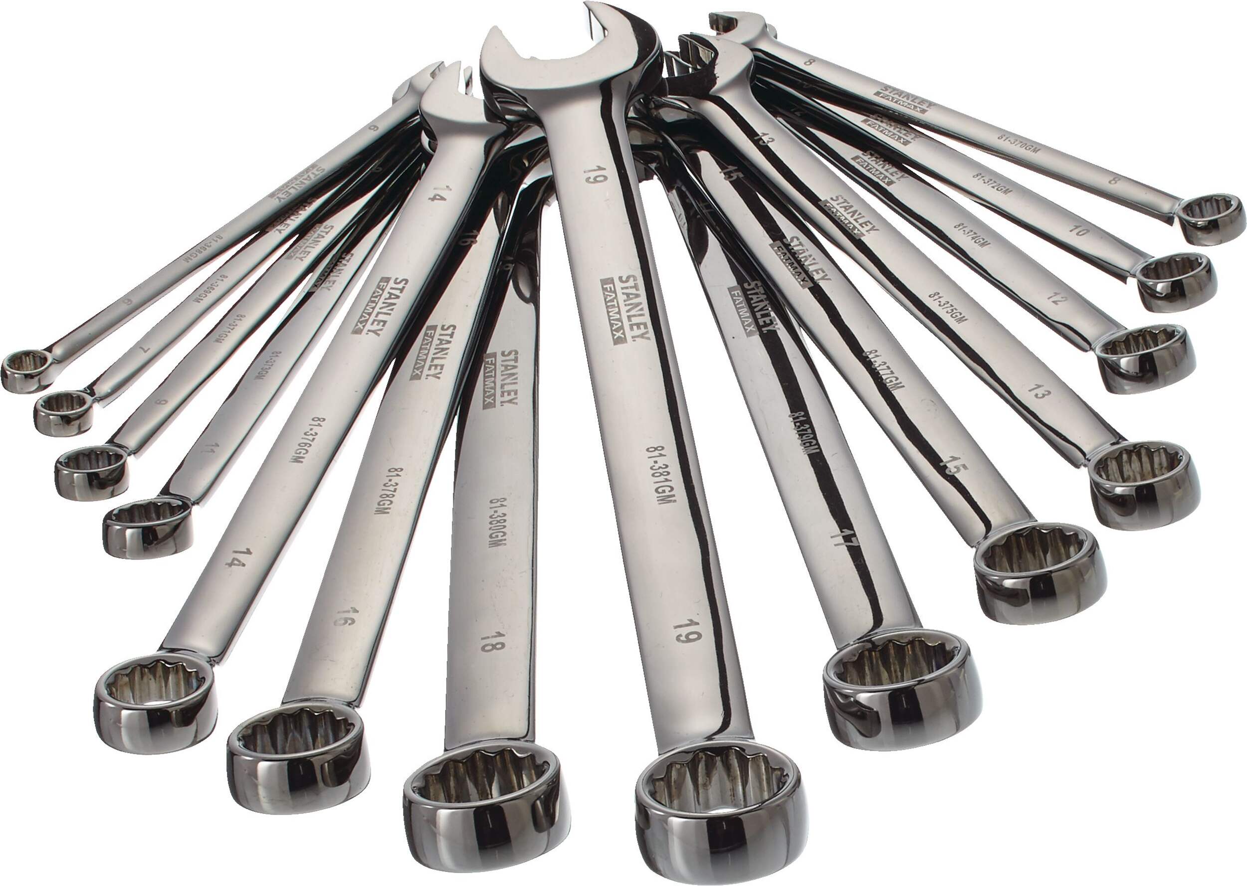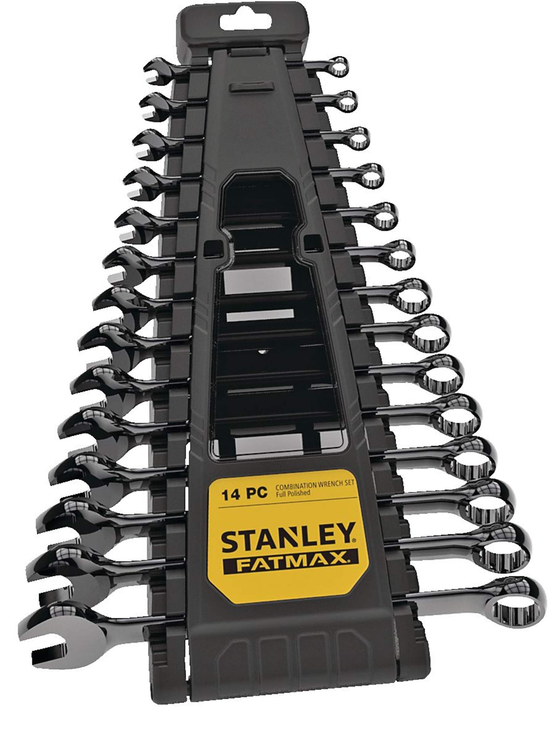 Stanley FATMAX® Gunmetal Chrome Wrench Set comes with 14 wrenches and a standing fold-up storage rack