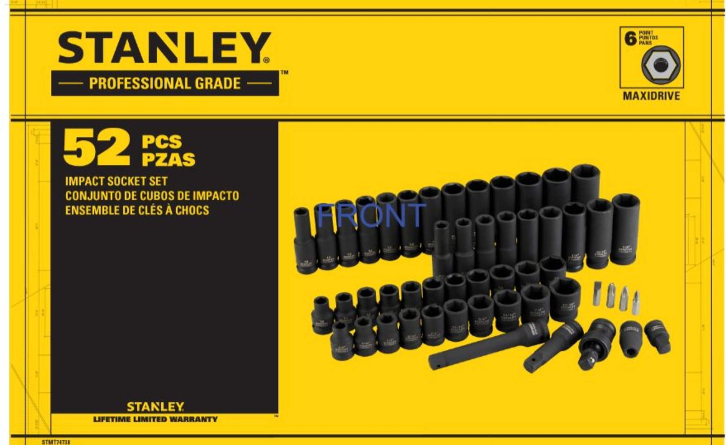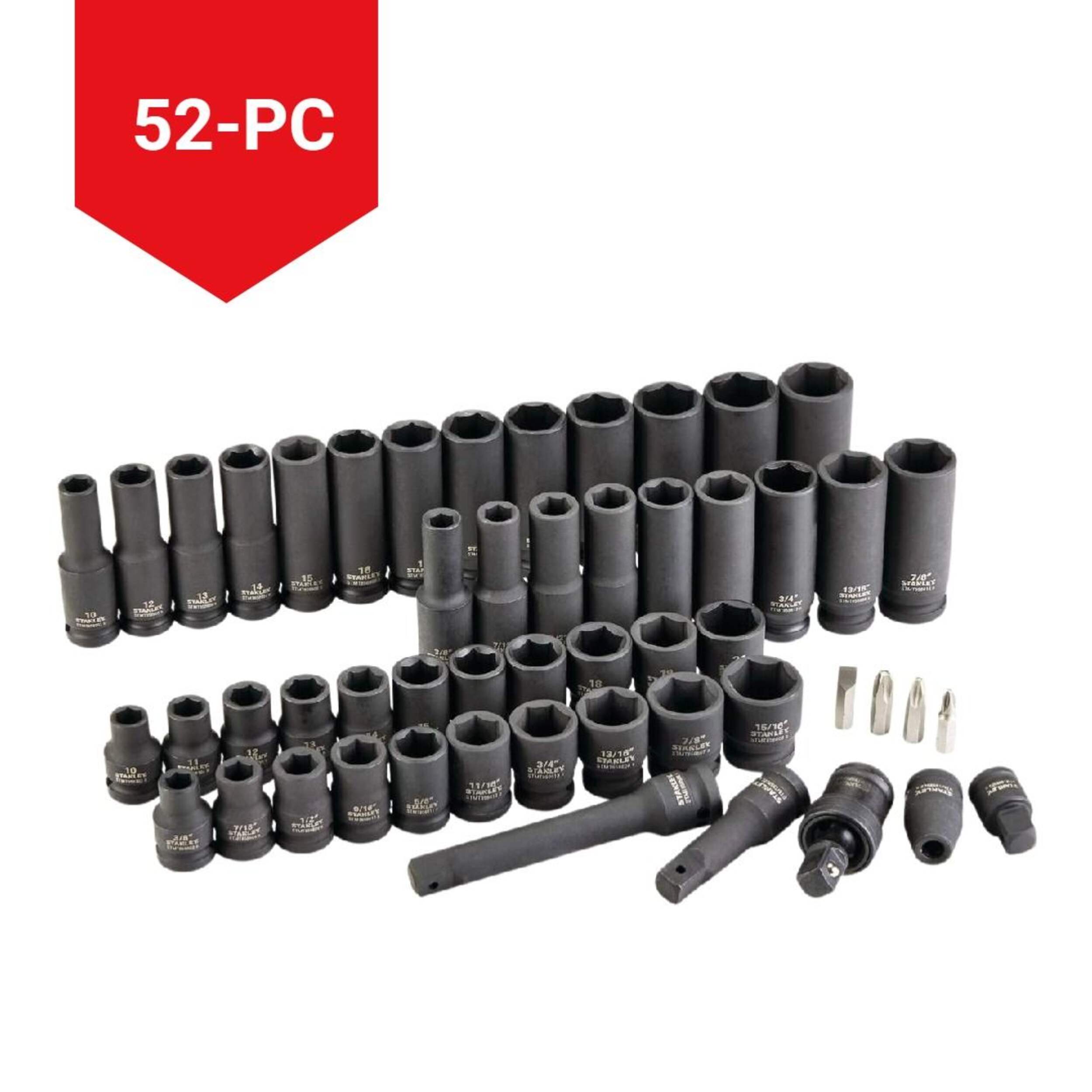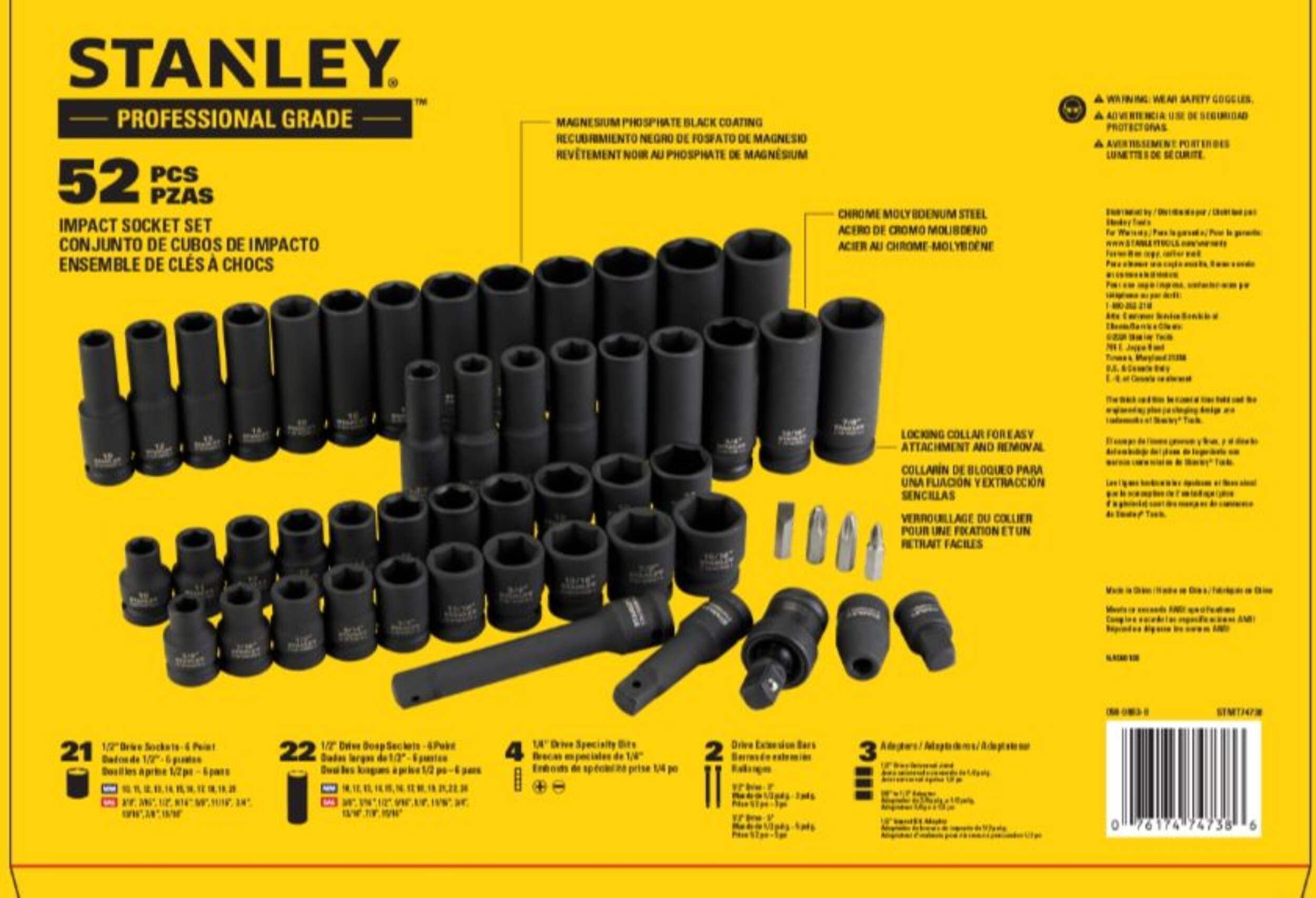 The Stanley Professional 1/2-in Impact Socket Set provides 52 pieces of professional quality impact sockets with a 1/2-in drive for tackling demanding tasks. Made with chrome molybdenum (Cr-Mo) alloy steel for durability, these sockets feature a magnesium phosphate coating for superior corrosion resistance.