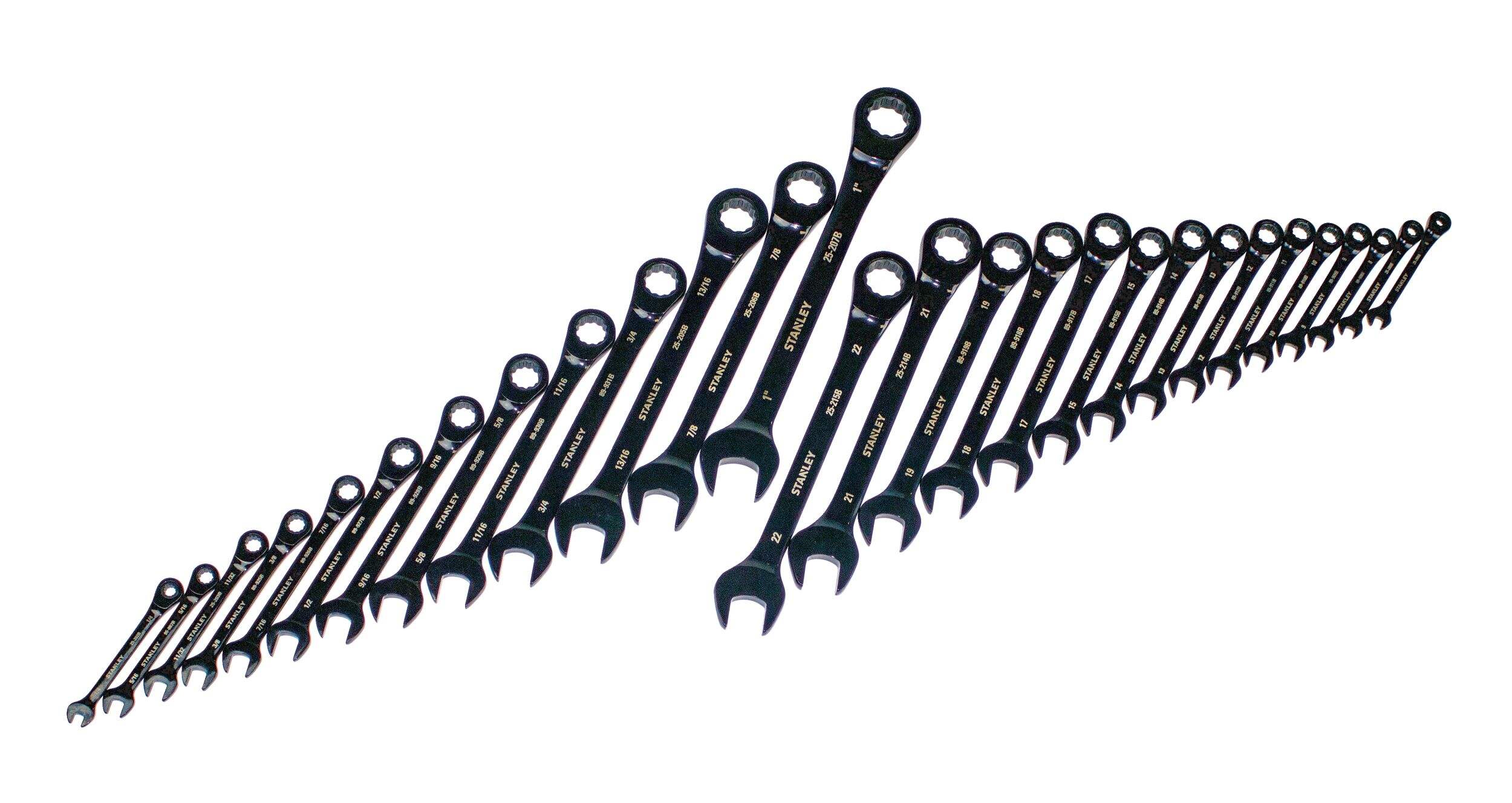 28-piece set includes: MM: 6, 7, 8, 9, 10, 11, 12, 13, 14, 15, 17, 18, 19, 21, 22mm SAE: 1/4", 5/16", 11/32", 3/8", 7/16", 1/2", 9/16", 5/8", 11/16", 3/4", 13/16", 7/8", 1"
